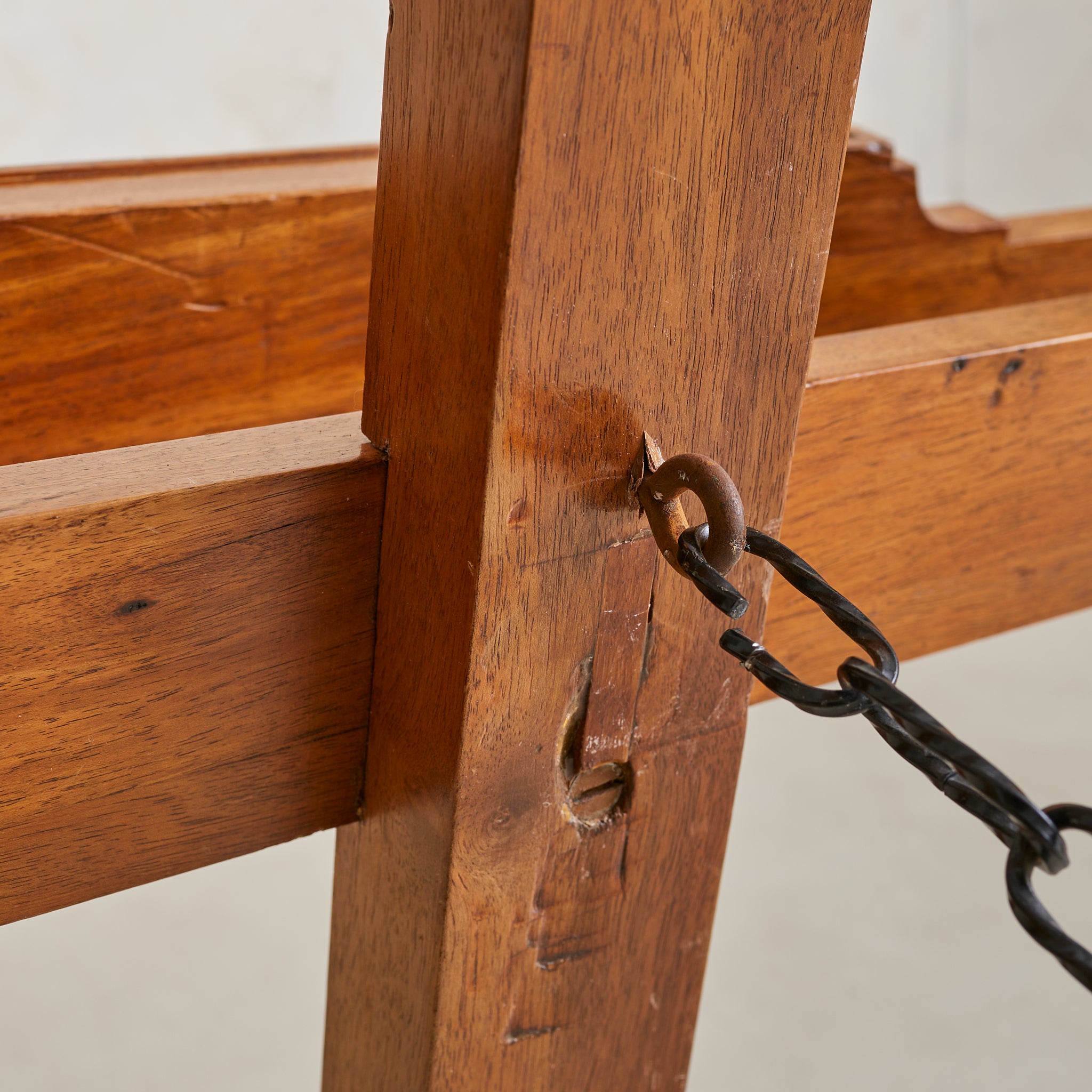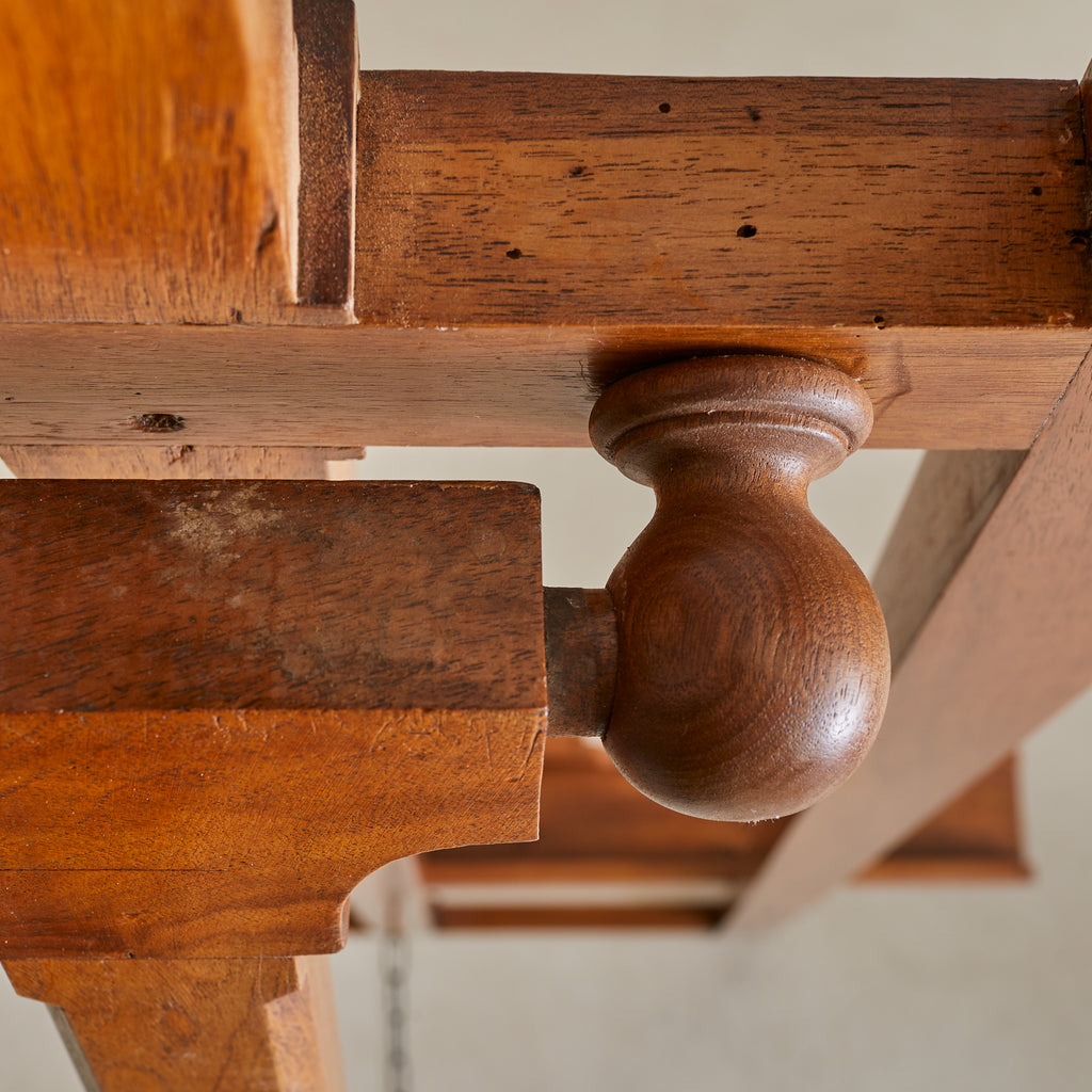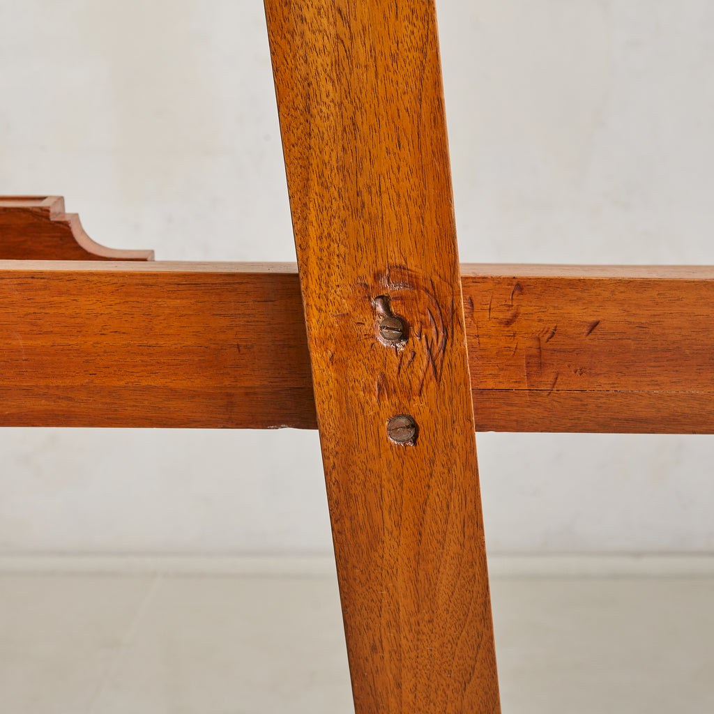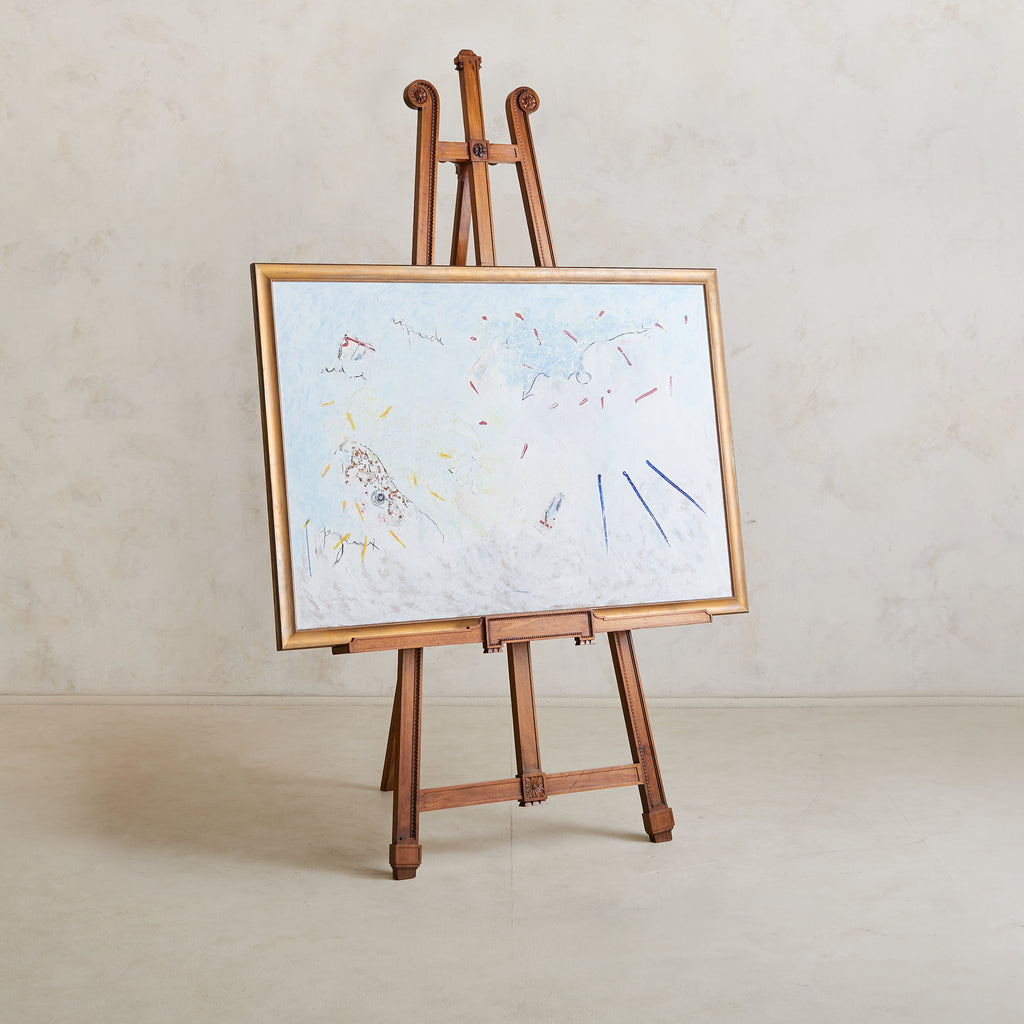 A monumental antique French easel, hand-carved circa 1910. Standing over eight feet tall, the frame features classical scroll motifs, botanical details, and a refined, architectural stance. Constructed of solid wood with a rich patina, its proportions and craftsmanship speak to the grandeur of early 20th-century ateliers. Adjustable via a brass chain support, the easel is functional and sculptural in equal measure.