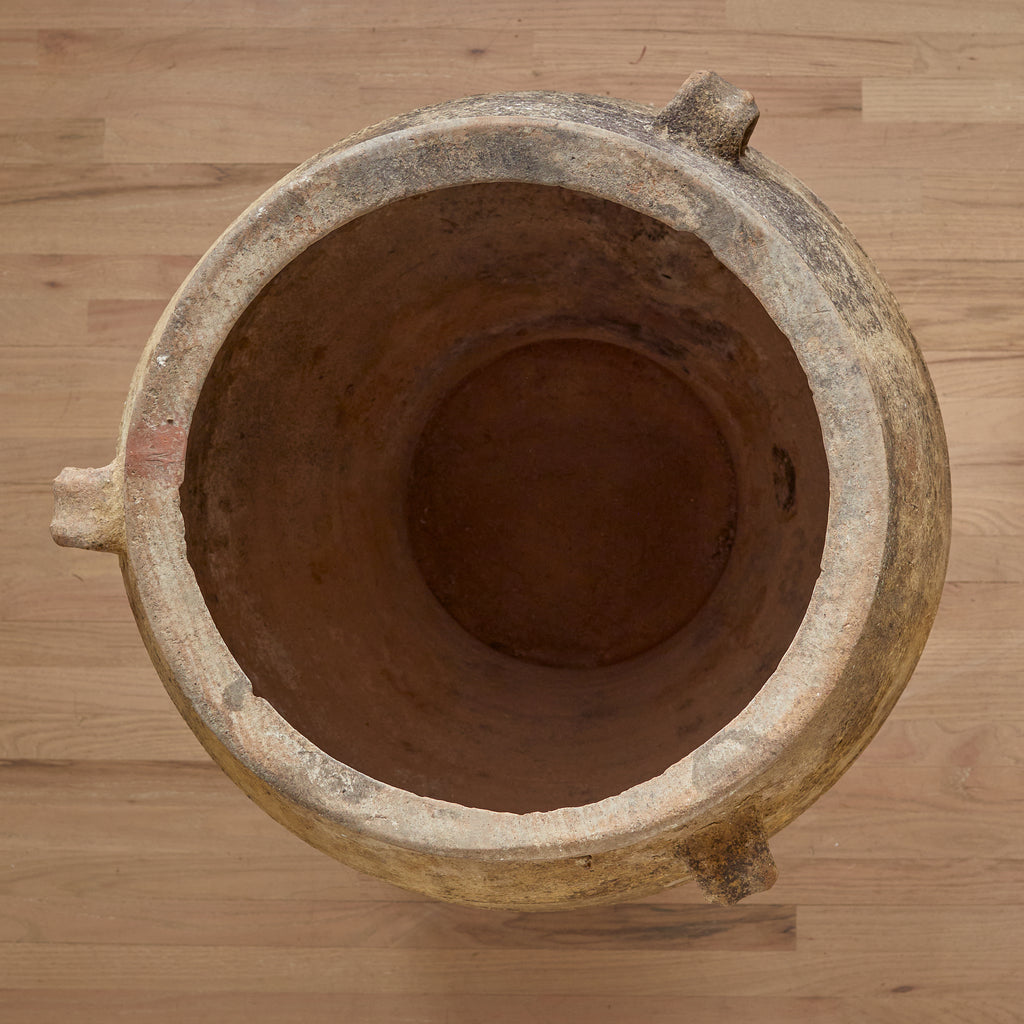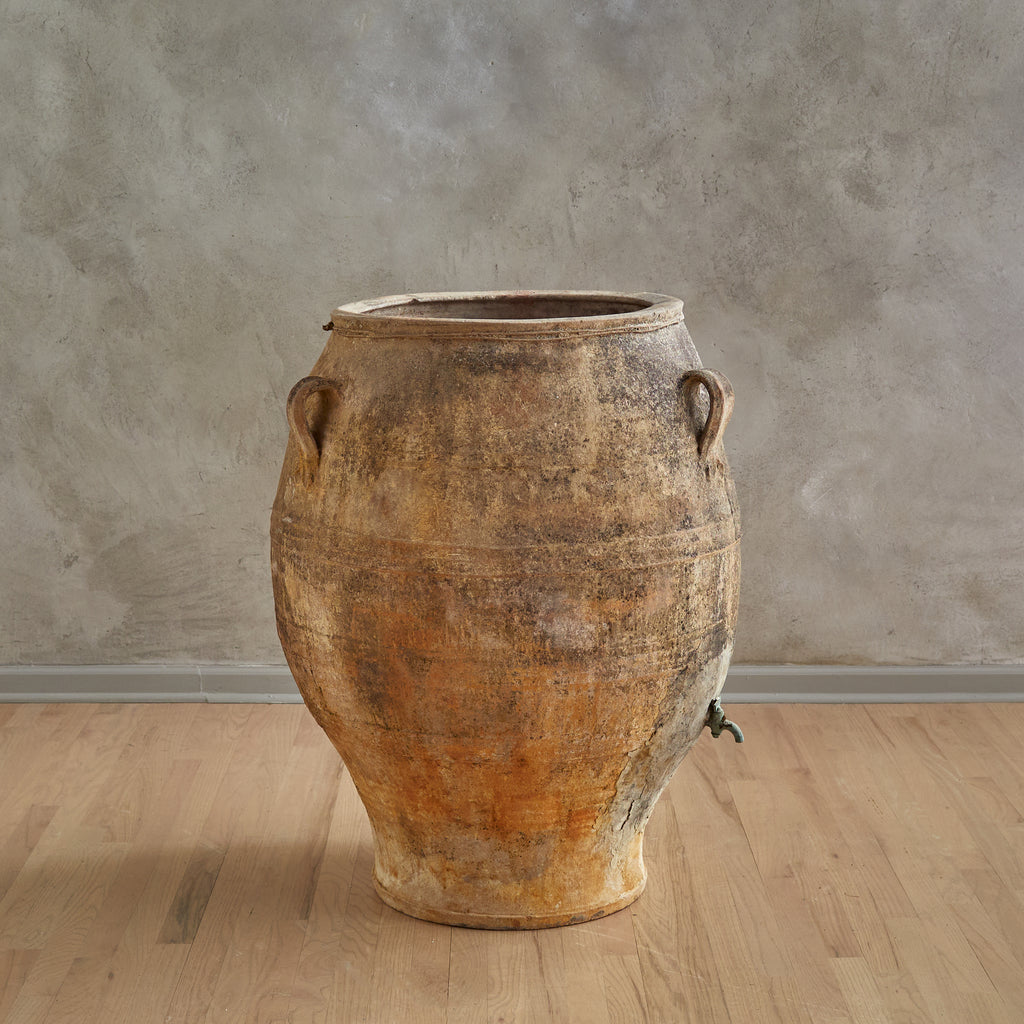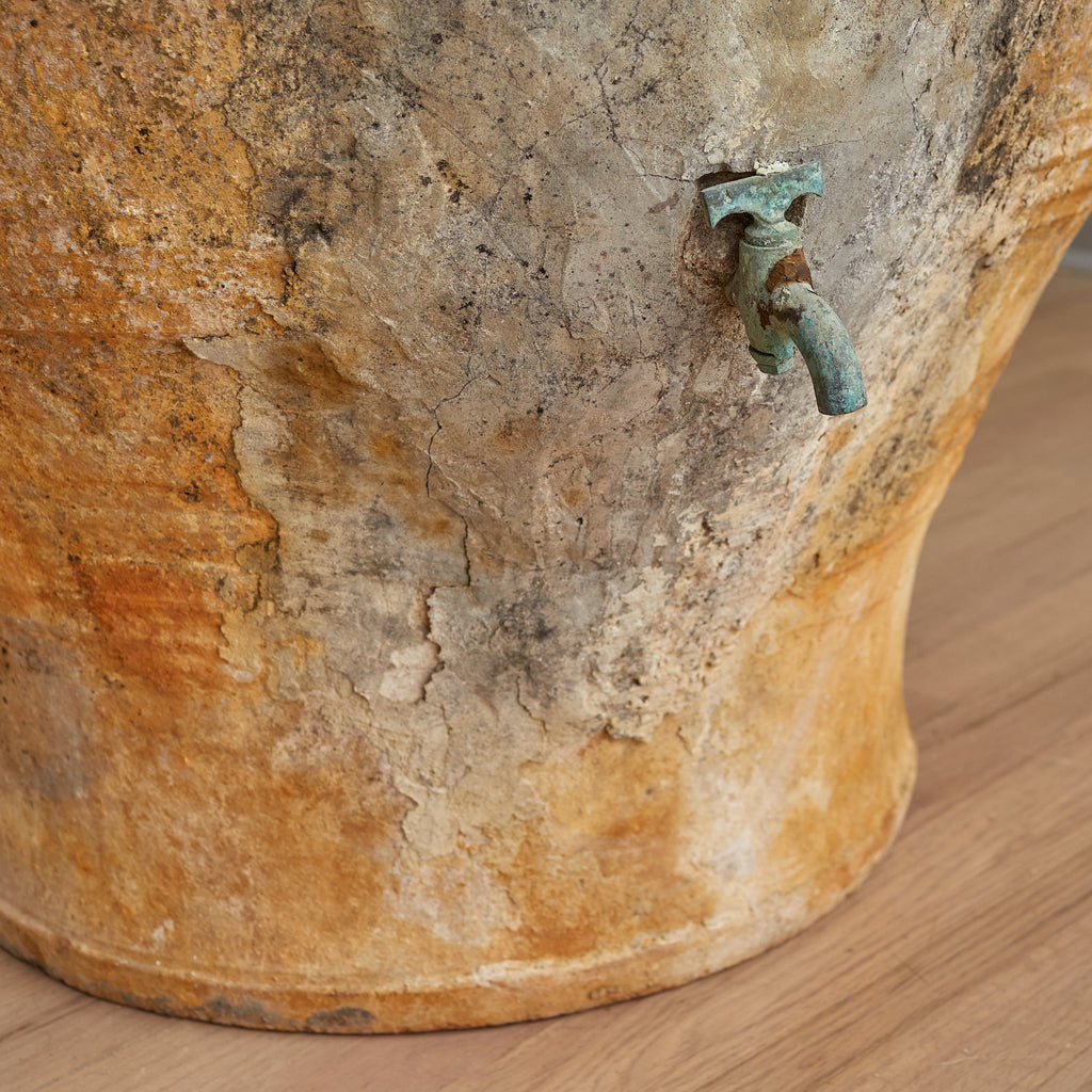 A monumental antique Turkish Olive Jar featuring layers of beautiful patina and age, reflective of its time spent as a utilitarian vessel for the storage of olive oil and olives in the Mediterranean. This can be used indoors or outdoors and brings an amazing sense of history + earth with it. Patina can range from mostly white wash to mossy.