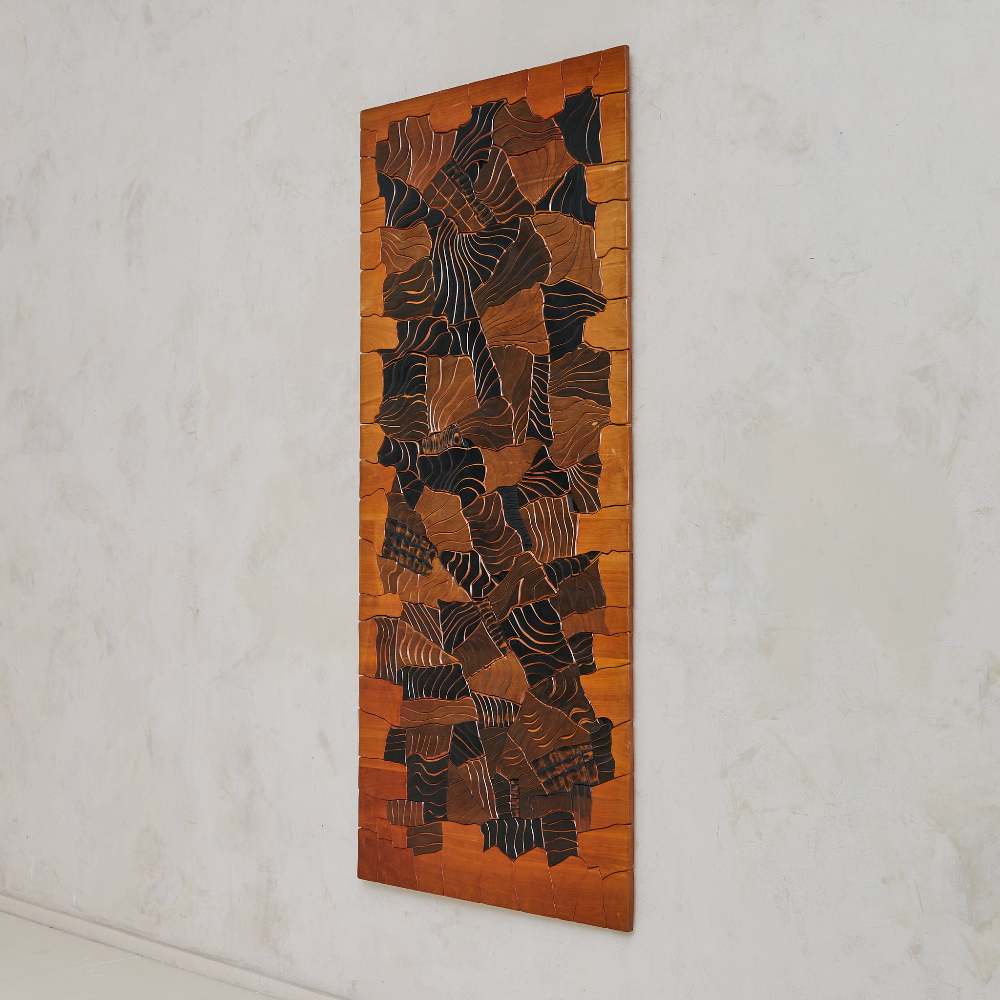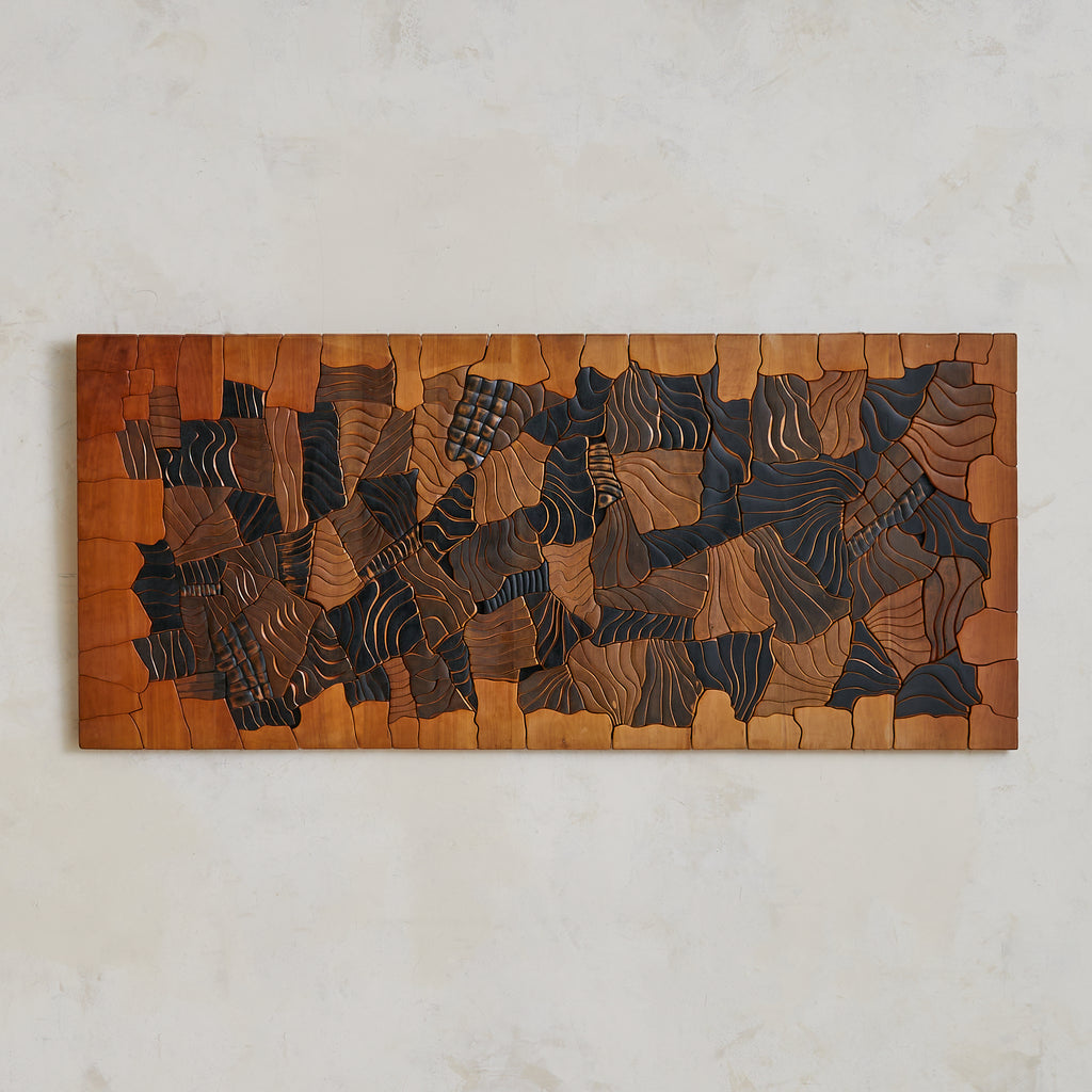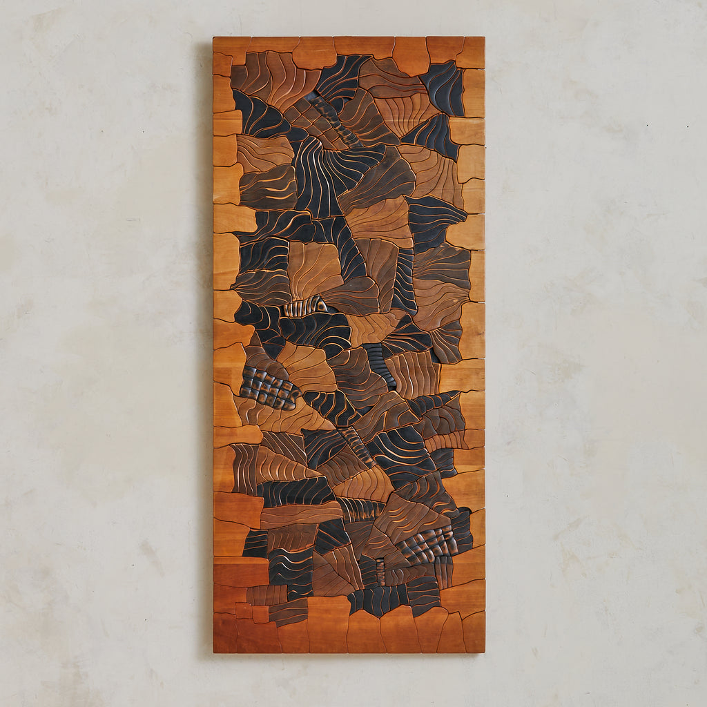 A monumental wall sculpture by Lucien Bénière, carved from an array of richly toned woods and standing over five feet in height. The surface forms a rhythmic collage of planes and textures—each segment individually articulated, yet unified in a quiet, meditative composition. Organic curves meet sharp delineations, inviting contemplation not only of form, but of the living history embedded in grain and gesture.