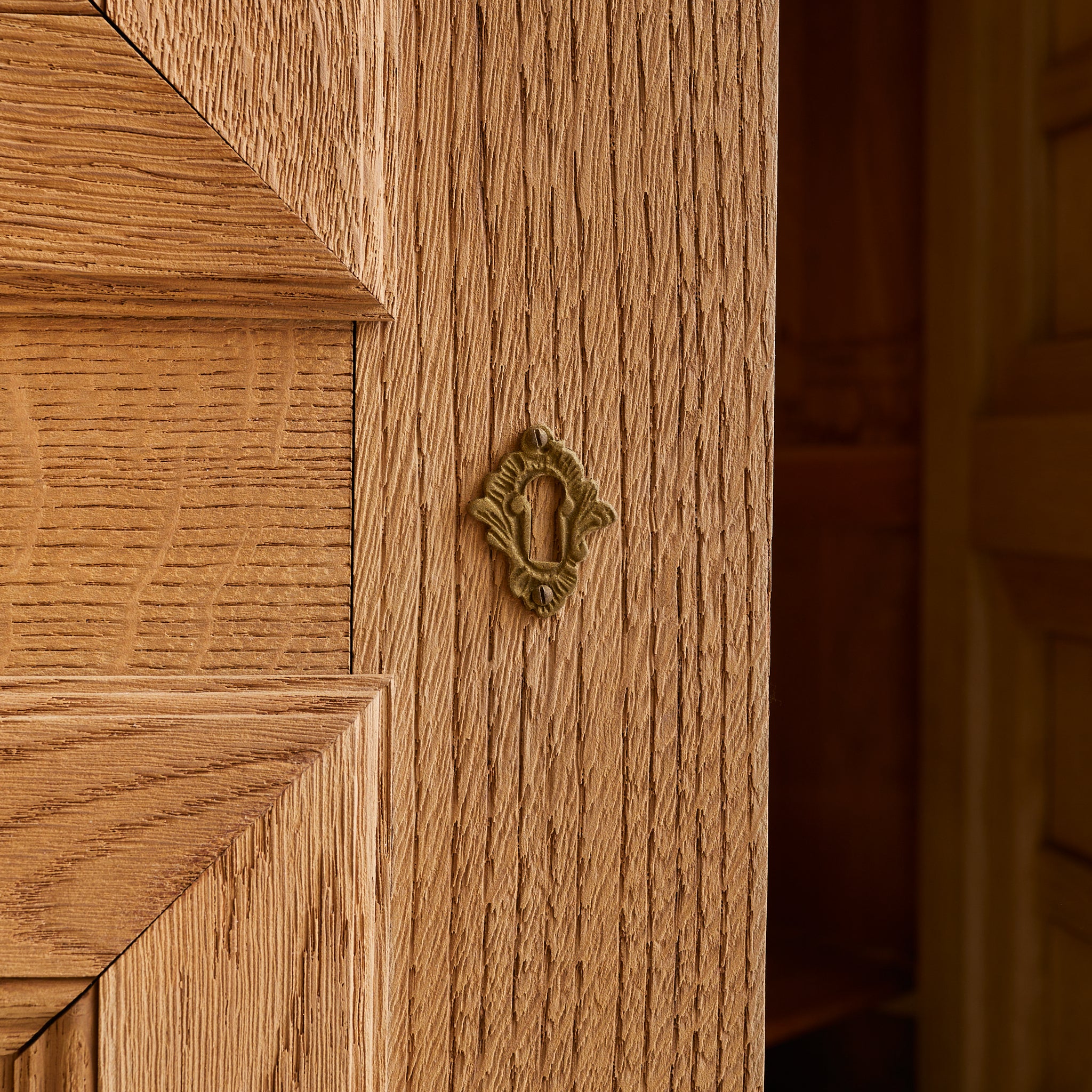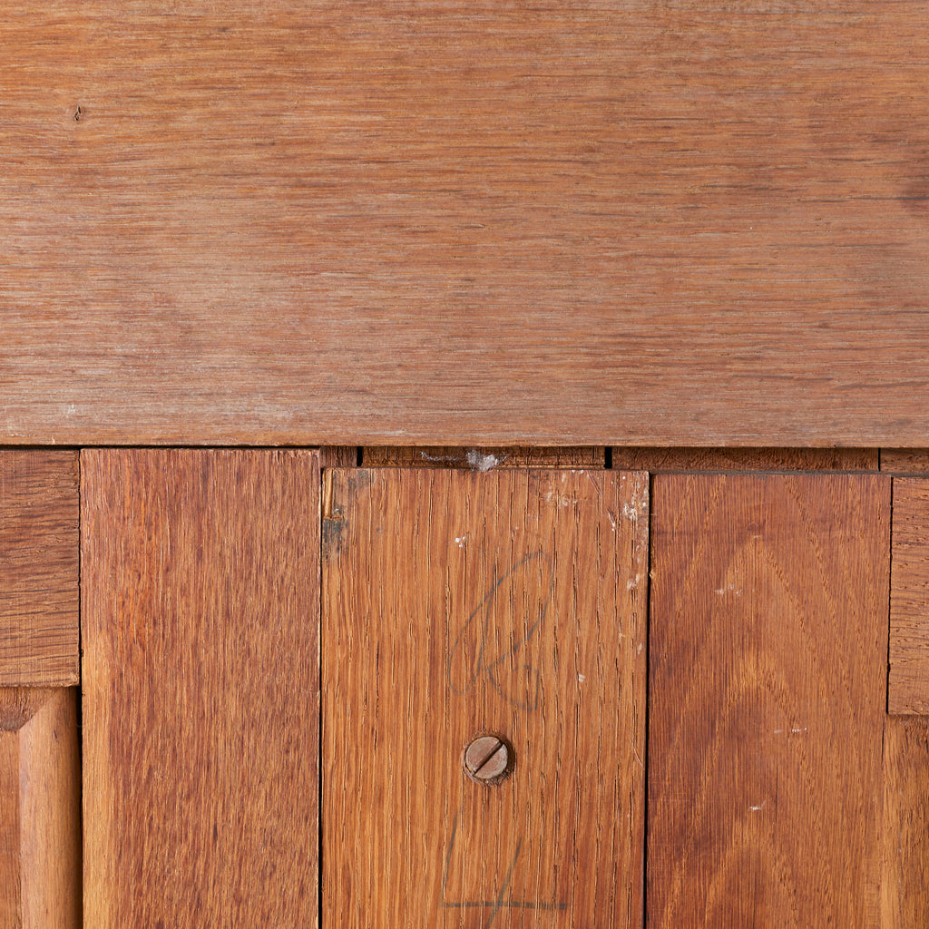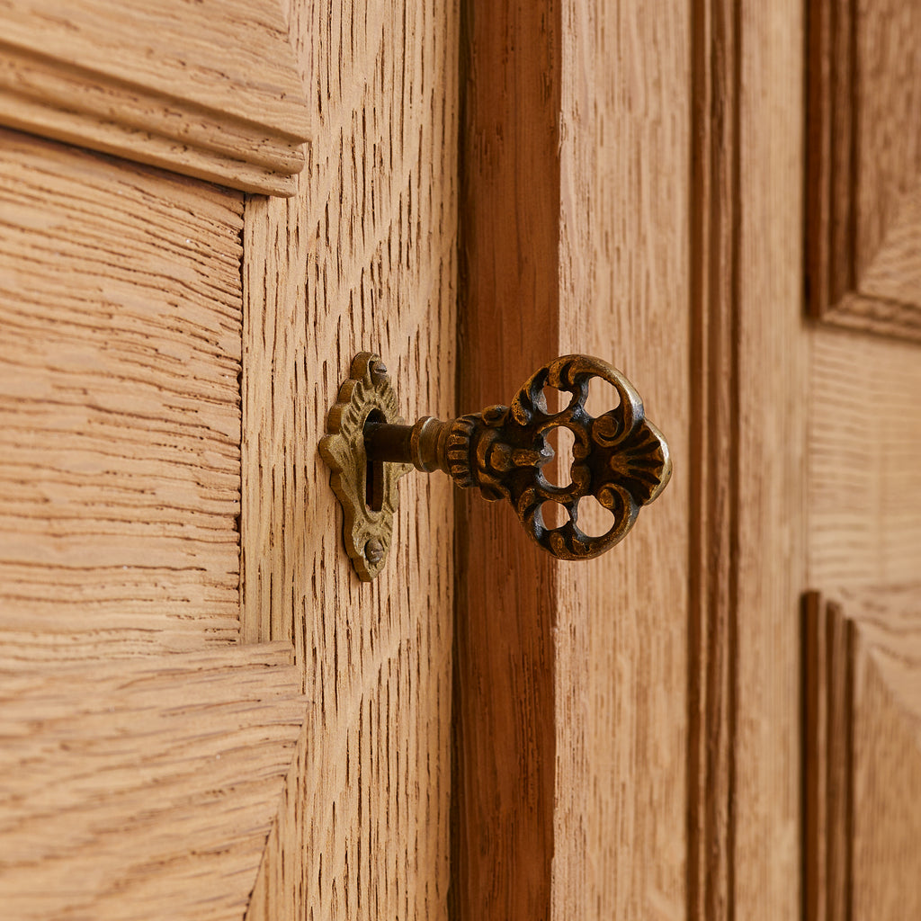 Each door opens to reveal interior shelving and includes its original brass key—two in total. Standing on five block legs, the piece is subtly elevated, lightening its visual weight.