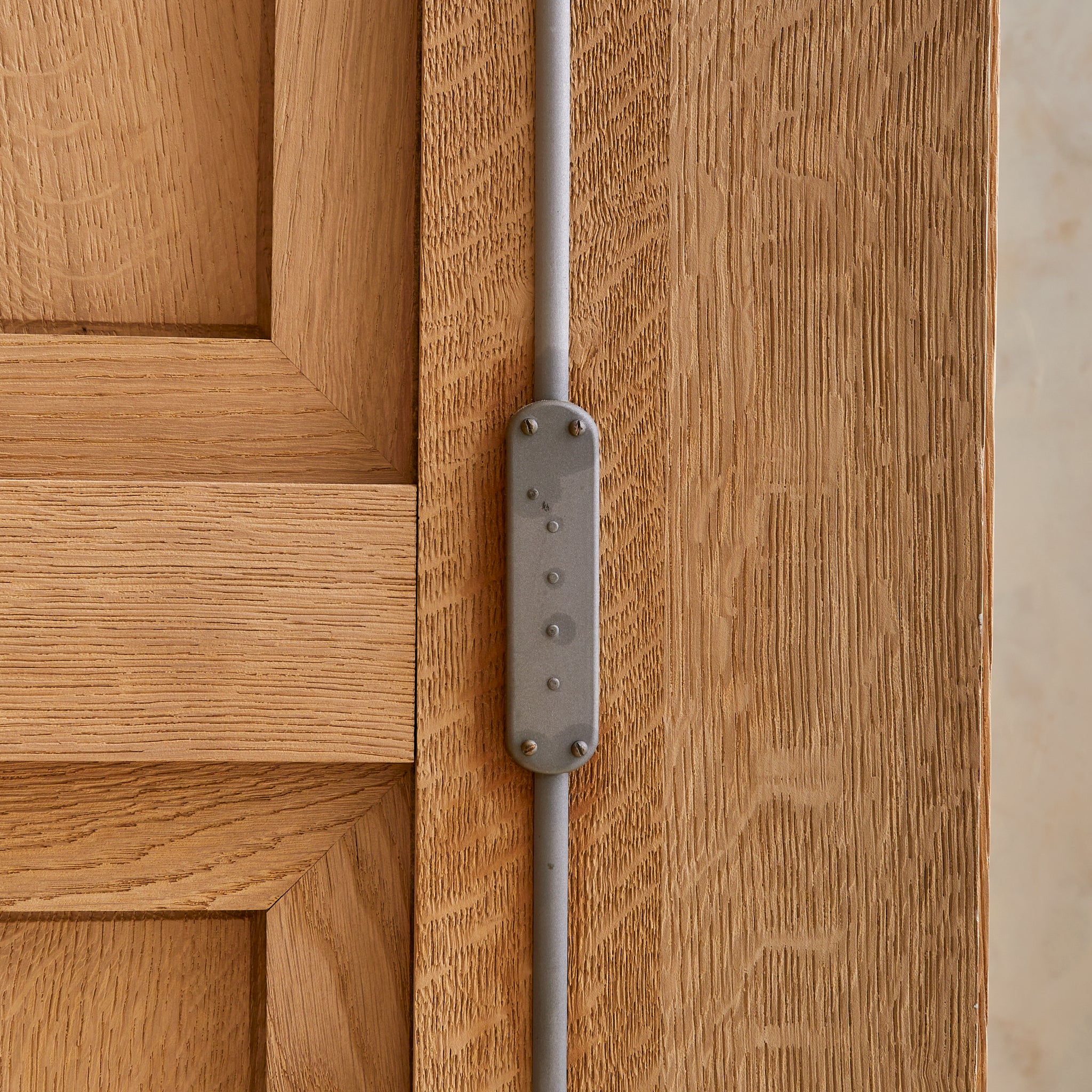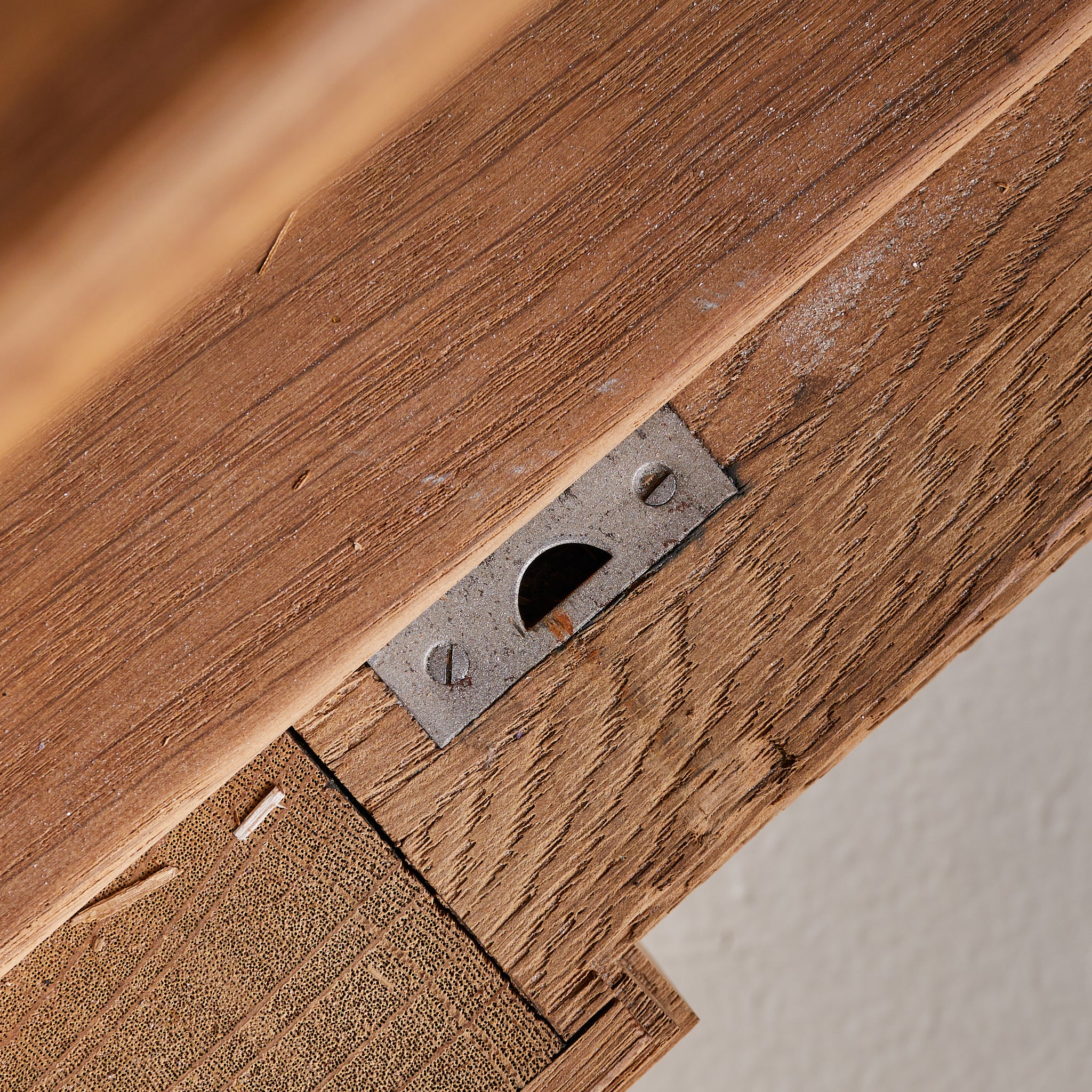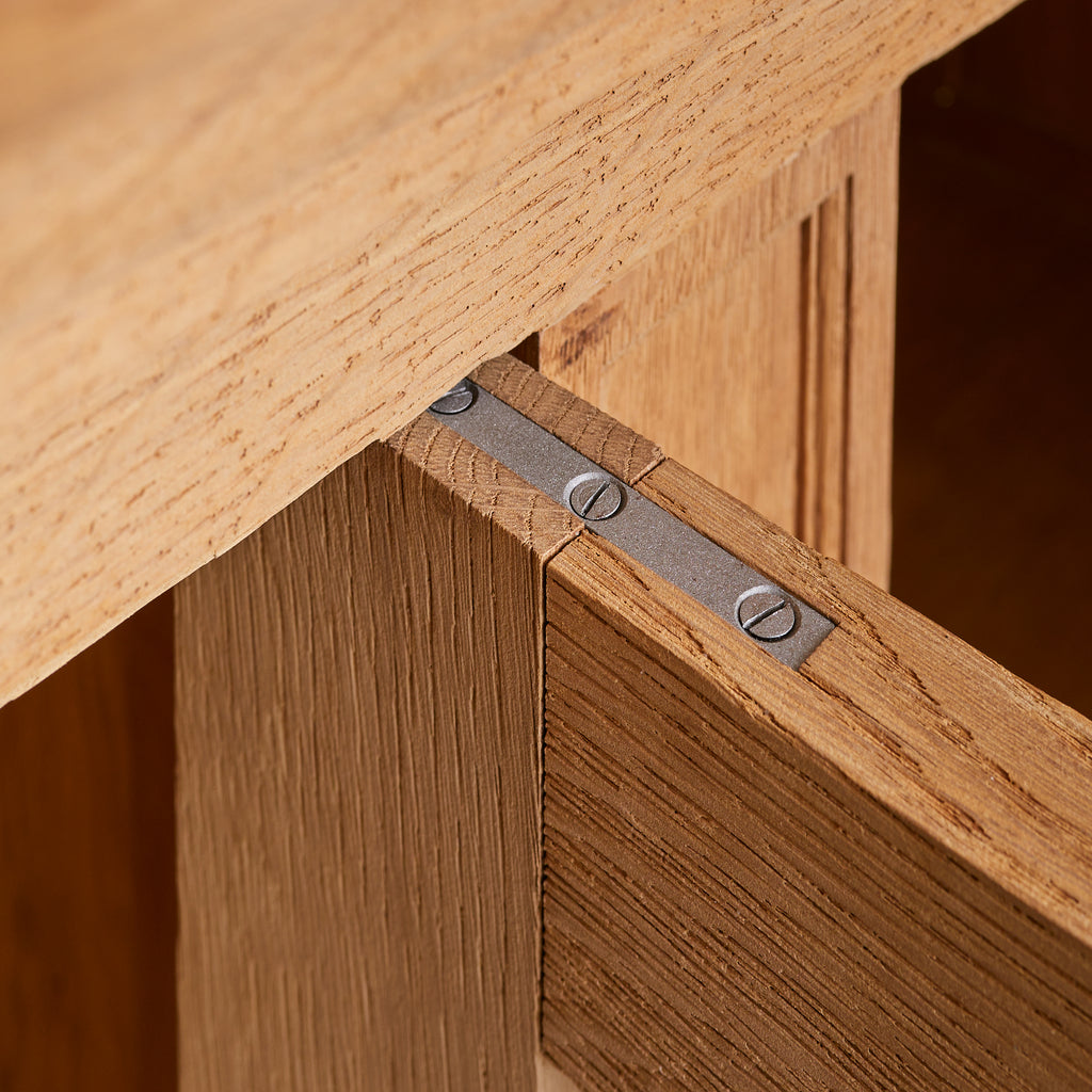 Each door opens to reveal interior shelving and includes its original brass key—two in total. Standing on five block legs, the piece is subtly elevated, lightening its visual weight.