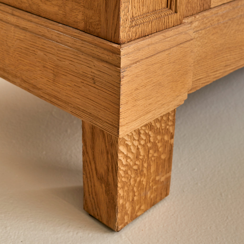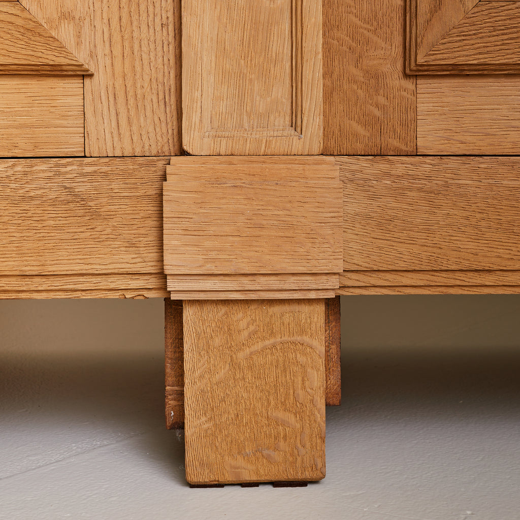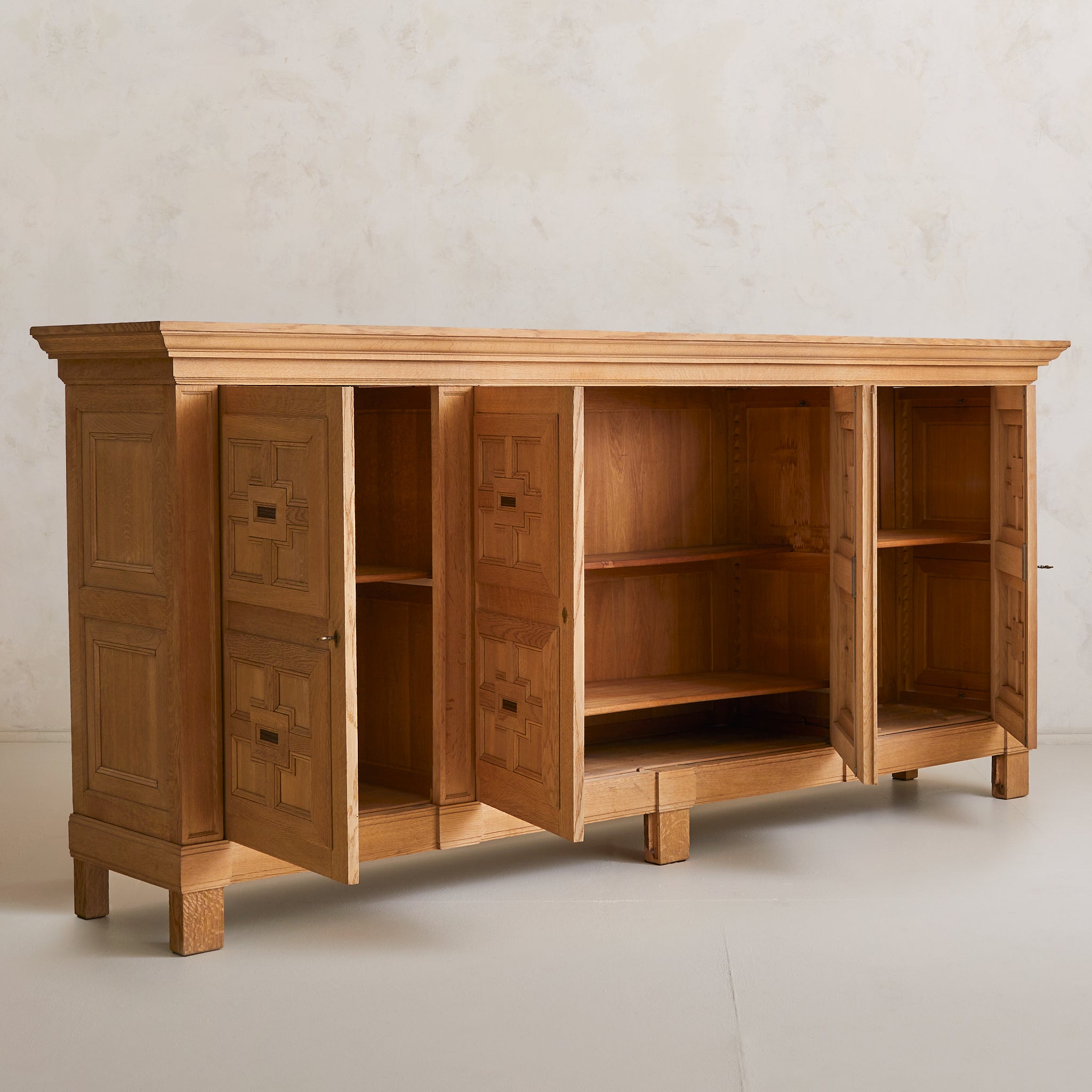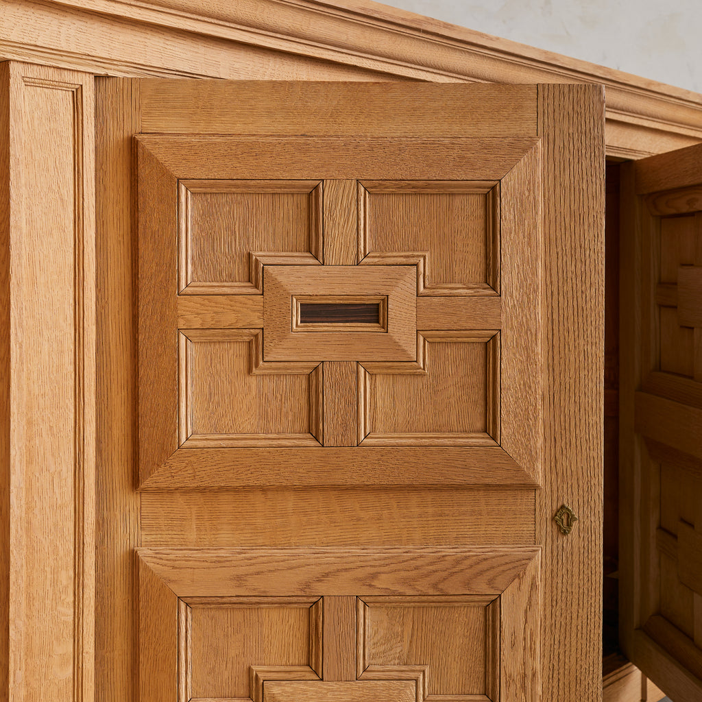 Crafted in Spain during the 1940s, this 10-foot-wide cabinet is a masterclass in craftsmanship, commanding attention with its monumental scale and richly detailed façade. Exemplifying the artisanal woodwork traditions of the period, it is made from solid sandblasted oak, with four heavily paneled doors featuring an intricate geometric relief.
