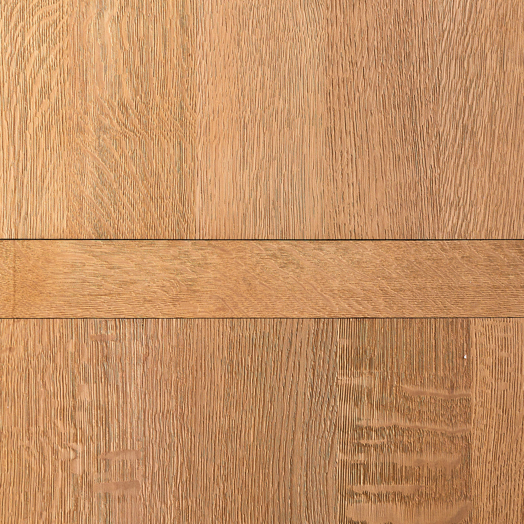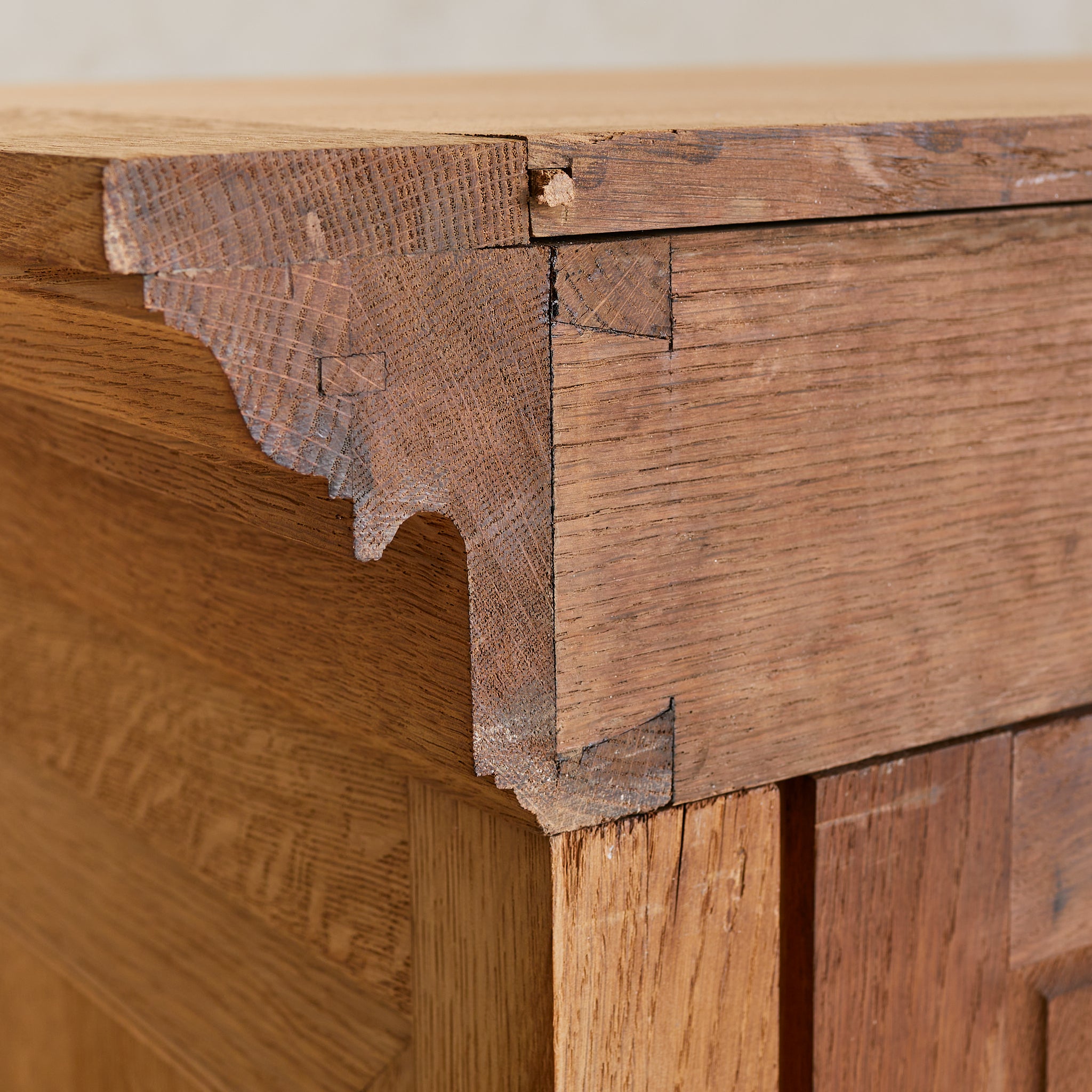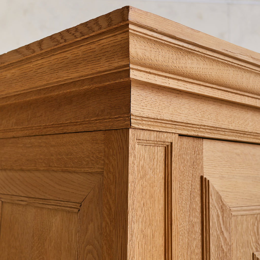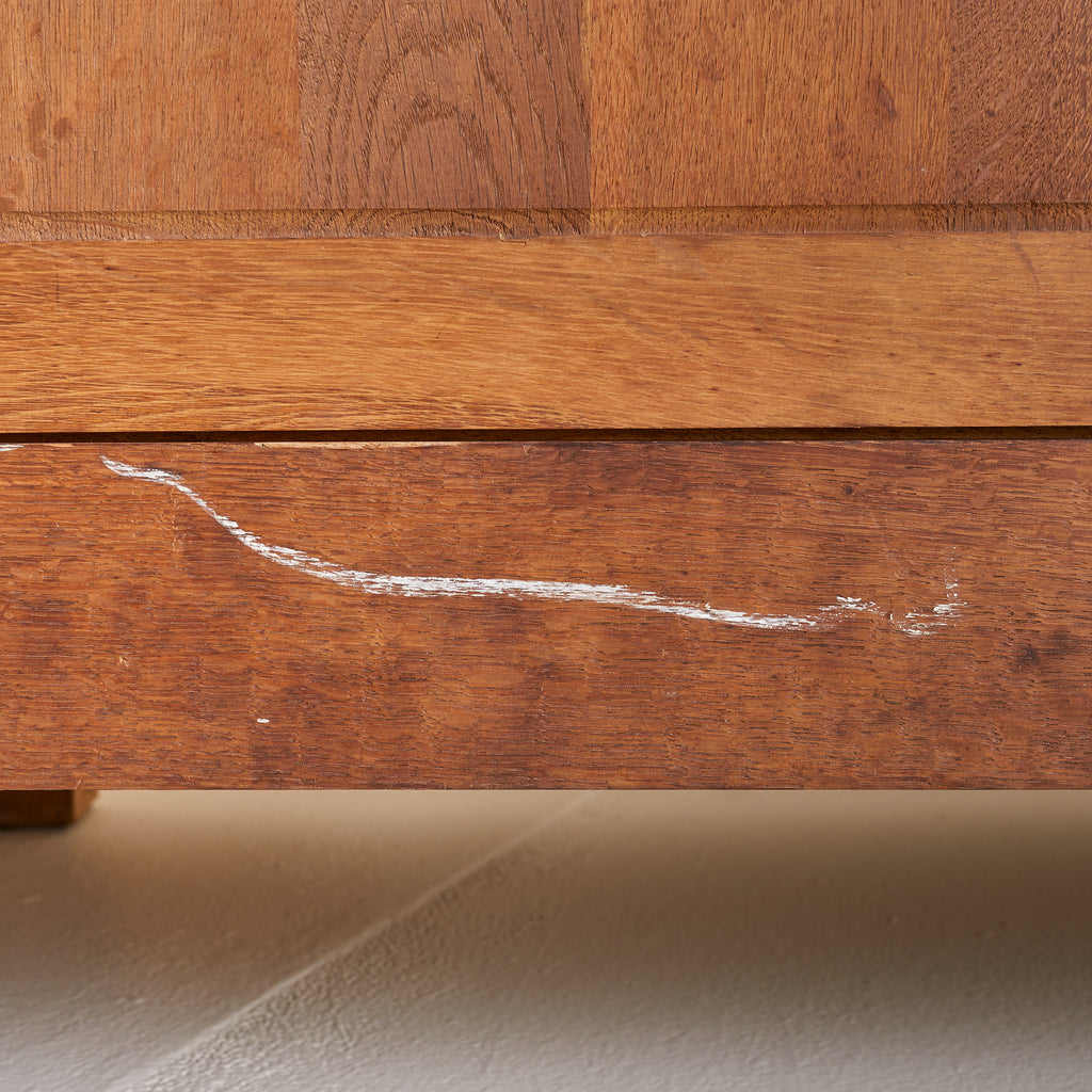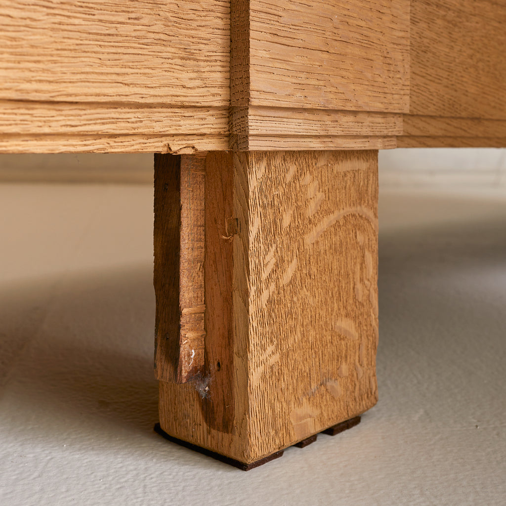 Crafted in Spain during the 1940s, this 10-foot-wide cabinet is a masterclass in craftsmanship, commanding attention with its monumental scale and richly detailed façade. Exemplifying the artisanal woodwork traditions of the period, it is made from solid sandblasted oak, with four heavily paneled doors featuring an intricate geometric relief.