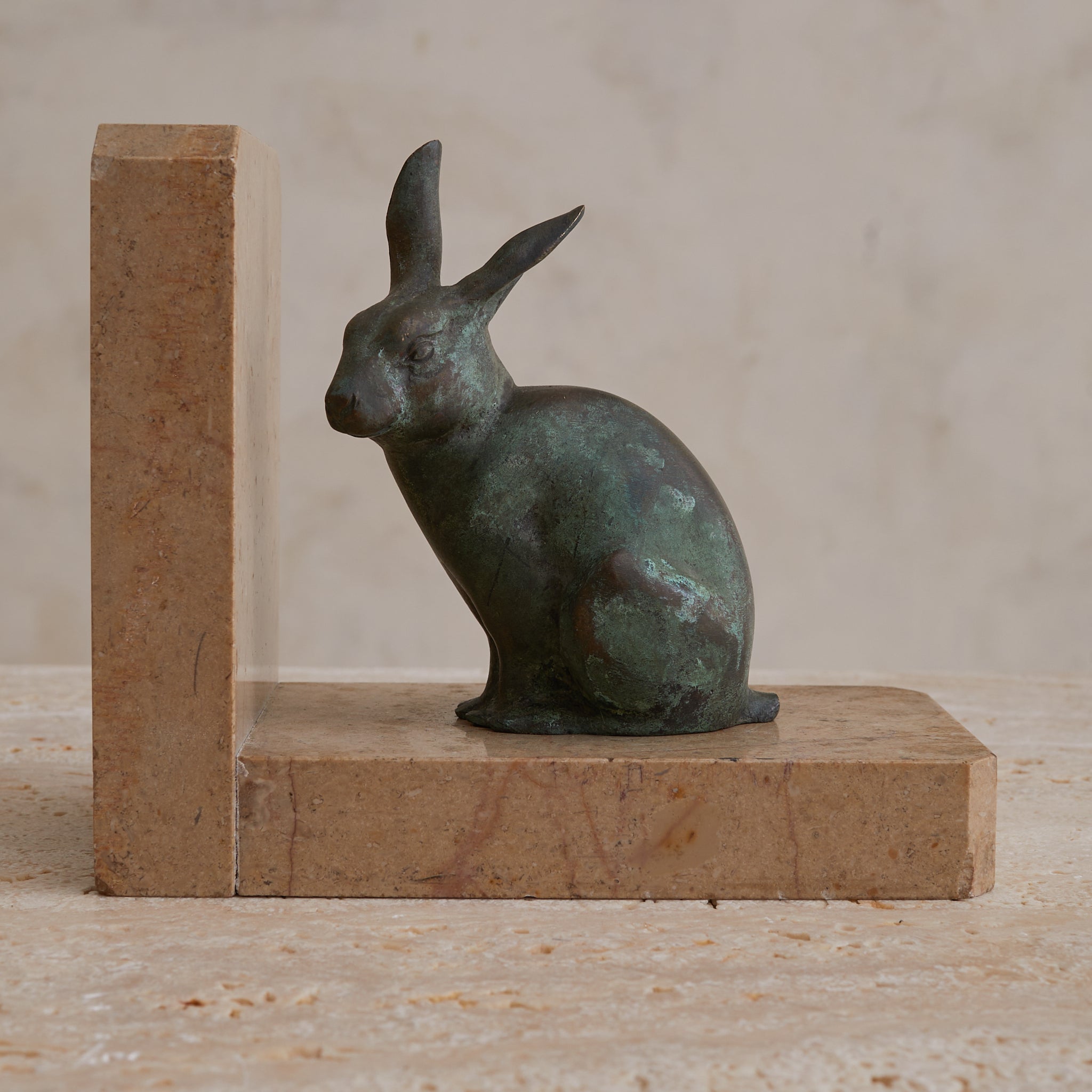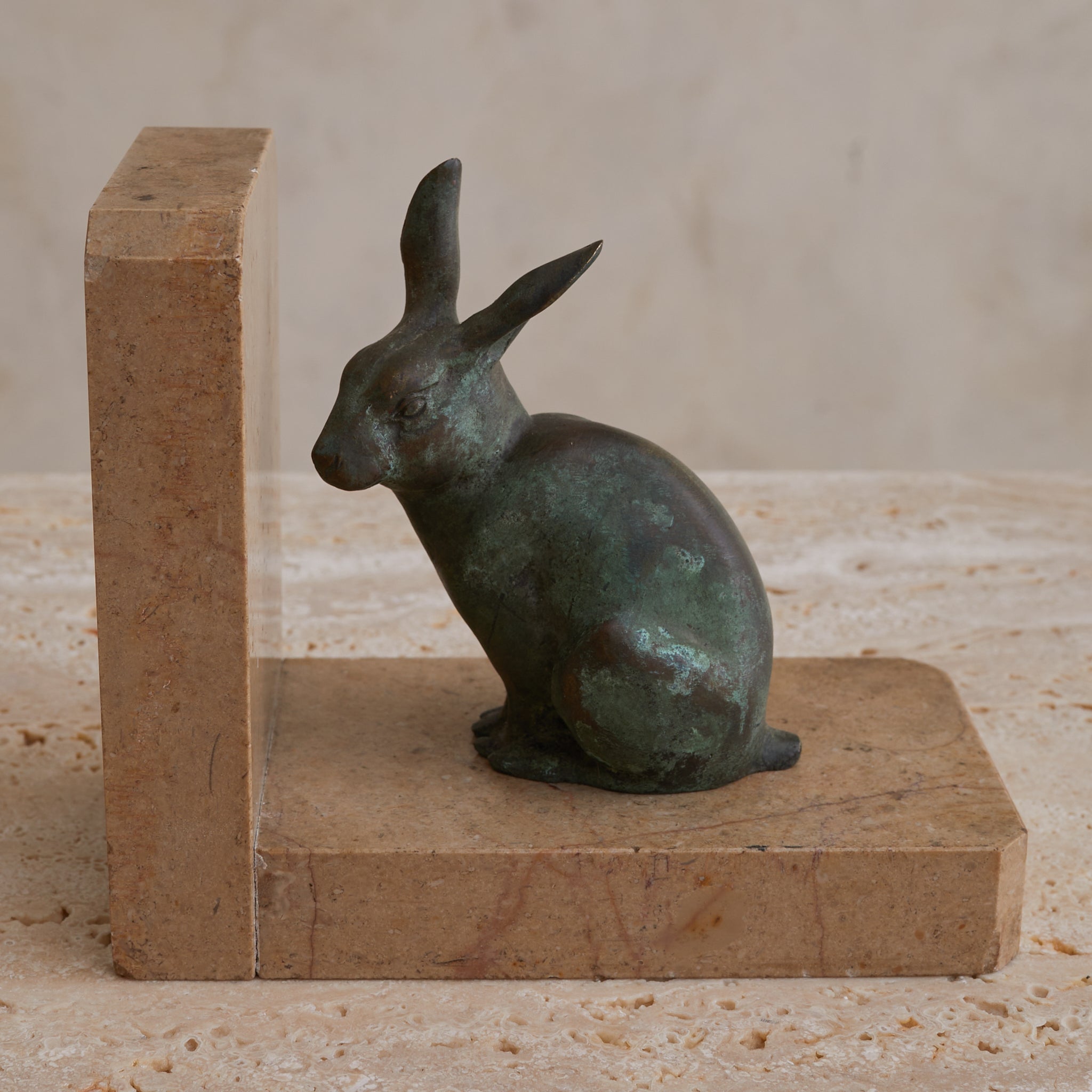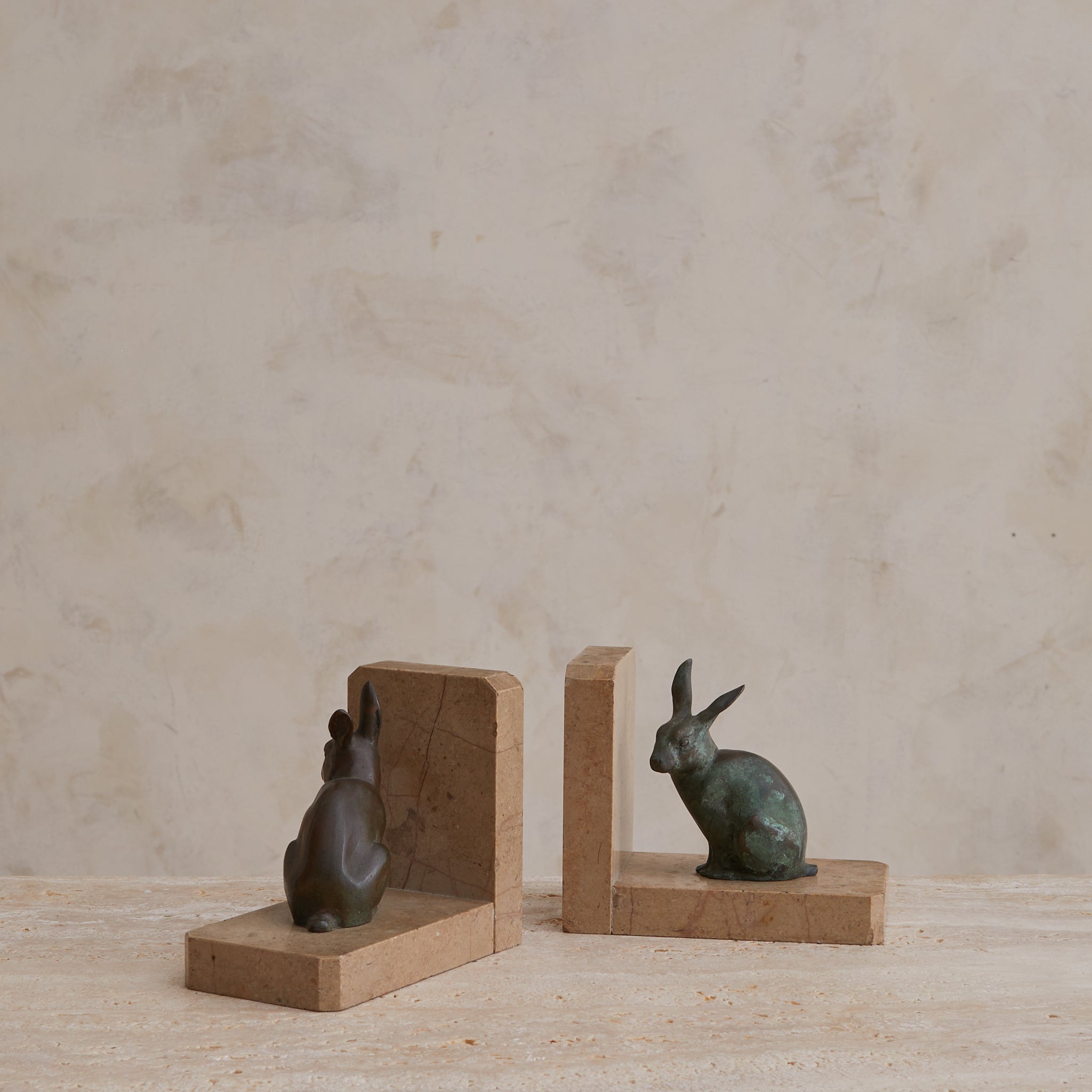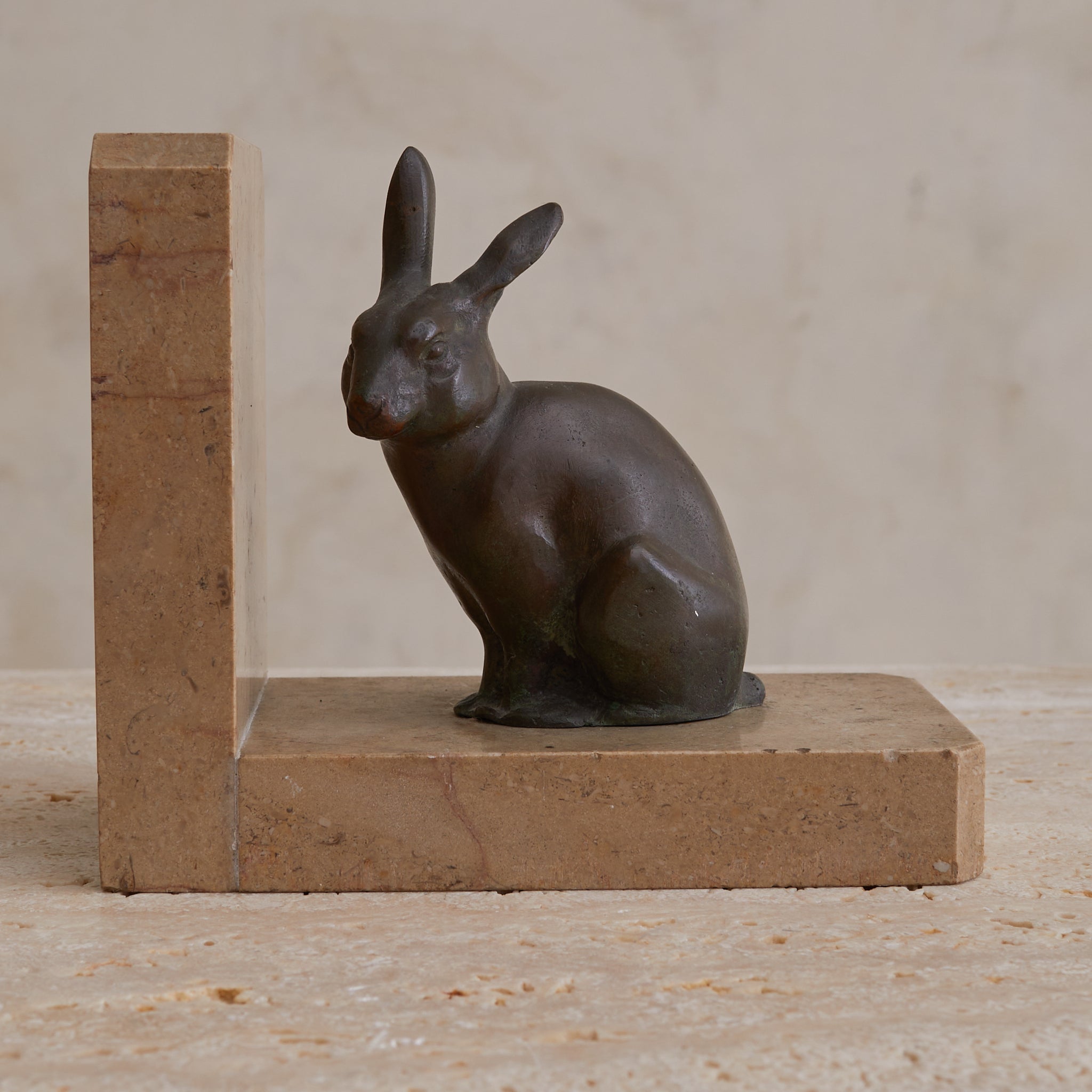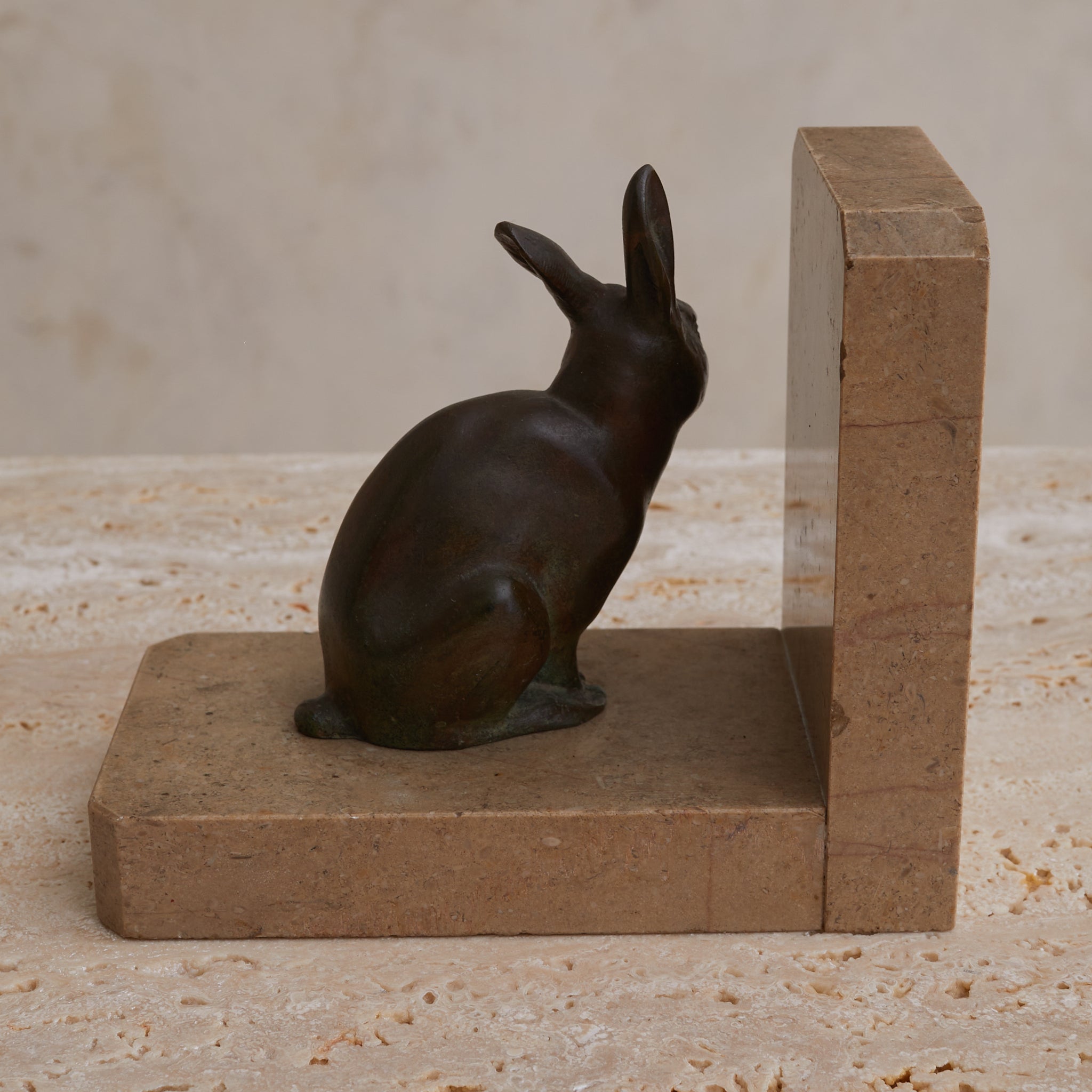 Pair of French Art Deco Marble + Bronze Rabbit Bookends, 1930s