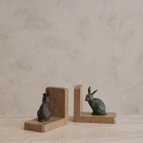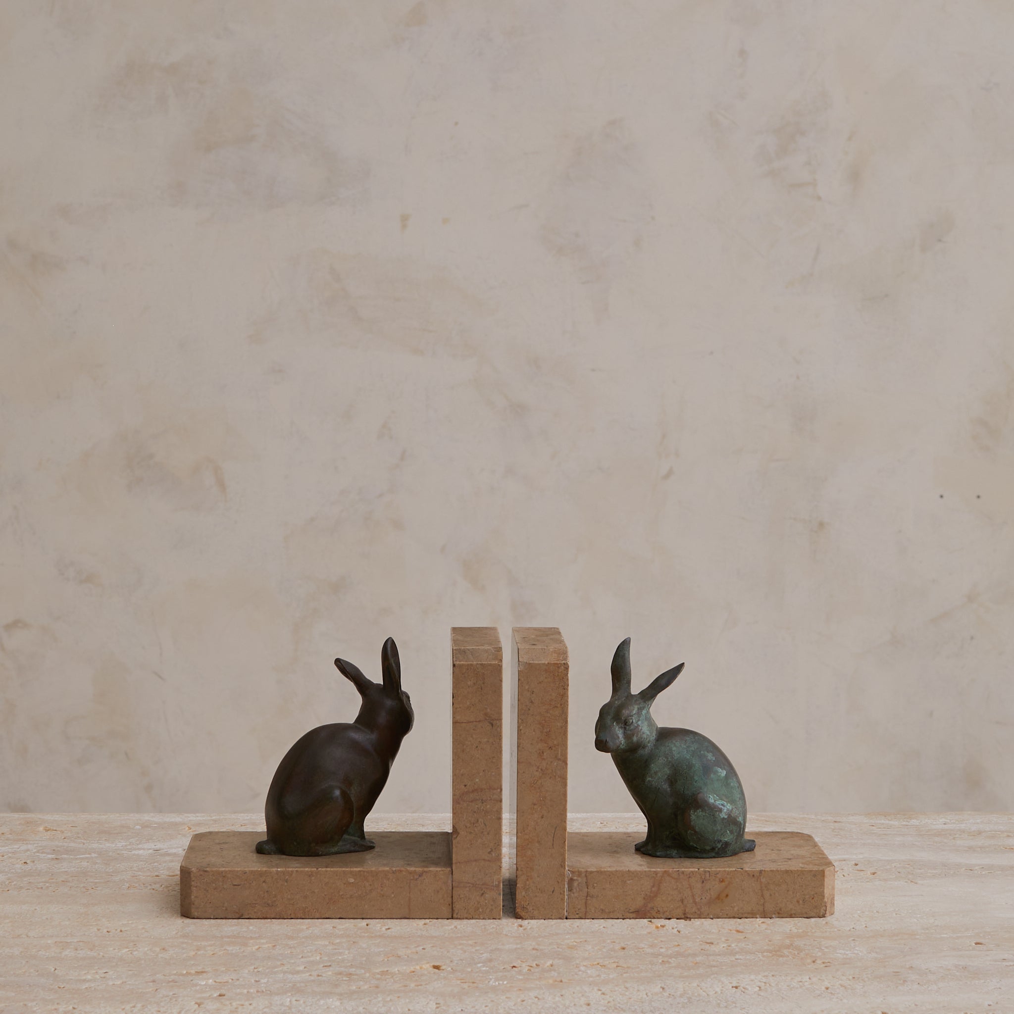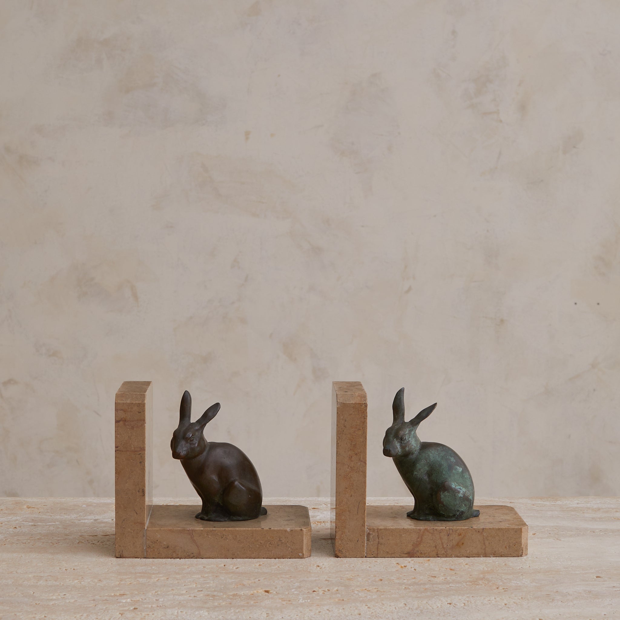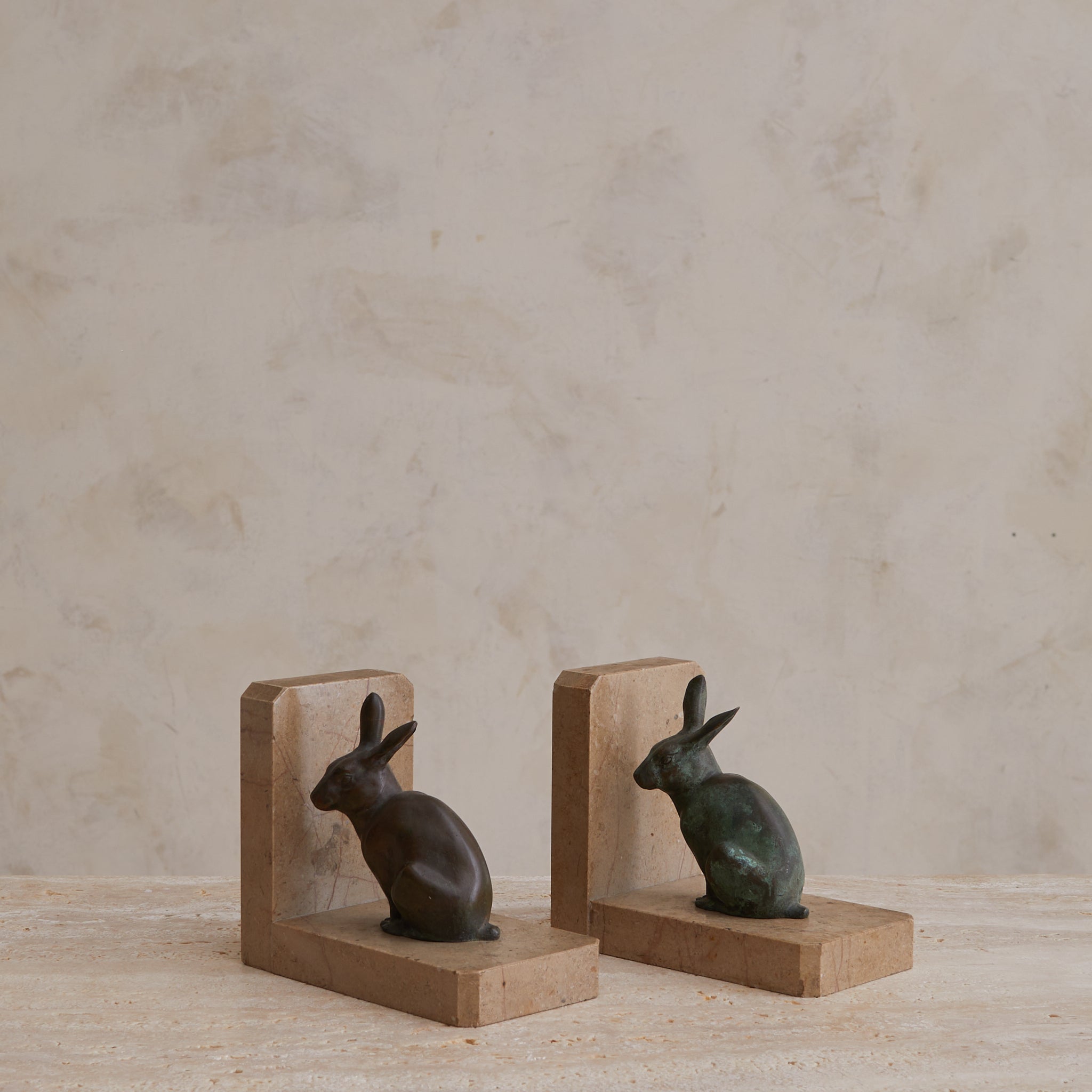 A pair of 1930s French stylized rabbit bookends, each finely cast in solid bronze—one with a deep verdigris, the other in a dark, mellowed patina. The forms are alert but still, perched atop L-shaped plinths of warm, veined marble. Art Deco in spirit, sculptural in presence—they steady a stack of books or stand alone as decorative objects in their own right.
