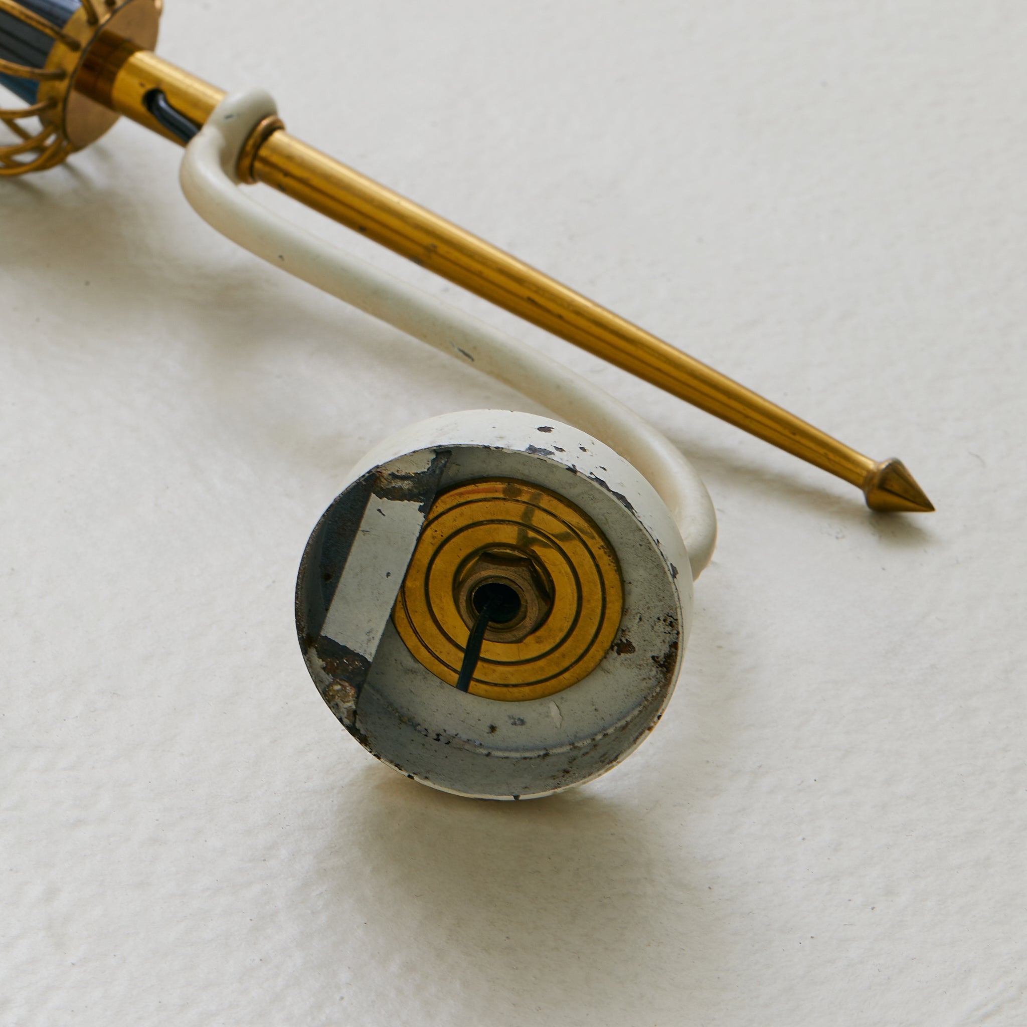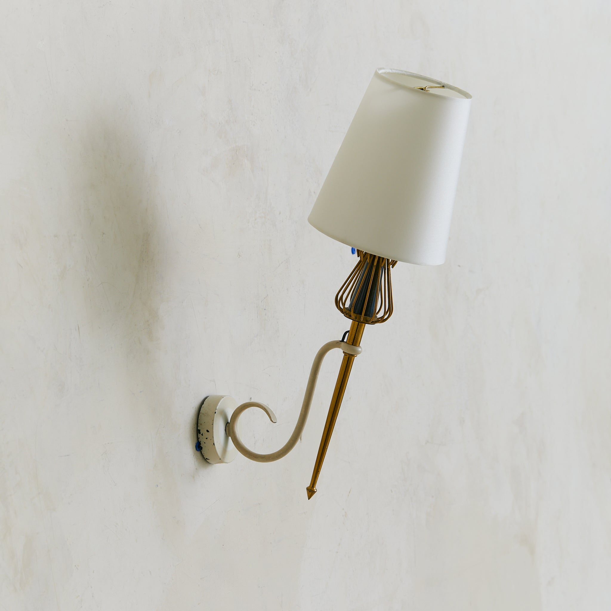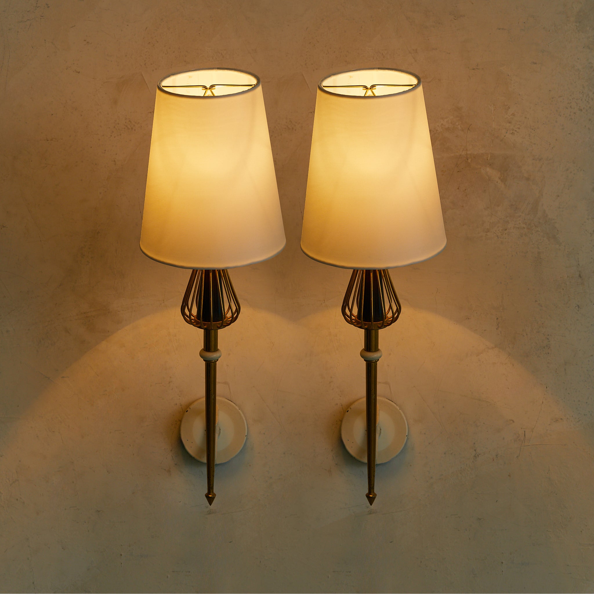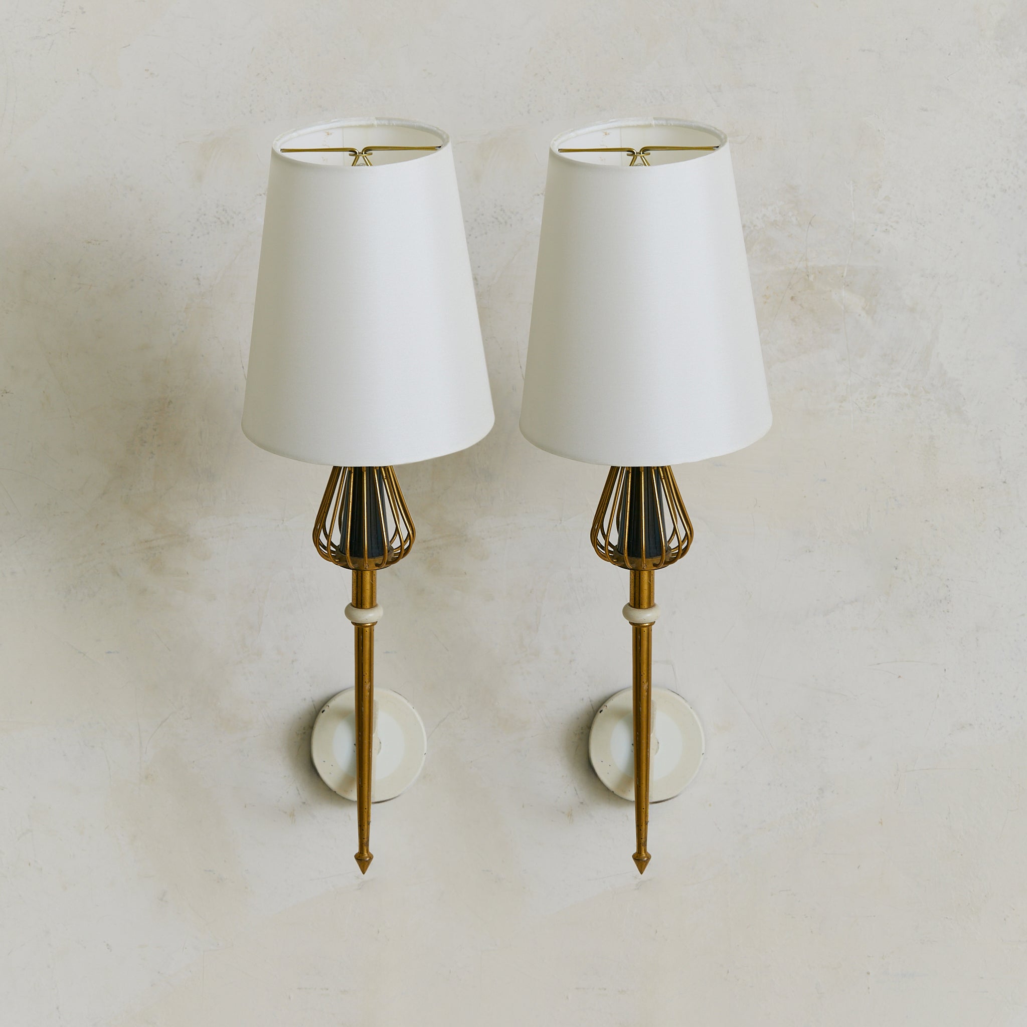 A pair of French single-arm wall sconces from the 1950s, in the manner of Maison Arlus. Each arm scrolls outward in lacquered ivory metal, topped with a tapered brass spike and flared wire cage that cradles a black enamel cone. Round ivory backplates anchor the silhouettes.