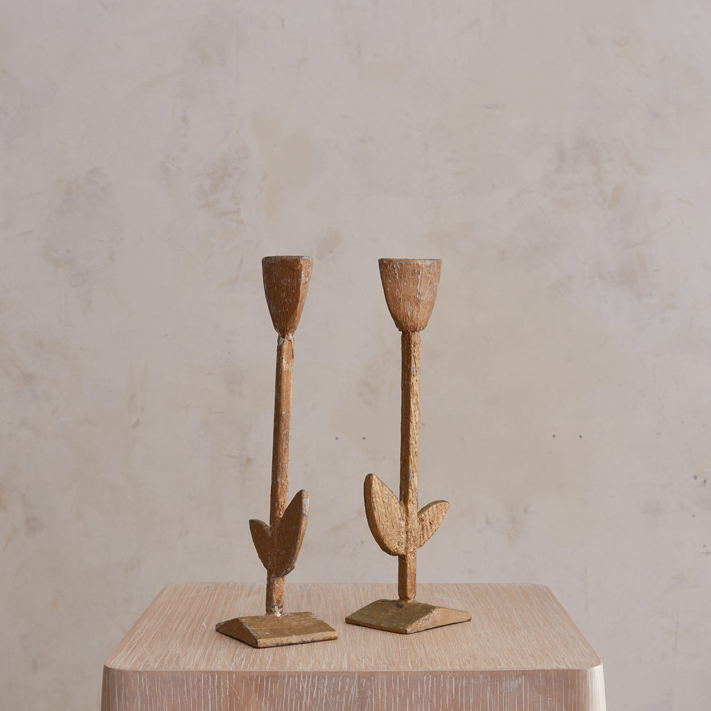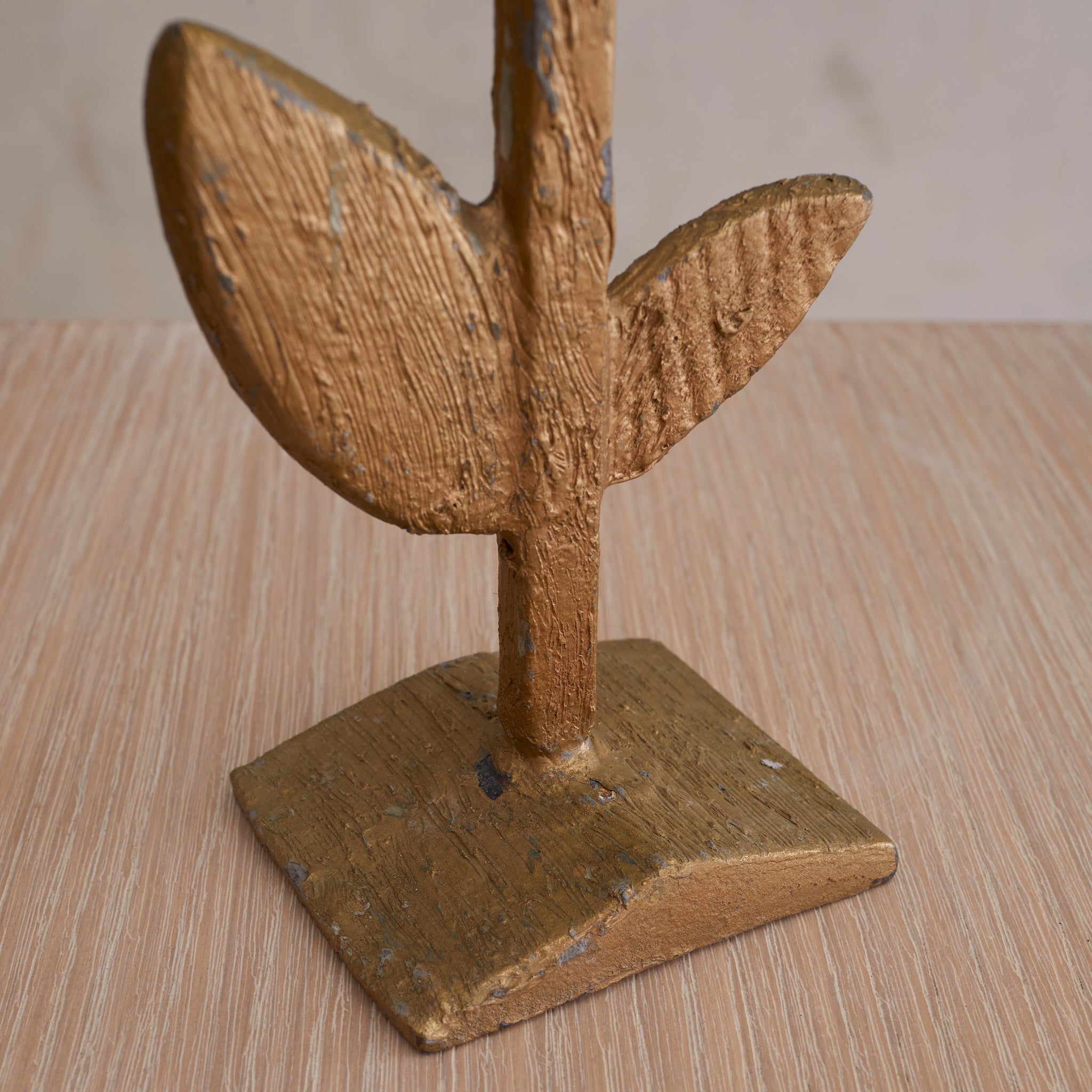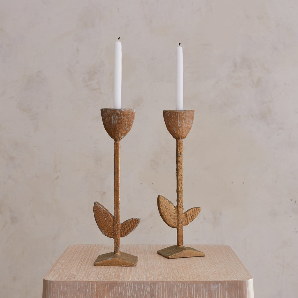 A sculptural pair of French candleholders in gilt metal, circa 1950s. Standing just under 12 inches tall, each stem rises from a faceted base with stylized leaf forms and tulip-like cups. The hand-applied gilding has worn beautifully, revealing traces of age and texture beneath. Sourced in the South of France.