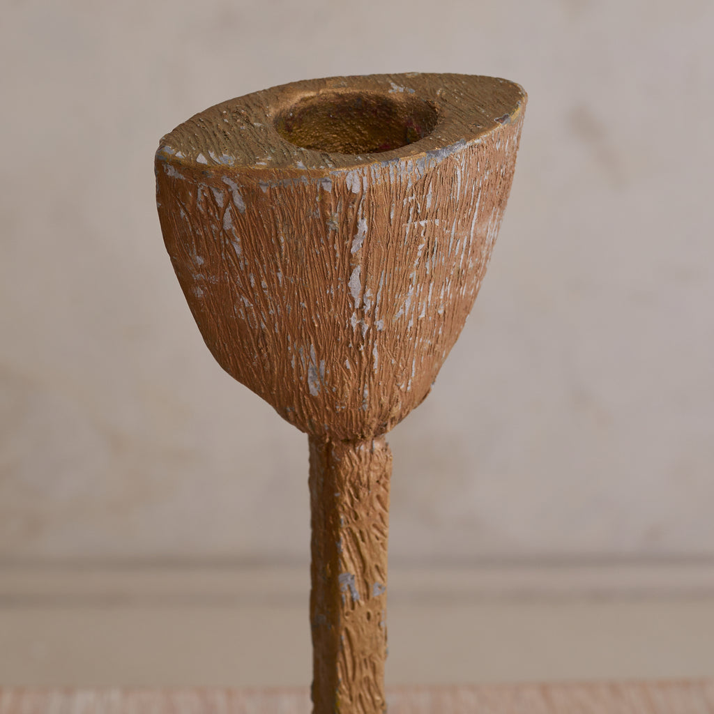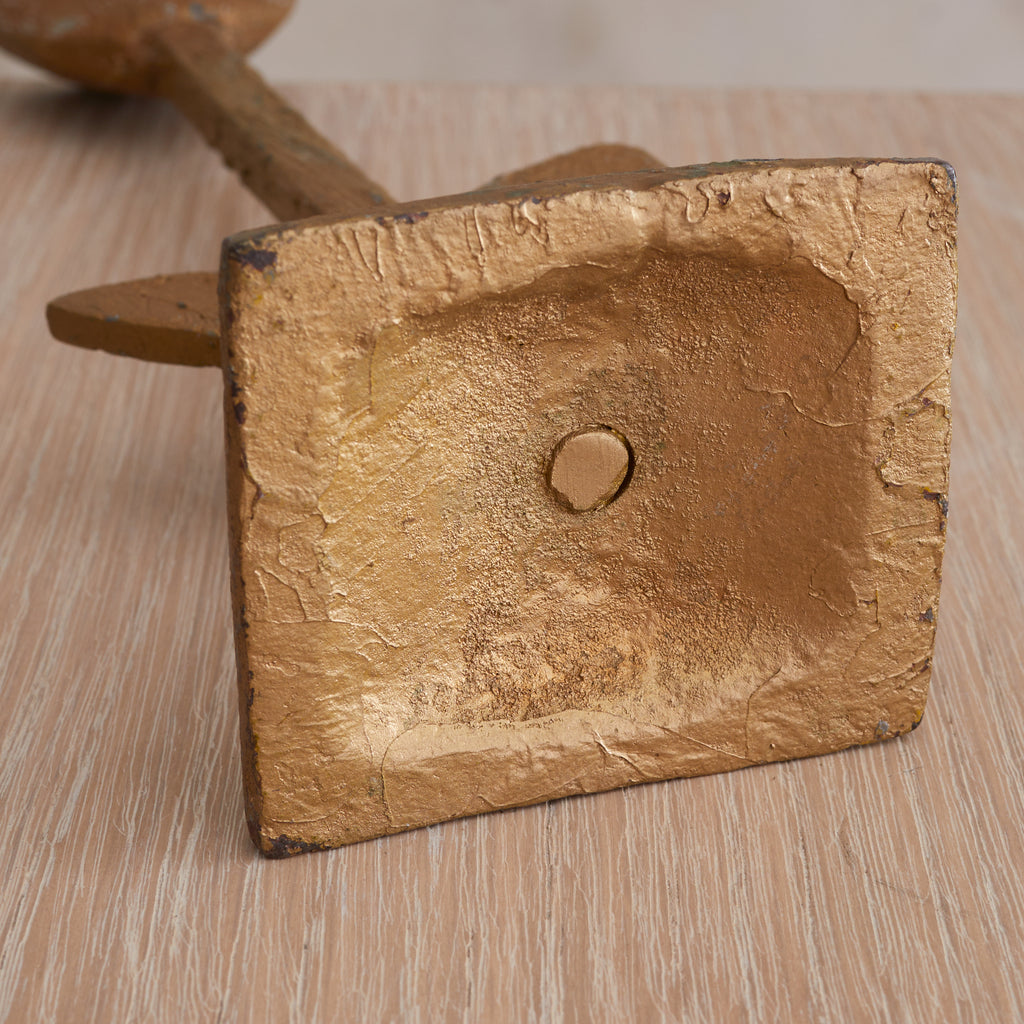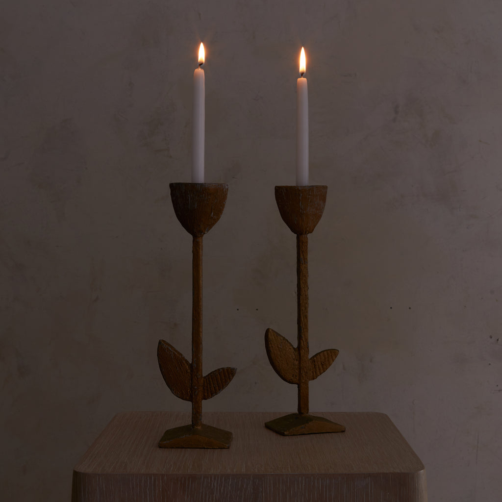 A sculptural pair of French candleholders in gilt metal, circa 1950s. Standing just under 12 inches tall, each stem rises from a faceted base with stylized leaf forms and tulip-like cups. The hand-applied gilding has worn beautifully, revealing traces of age and texture beneath. Sourced in the South of France.
