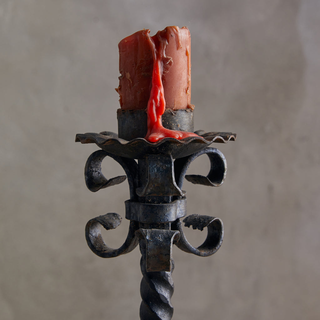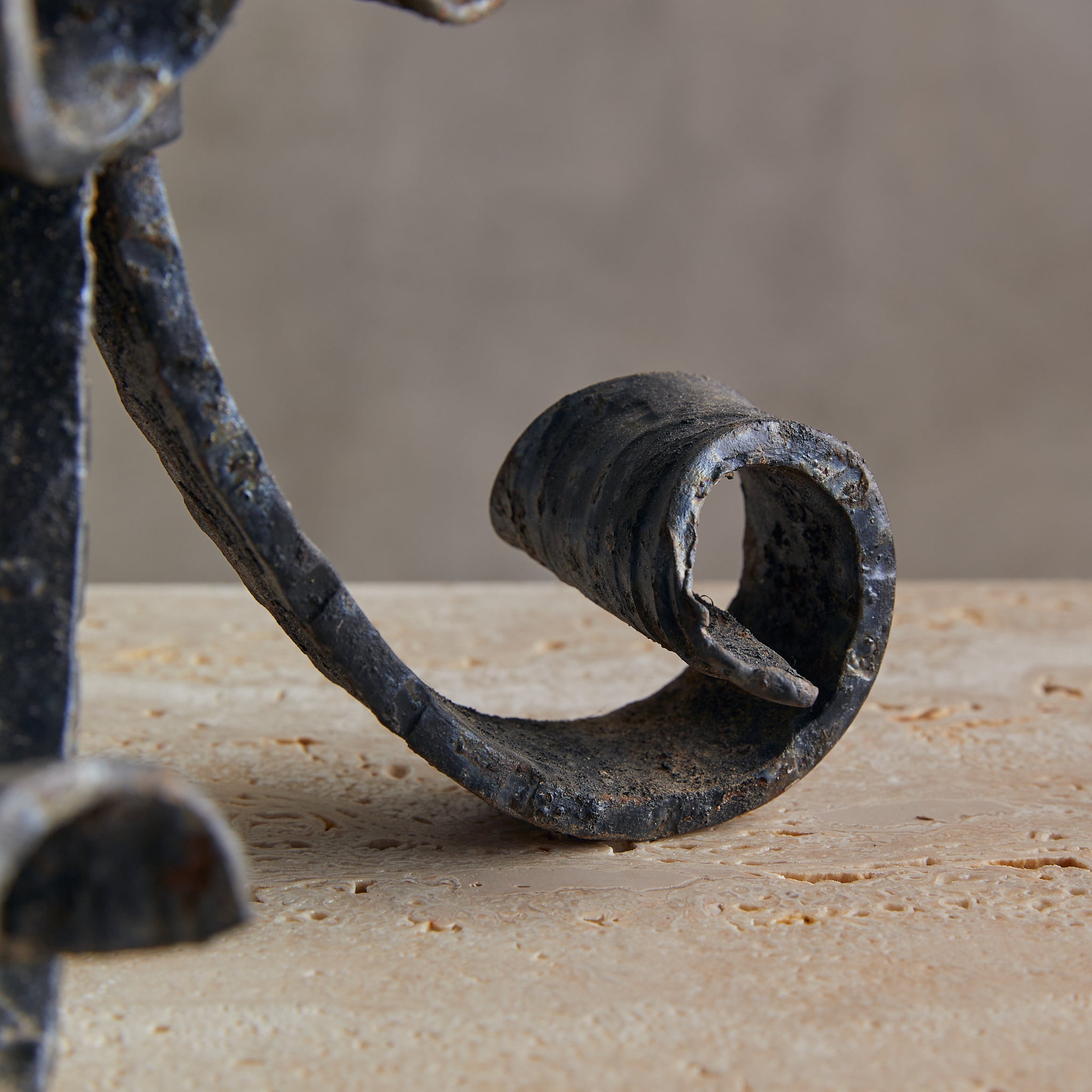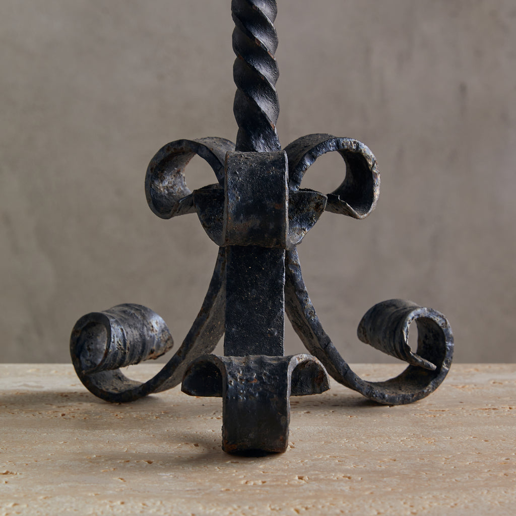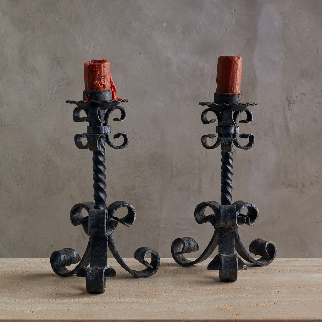 A pair of 1960s French candleholders, hand-forged in iron. Each piece rises on a twisted central stem anchored by scrollwork feet—thick, curled bands of iron shaped under heat and hammer. The bobeches are edged with subtle ruffles.