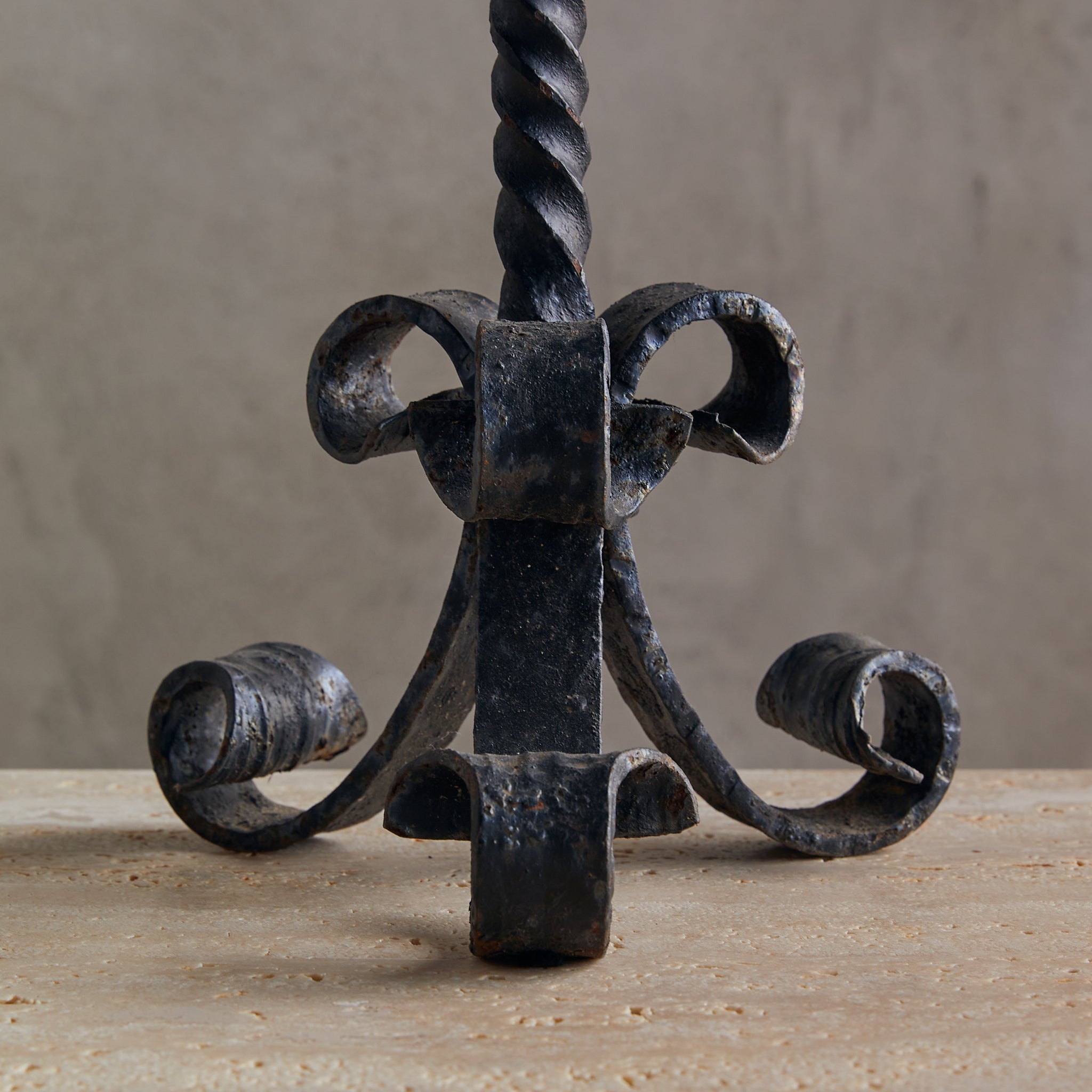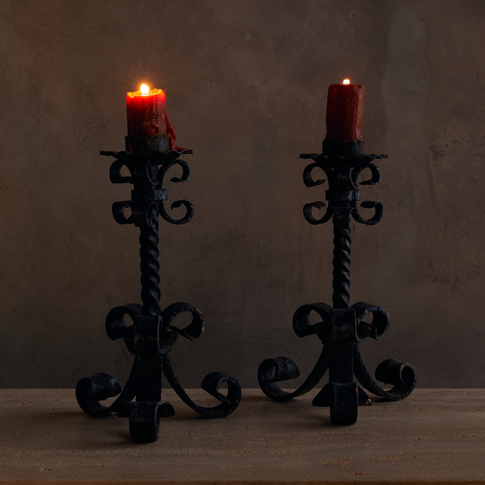 Finished in a deep, timeworn blackened patina, the pair carries the weight and character of true forge work, lending a rustic, architectural presence to a mantel or dining table.