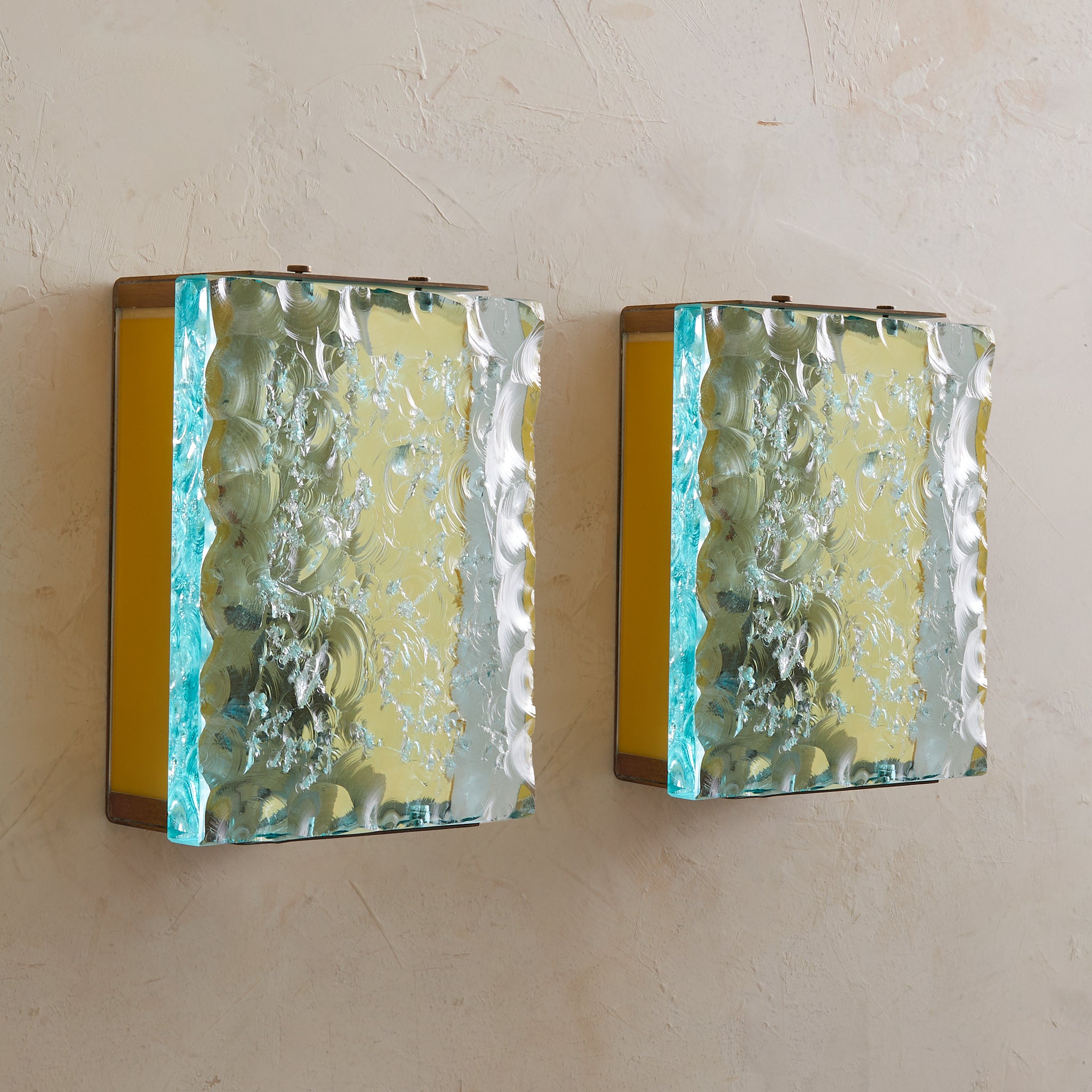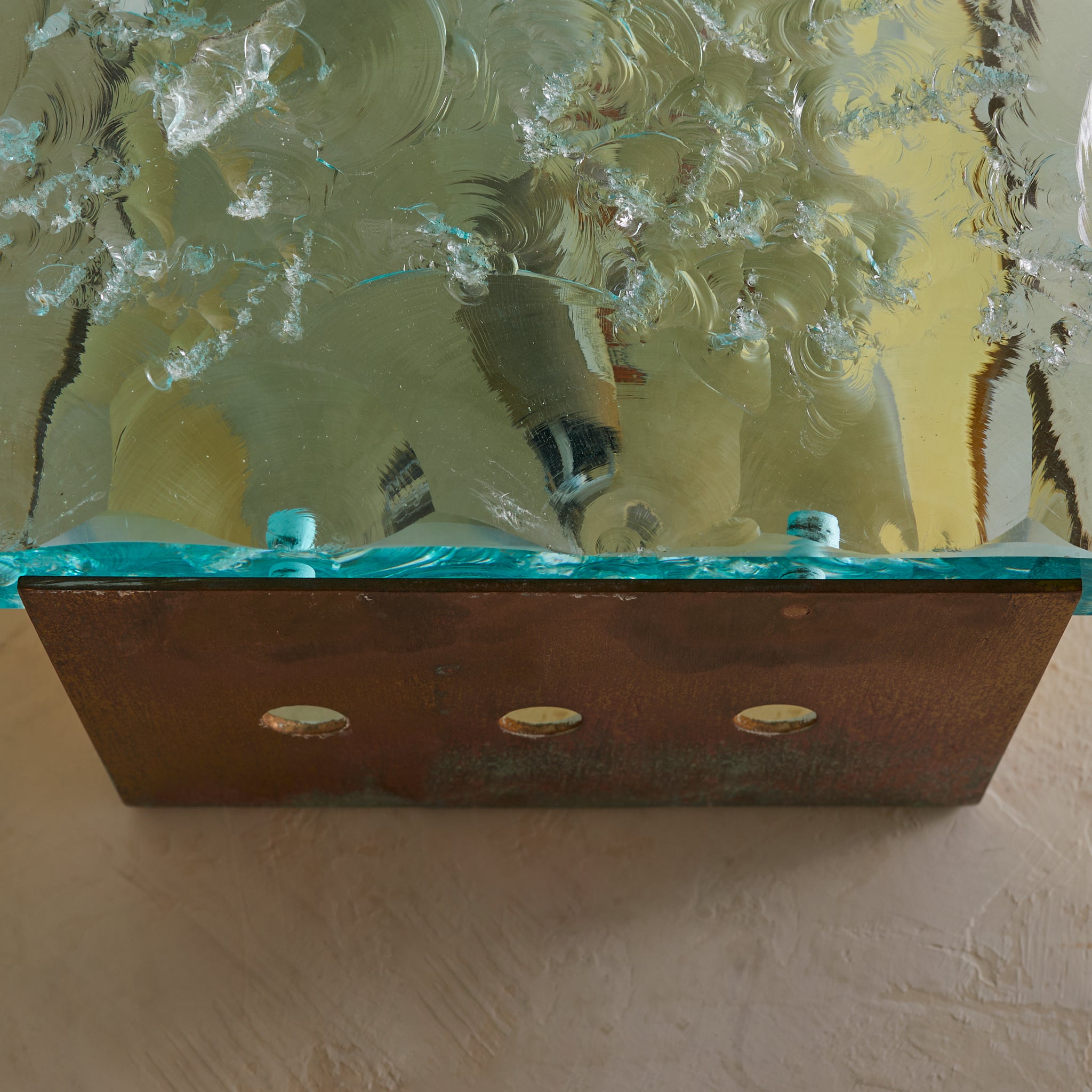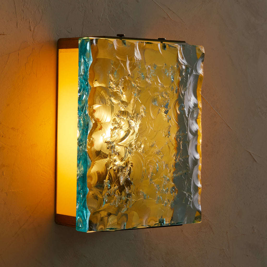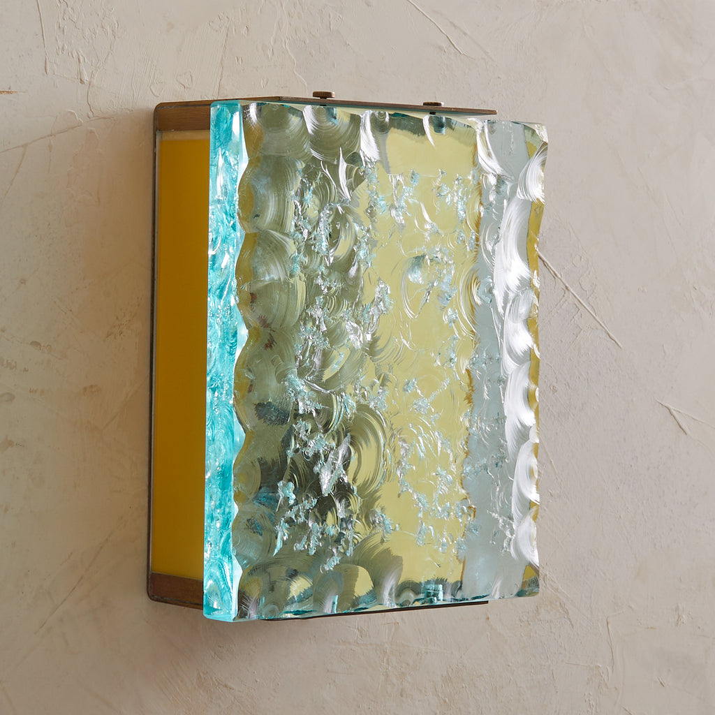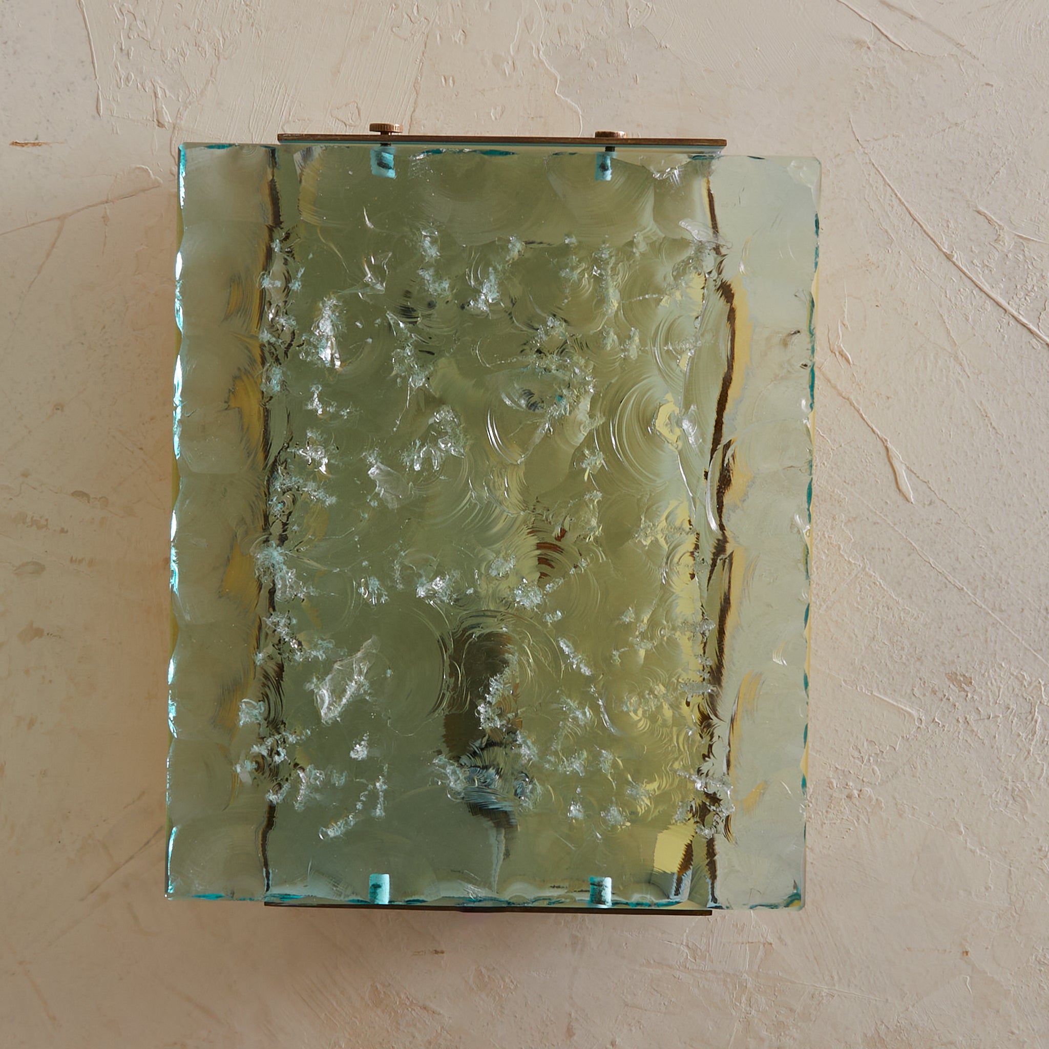 The rare ‘Model 2311’ wall sconce was designed by Max Ingrand for Fontana Arte in 1964. Its thick, hand-chiseled glass panel has fluid, organic contours, capturing a sense of movement suspended in time. The glass appears to hover above the brushed brass frame, which grounds the design with warmth and structure. When illuminated, its translucent aqua and golden hues cast a soft, atmospheric glow, emphasizing its jewel-like quality.