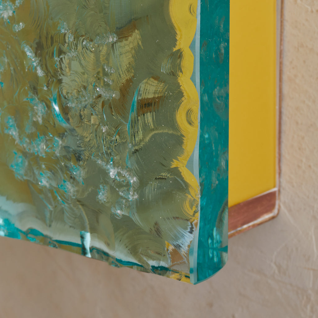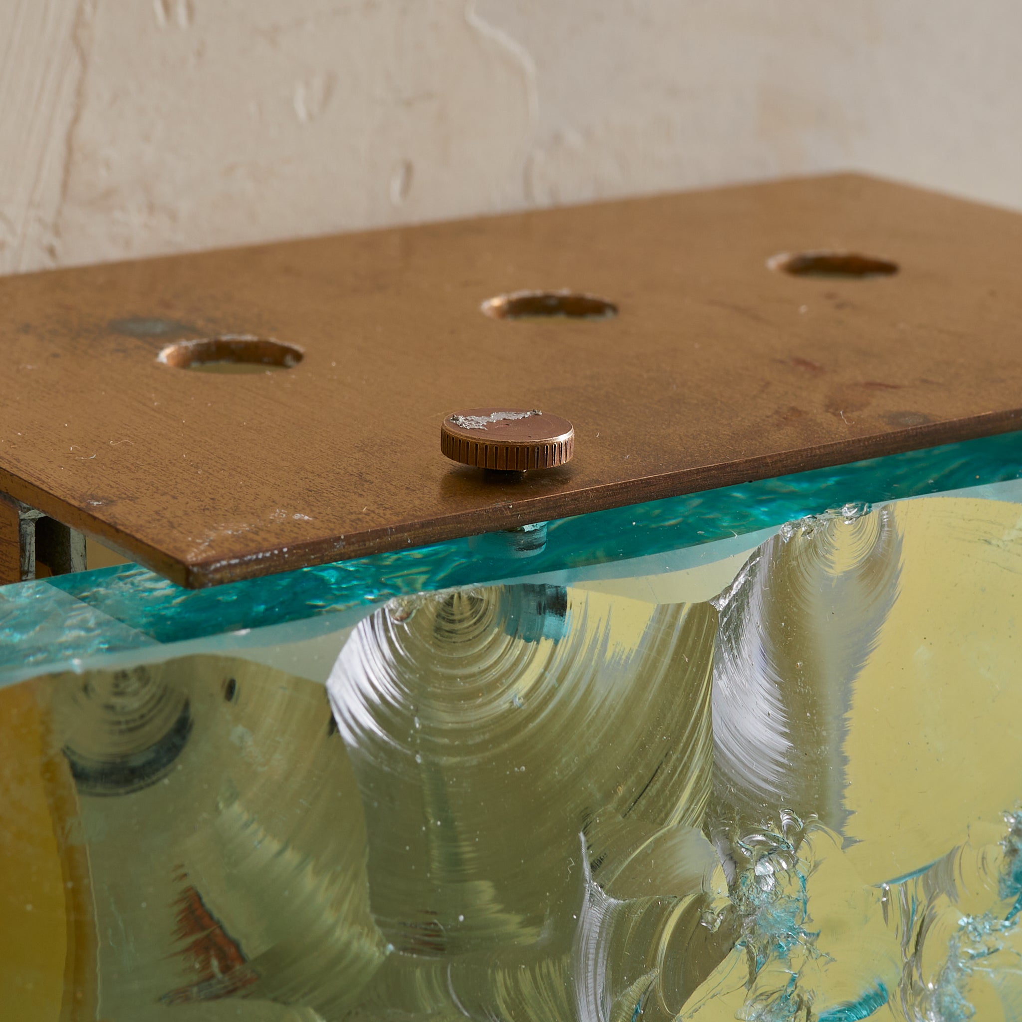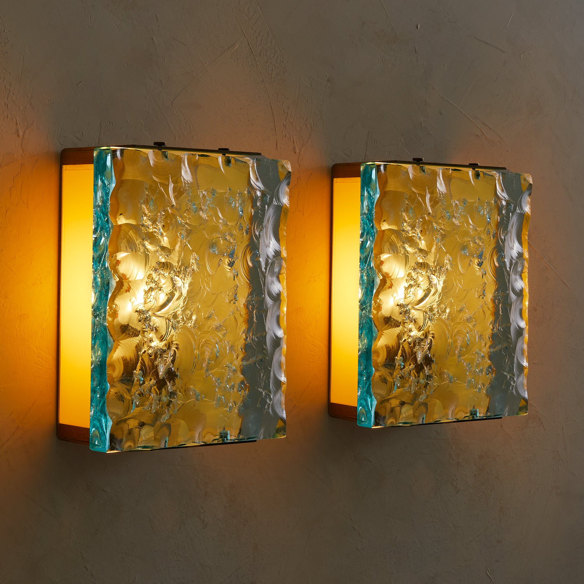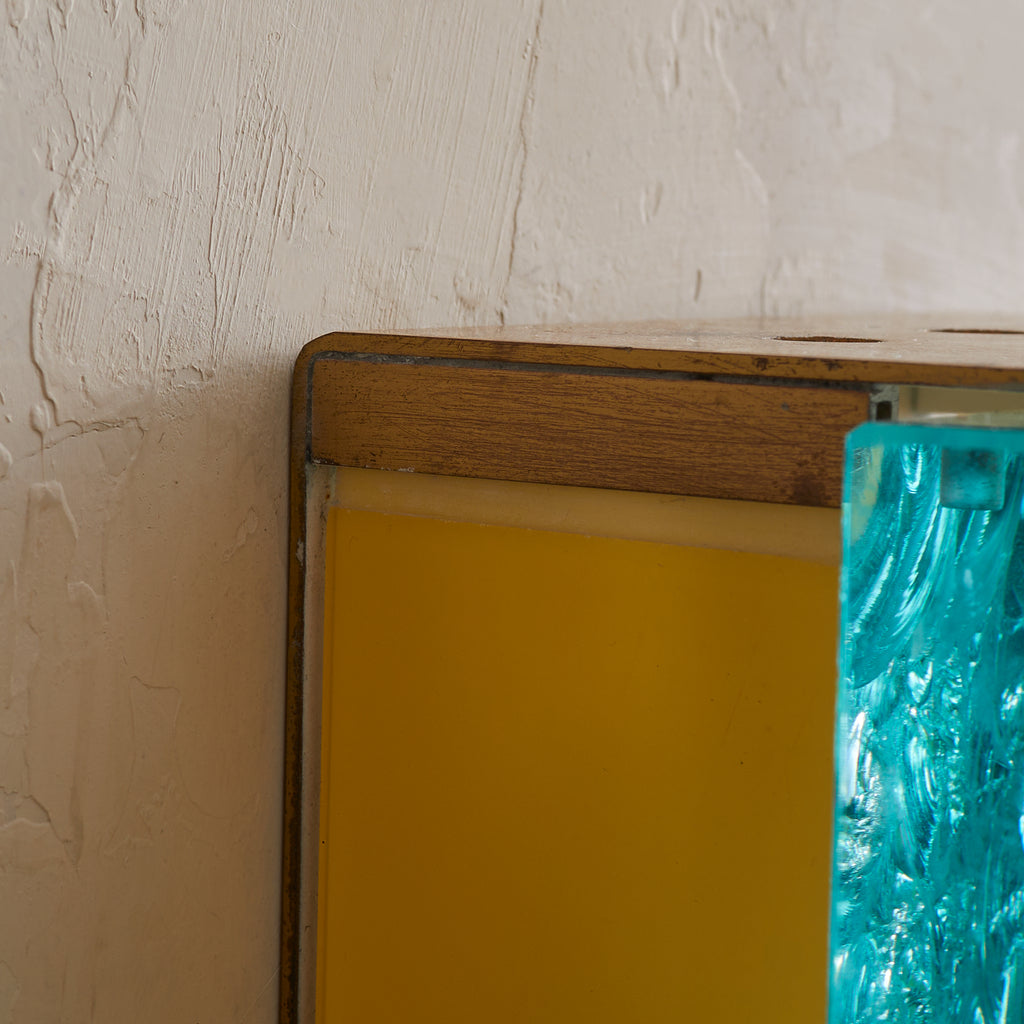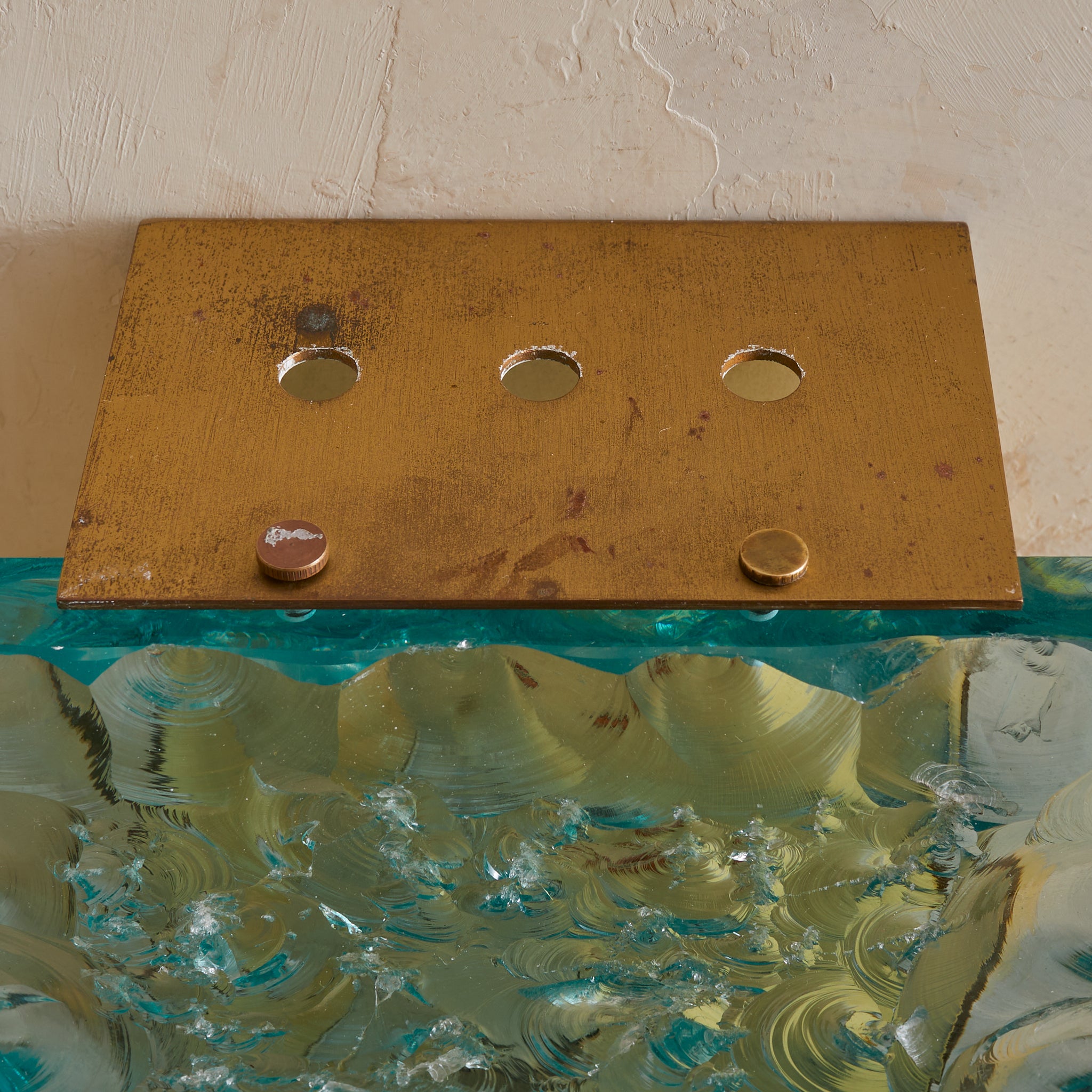 The rare ‘Model 2311’ wall sconce was designed by Max Ingrand for Fontana Arte in 1964. Its thick, hand-chiseled glass panel has fluid, organic contours, capturing a sense of movement suspended in time. The glass appears to hover above the brushed brass frame, which grounds the design with warmth and structure. When illuminated, its translucent aqua and golden hues cast a soft, atmospheric glow, emphasizing its jewel-like quality.
