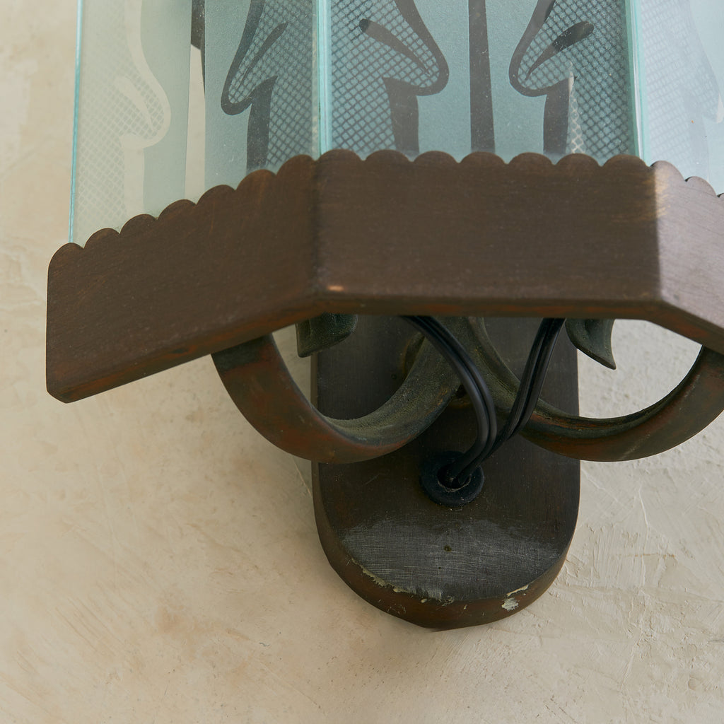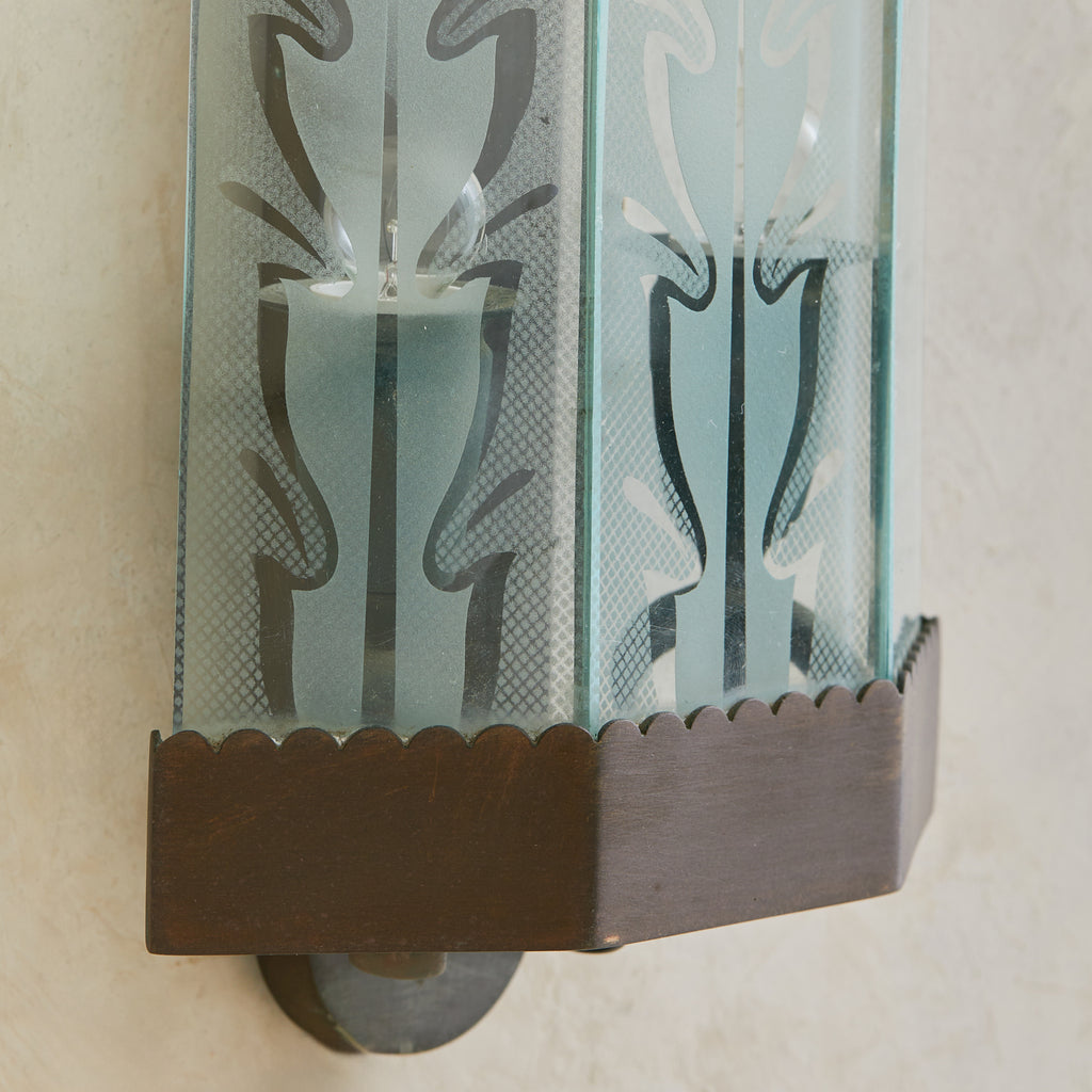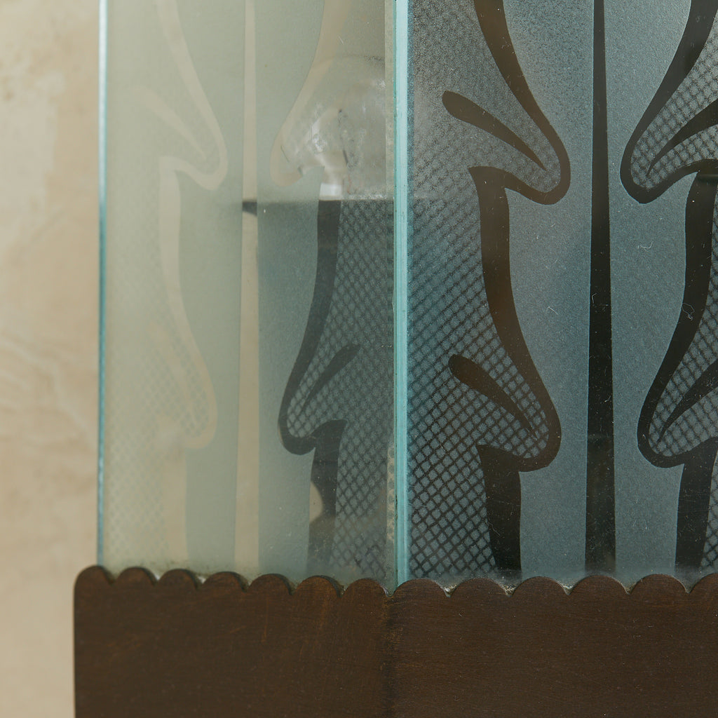 The metal base, finished in a deep bronzed tone, grounds the design, with scalloped detailing that echoes the rhythm of the etched glass. When illuminated, the pattern reveals its depth—a play of shadow and reflection. Ideal in an entryway, along a hallway, or flanking a mirror or artwork.