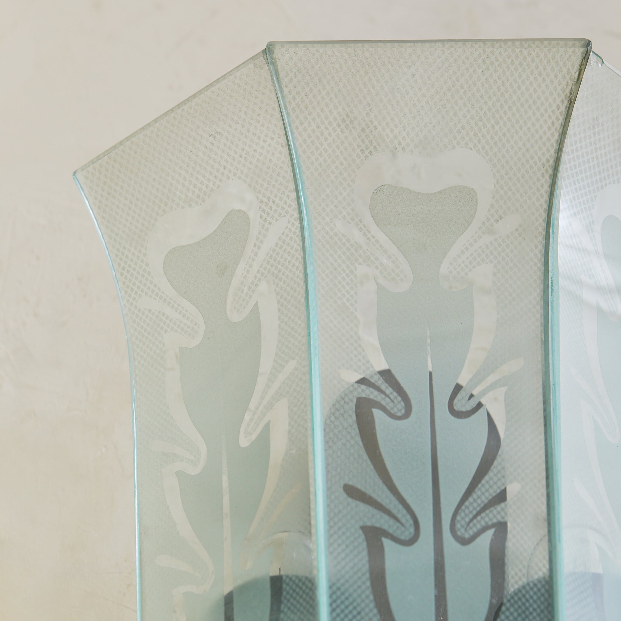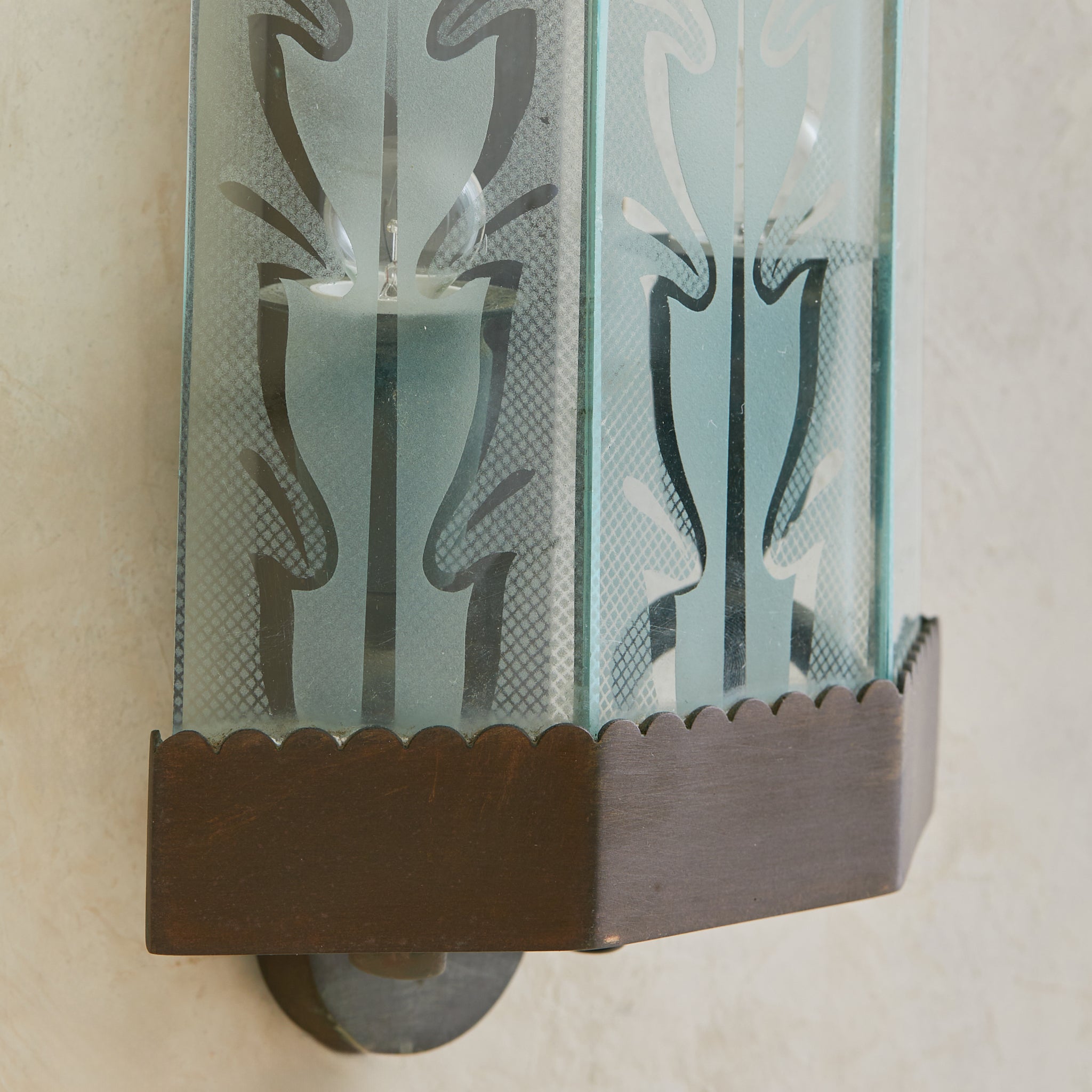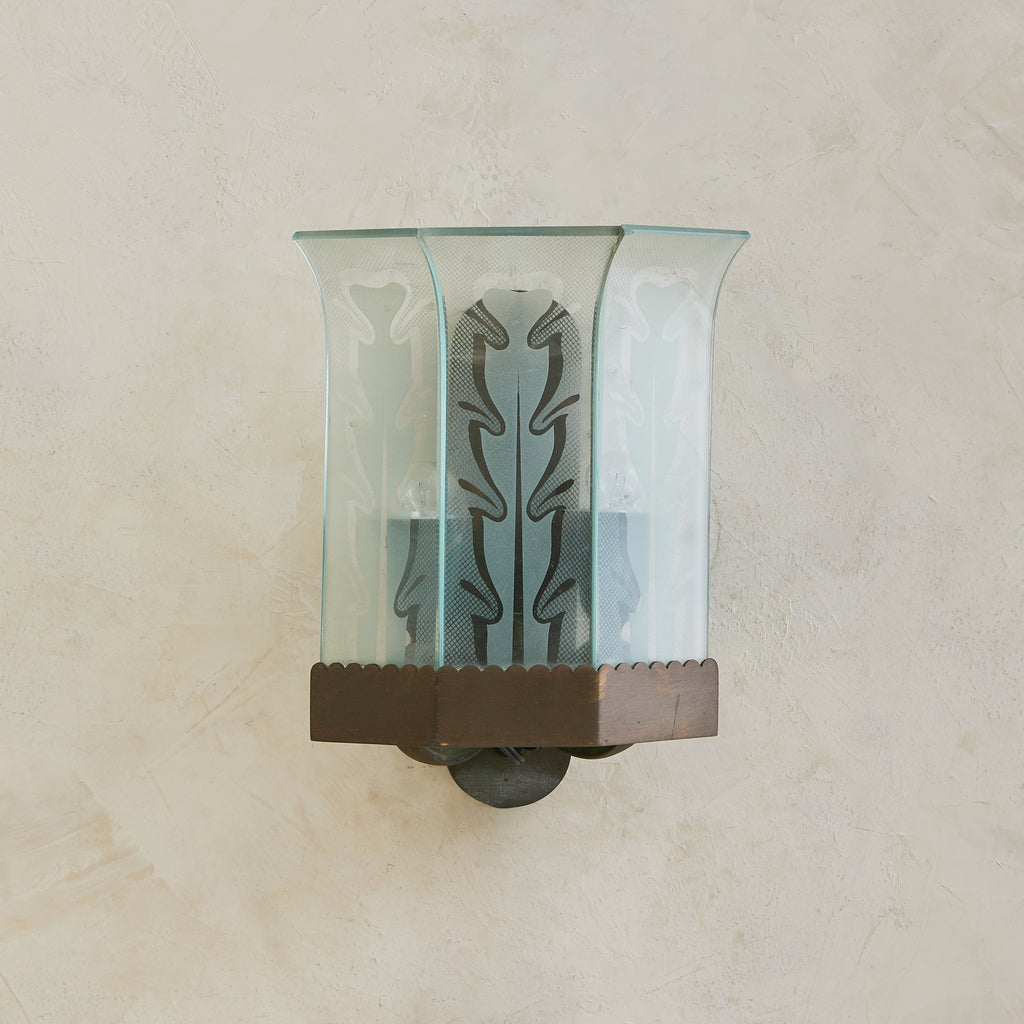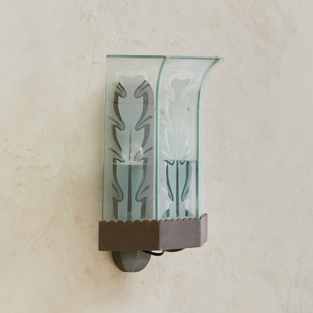A pair of 1950s Italian wall sconces attributed to Pietro Chiesa for Fontana Arte. Delicate in profile, each sconce features three curved Murano glass panels, their surfaces etched in a stylized botanical motif that feels distinctly Chiesa. The glass softens from clear to frosted, creating a layered translucency that gently diffuses the light.
