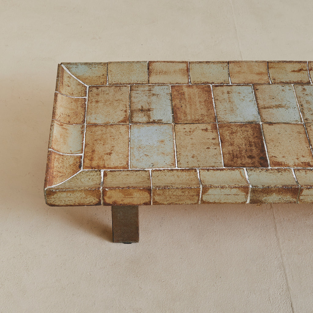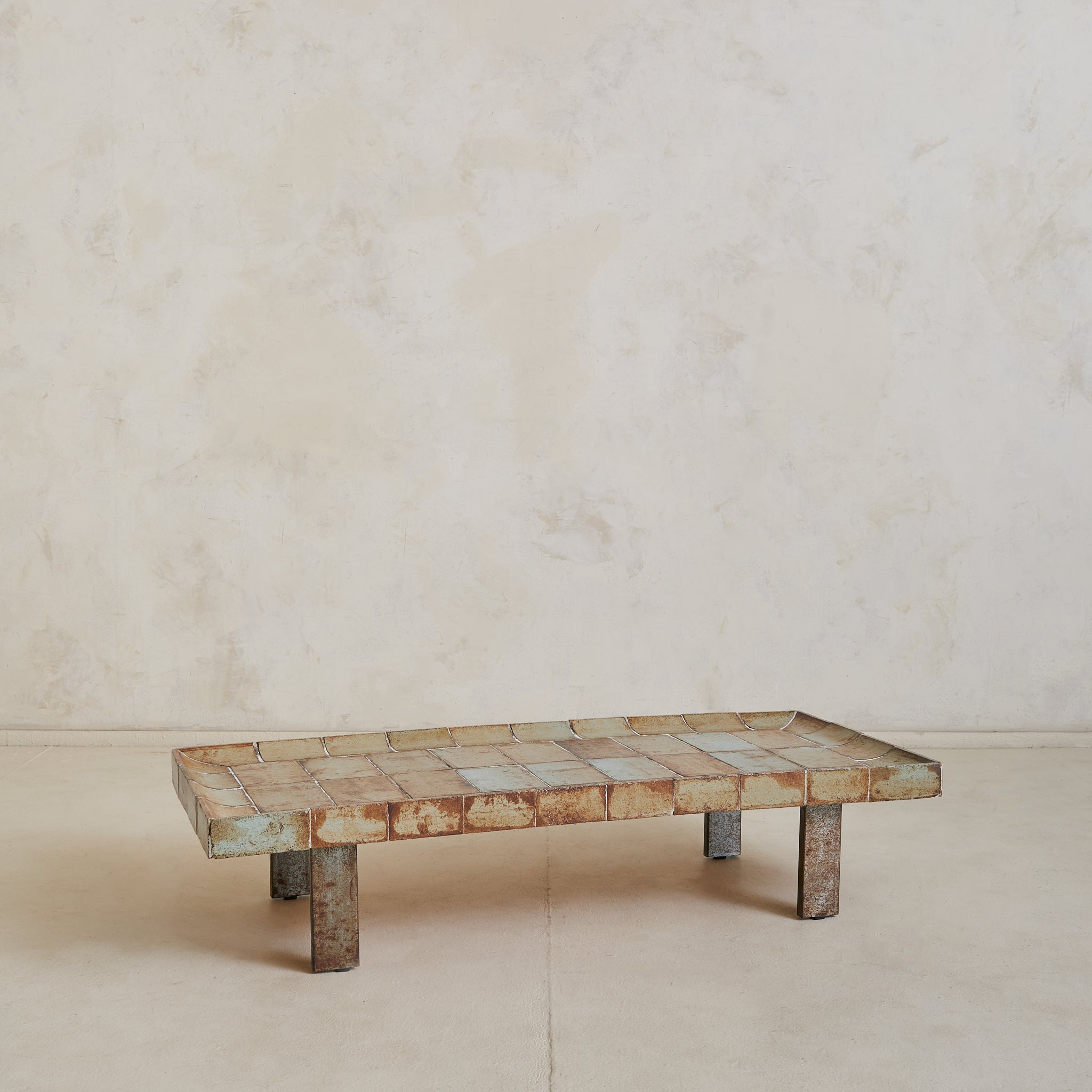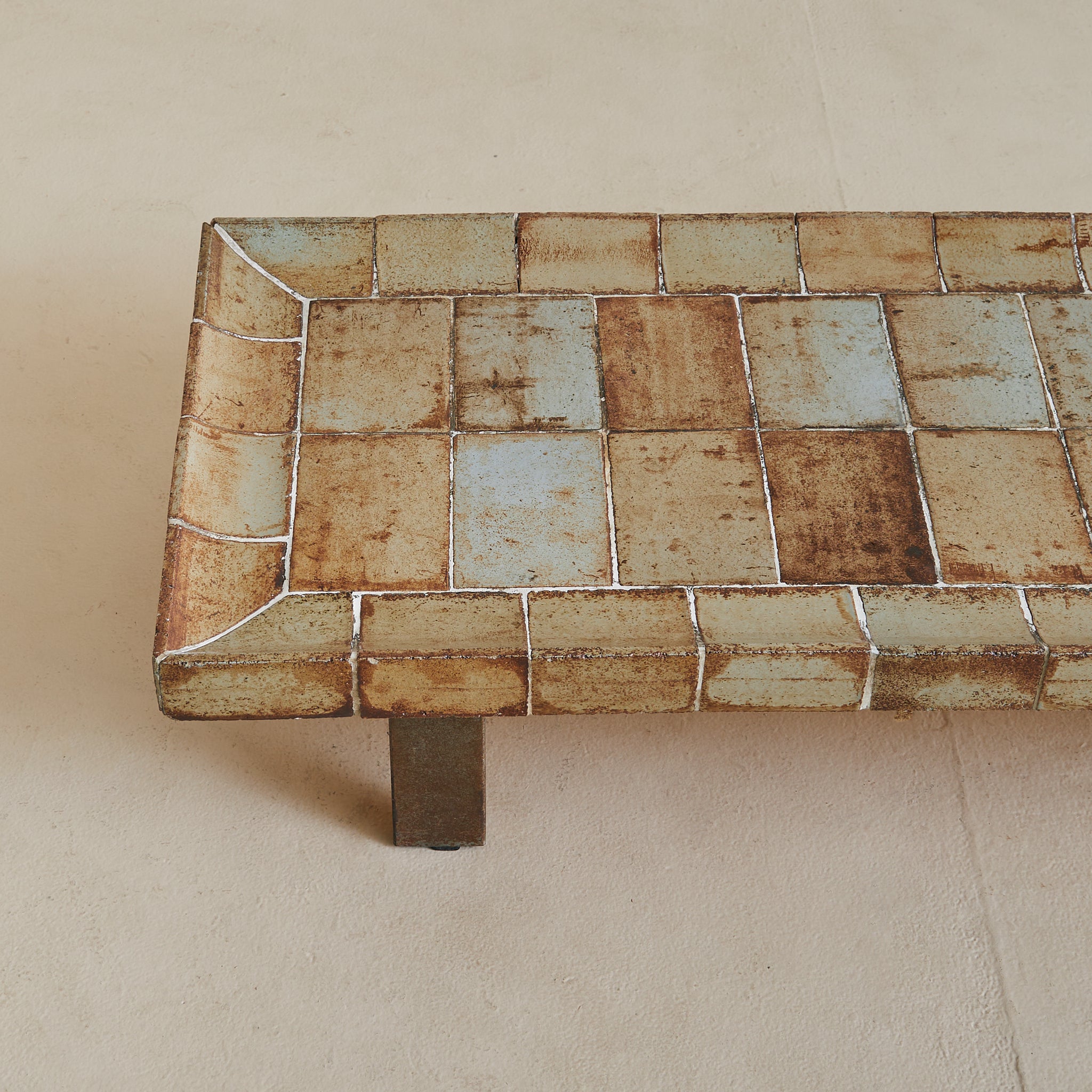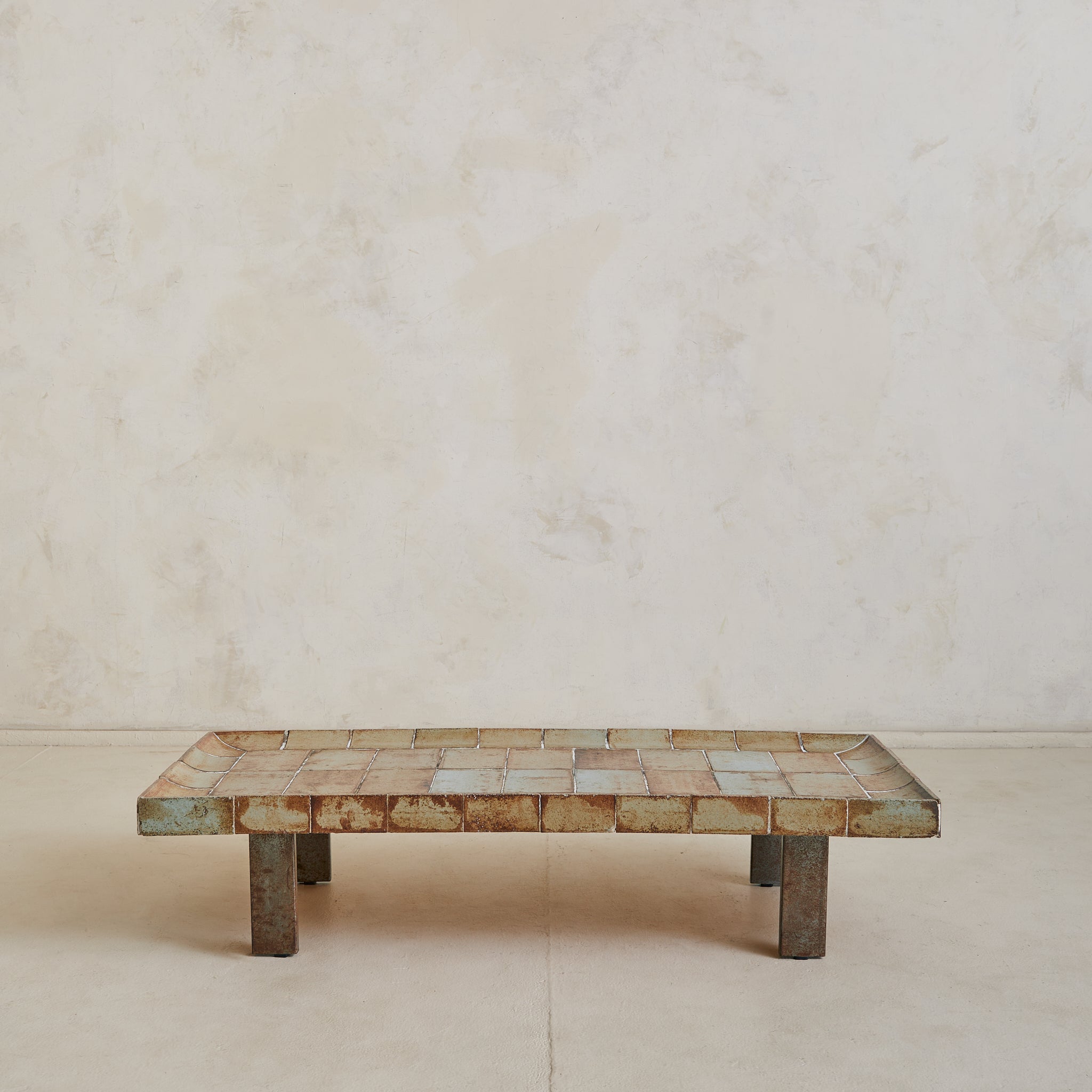 A rare 1960s ‘Cuvette’ coffee table by French ceramicist Roger Capron. This piece features a concave tabletop clad in gorgeous earthenware ceramic tiles from Vallauris, France. The tiles have rich color variations, which include a range of celadon green, sand, and chocolate brown hues. It stands on rectangular patinated steel block legs.
