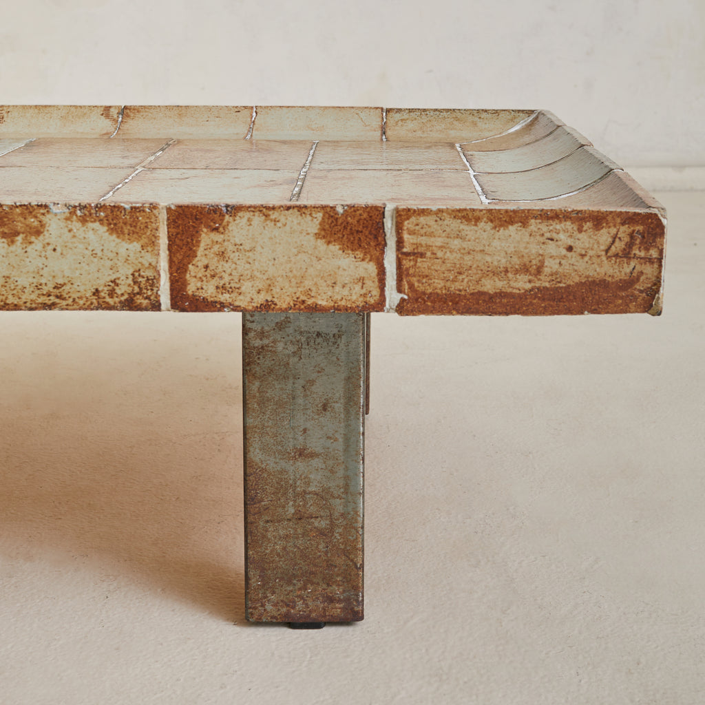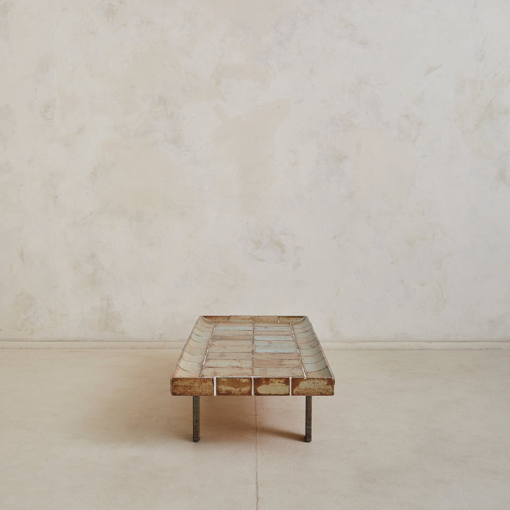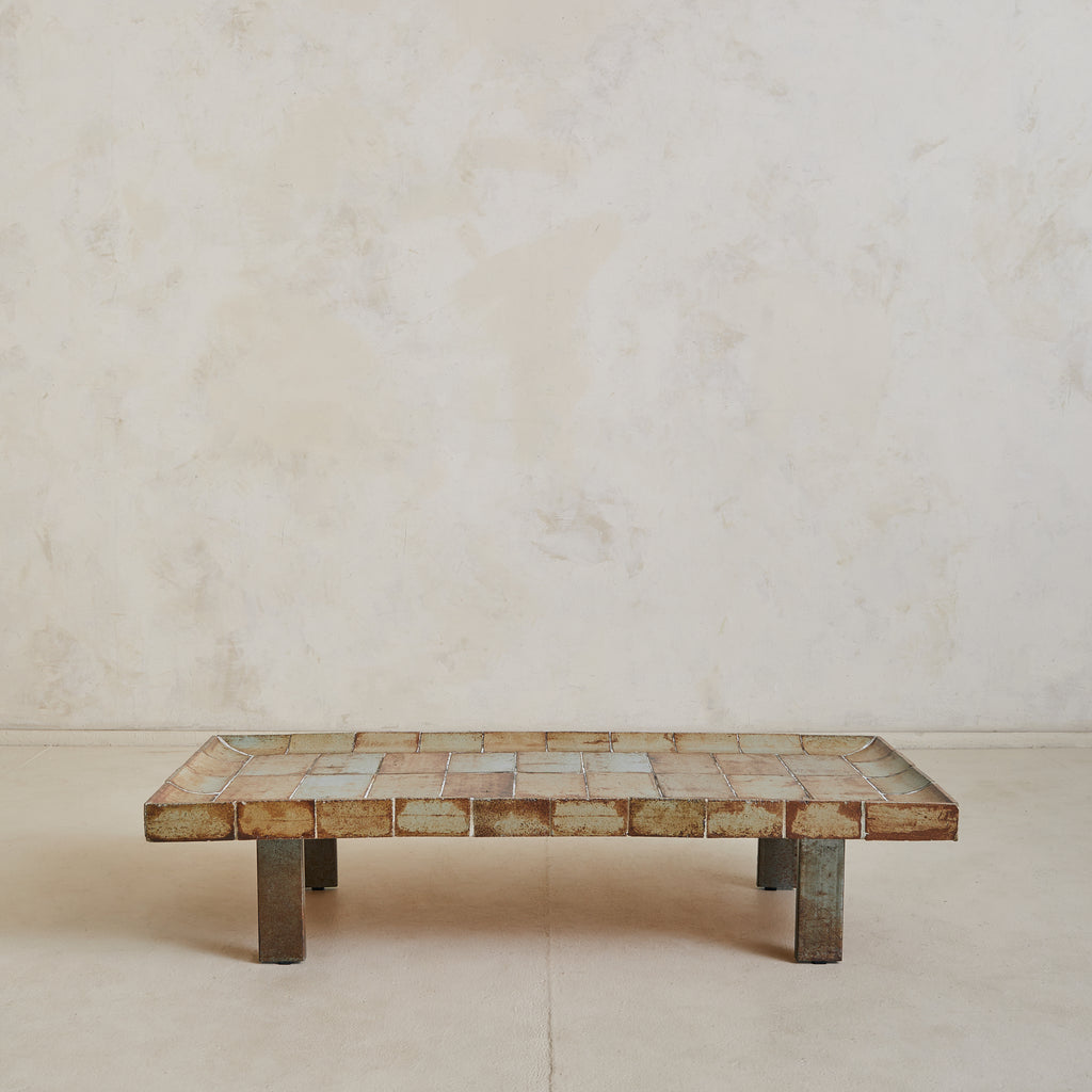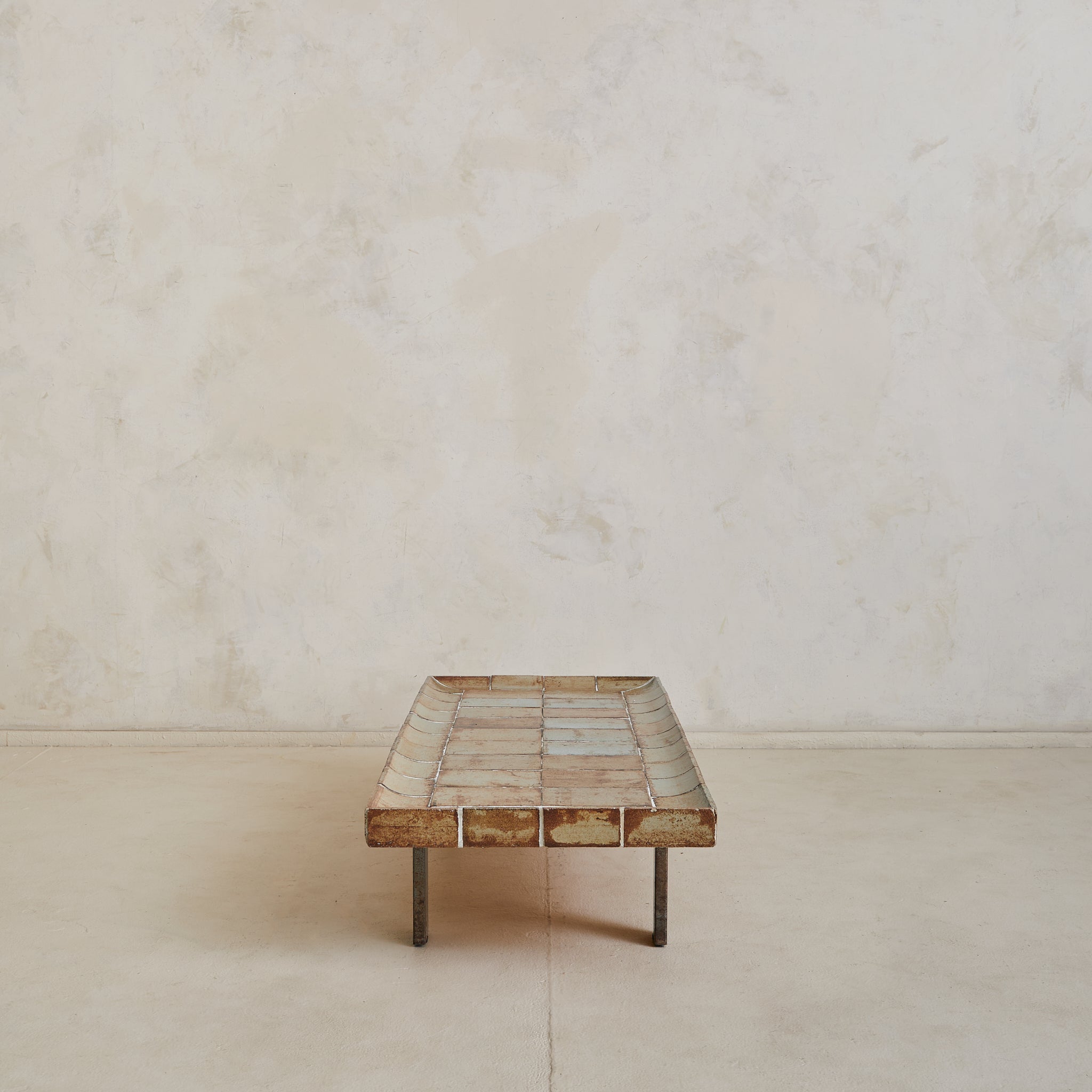 A rare 1960s ‘Cuvette’ coffee table by French ceramicist Roger Capron. This piece features a concave tabletop clad in gorgeous earthenware ceramic tiles from Vallauris, France. The tiles have rich color variations, which include a range of celadon green, sand, and chocolate brown hues. It stands on rectangular patinated steel block legs.