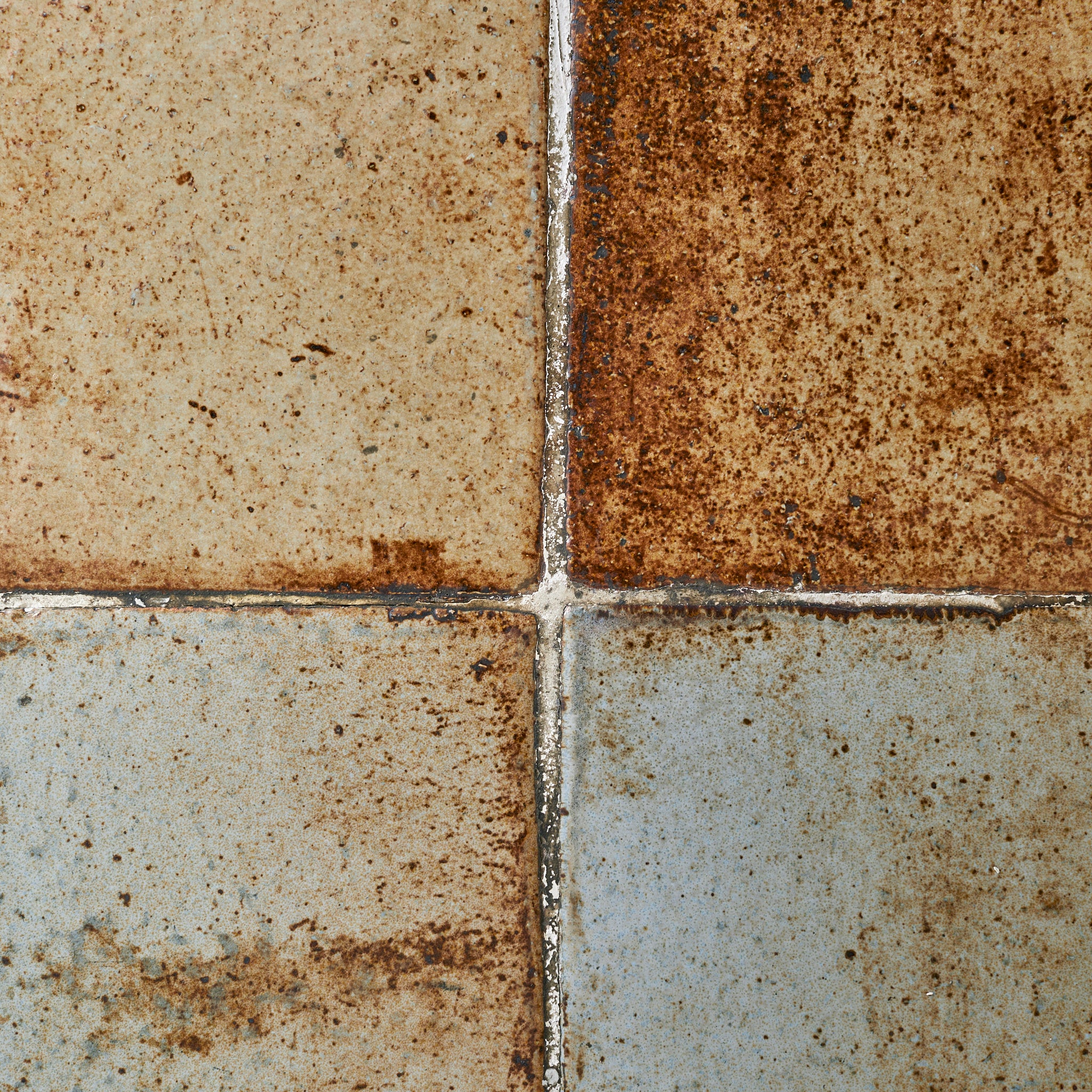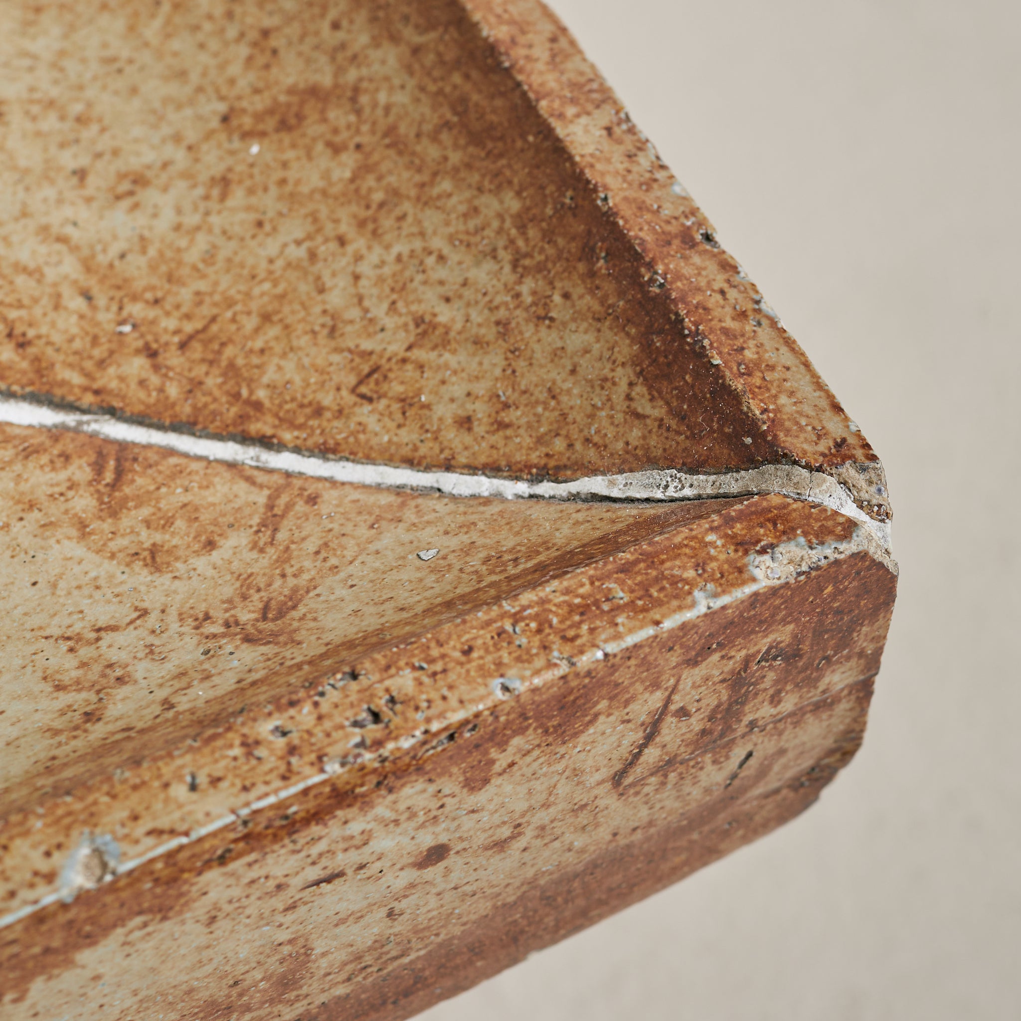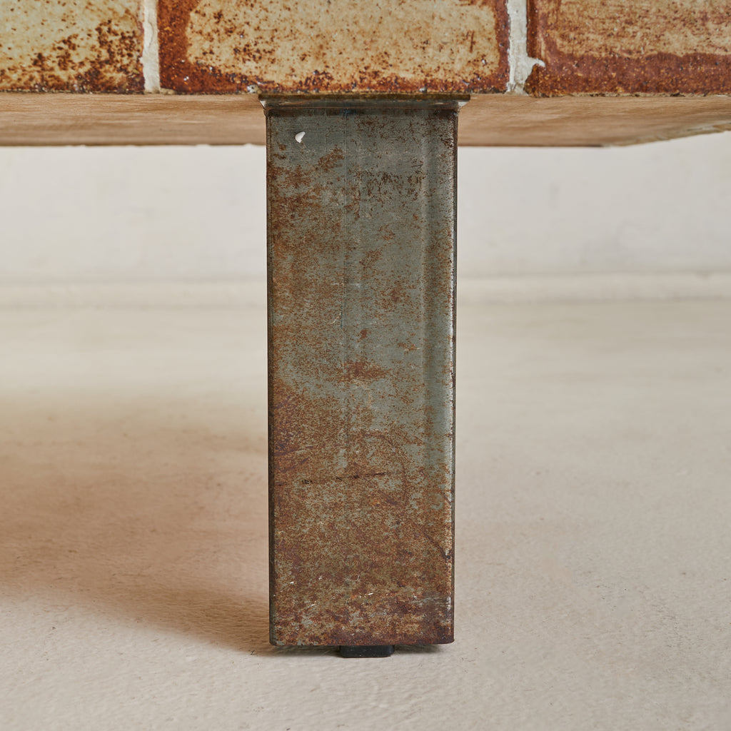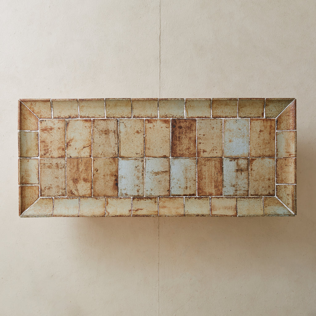 A rare 1960s ‘Cuvette’ coffee table by French ceramicist Roger Capron. This piece features a concave tabletop clad in gorgeous earthenware ceramic tiles from Vallauris, France. The tiles have rich color variations, which include a range of celadon green, sand, and chocolate brown hues. It stands on rectangular patinated steel block legs.