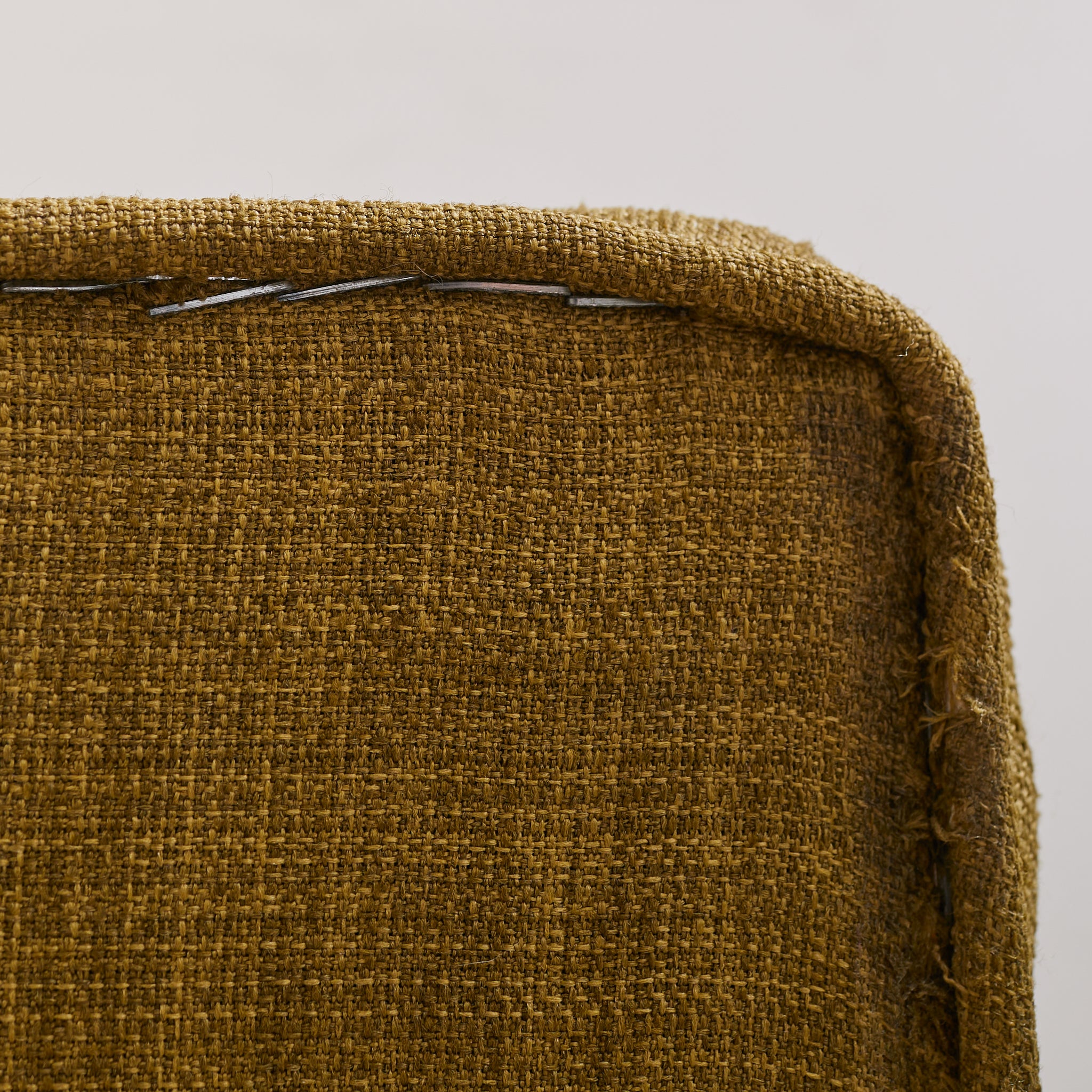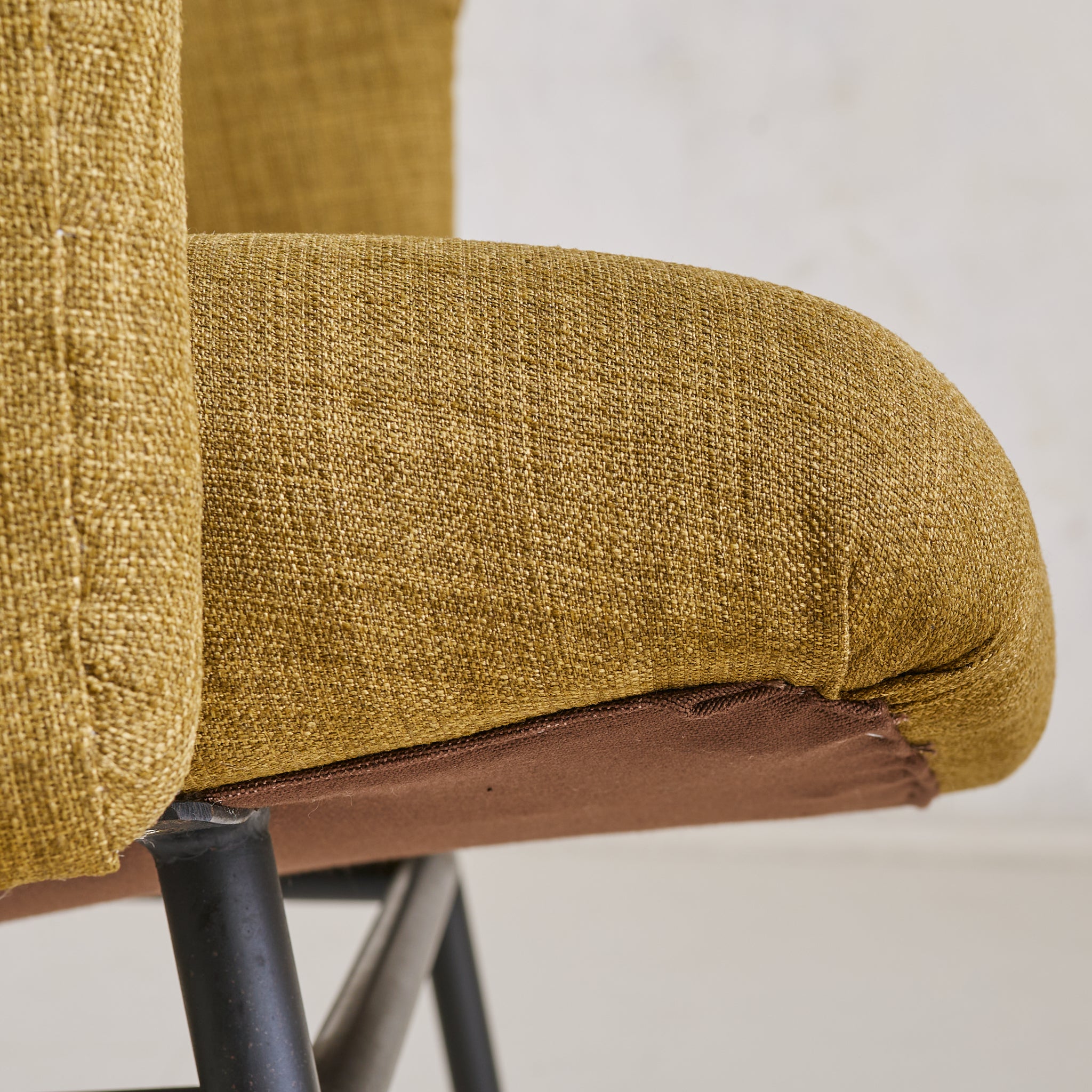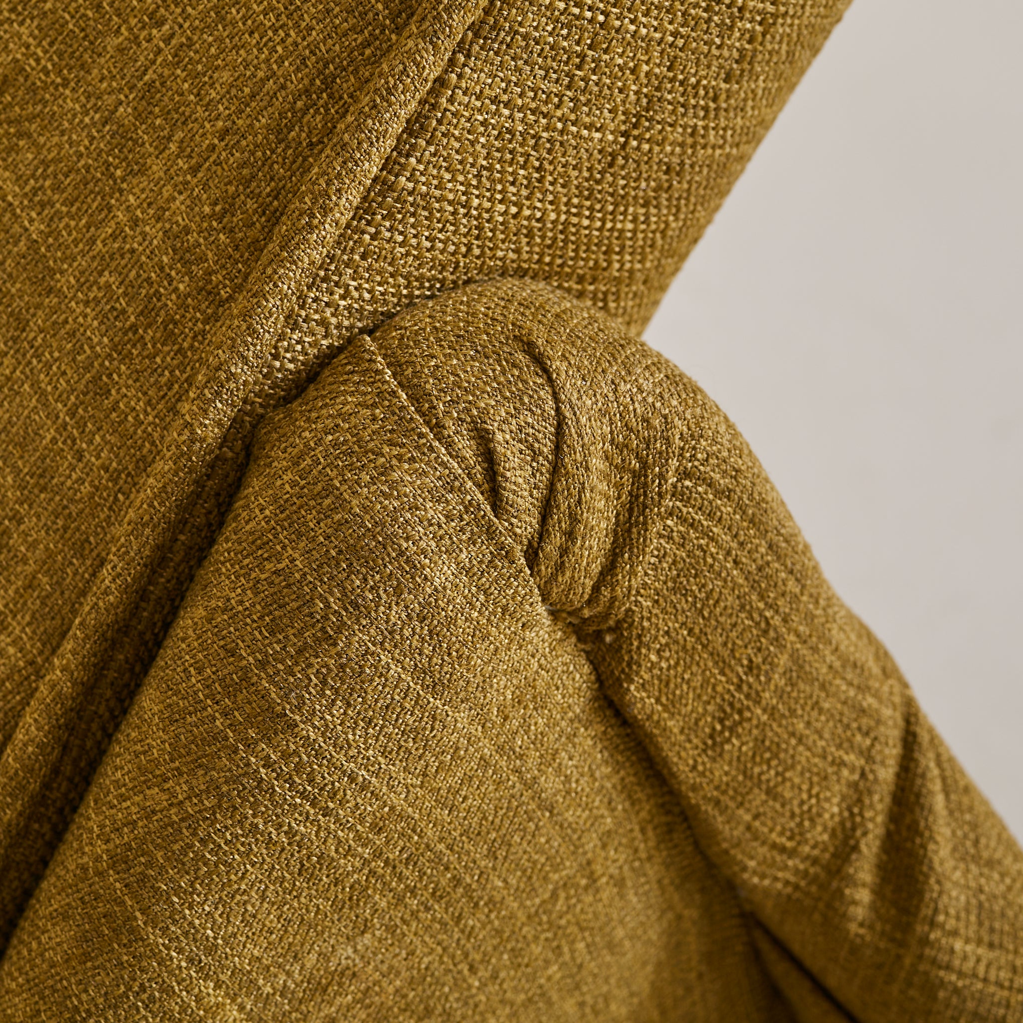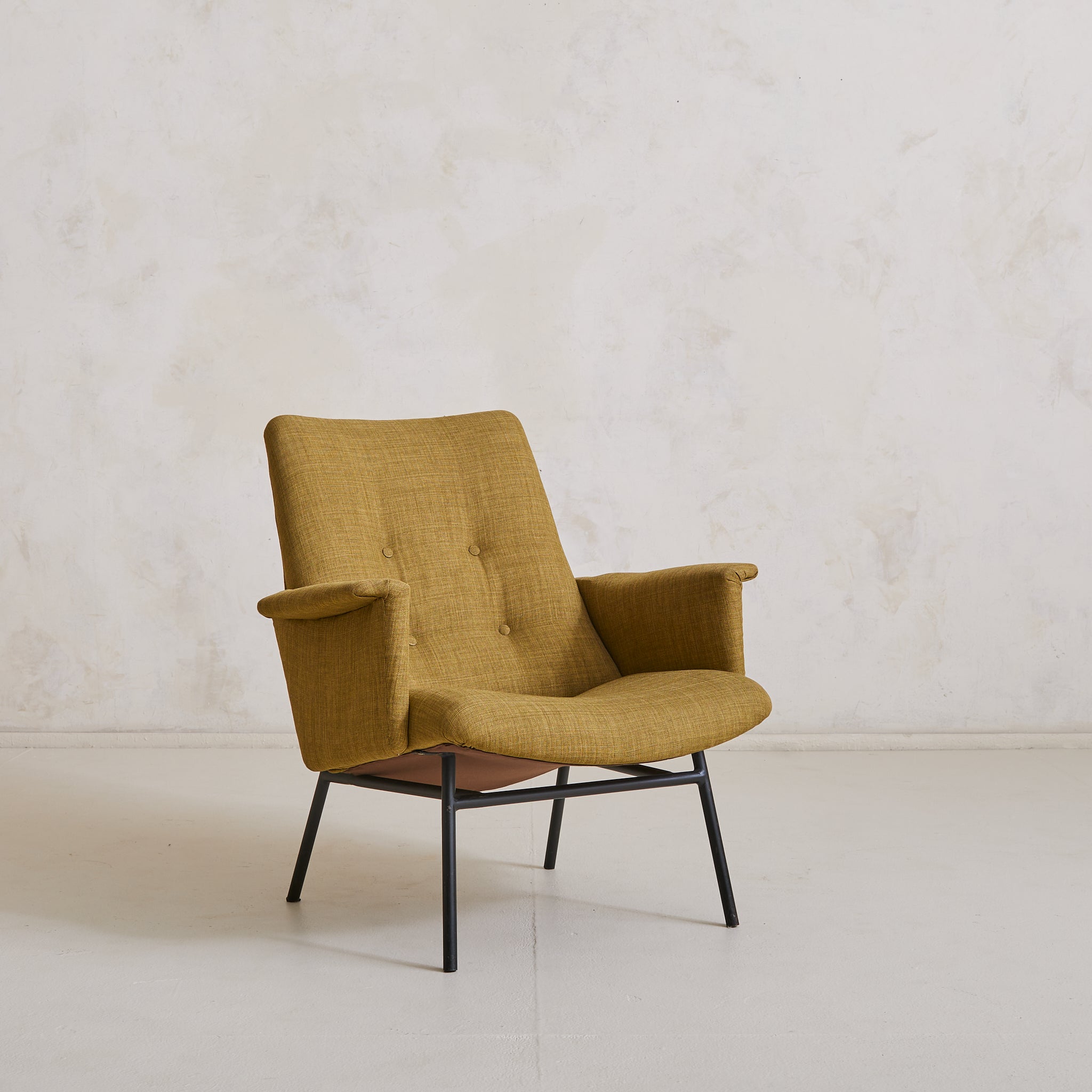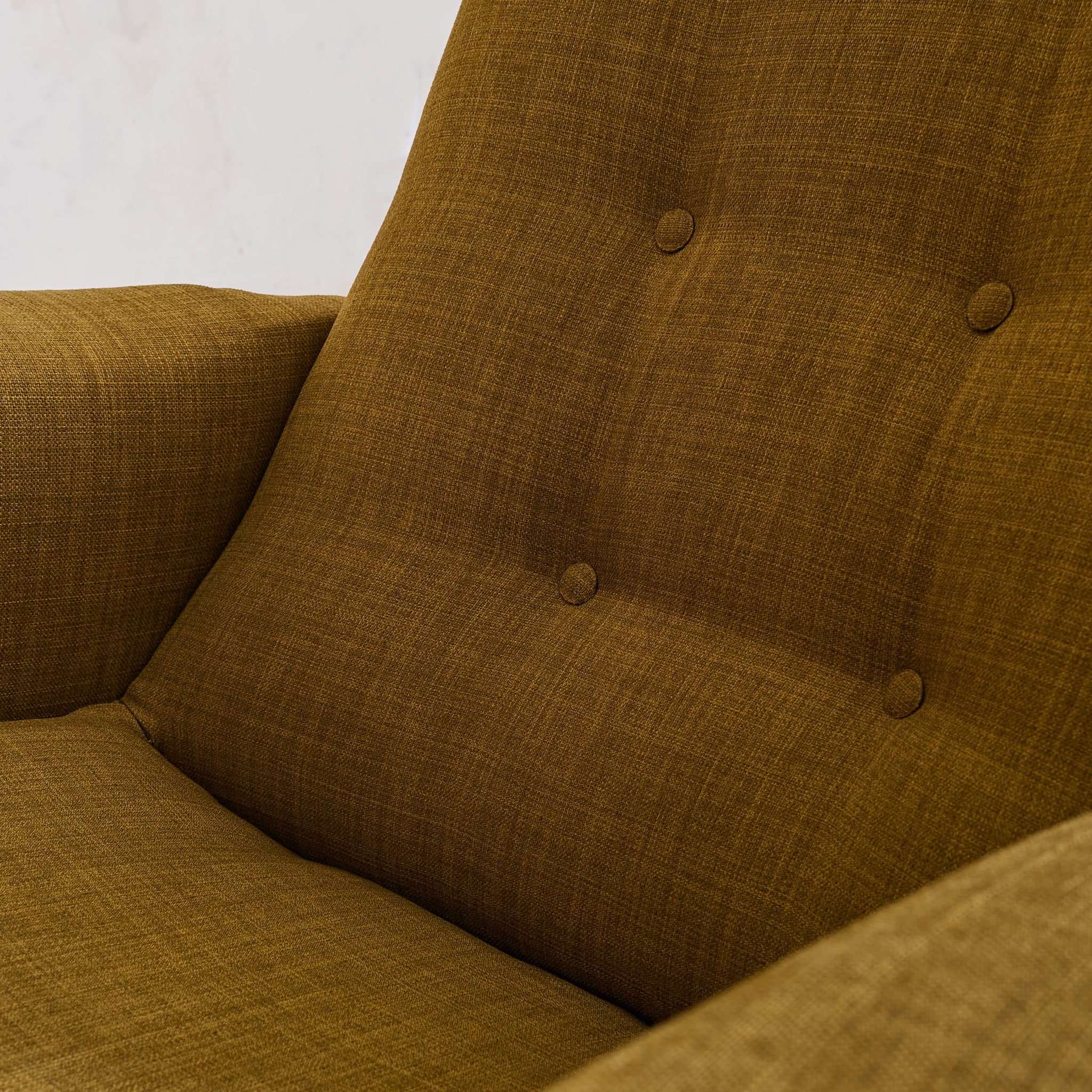 Its sculptural seat, angled back, and gently winged armrests are upholstered in a woven olive green fabric that adds rich texture and warmth, complemented by button-tufted detailing.