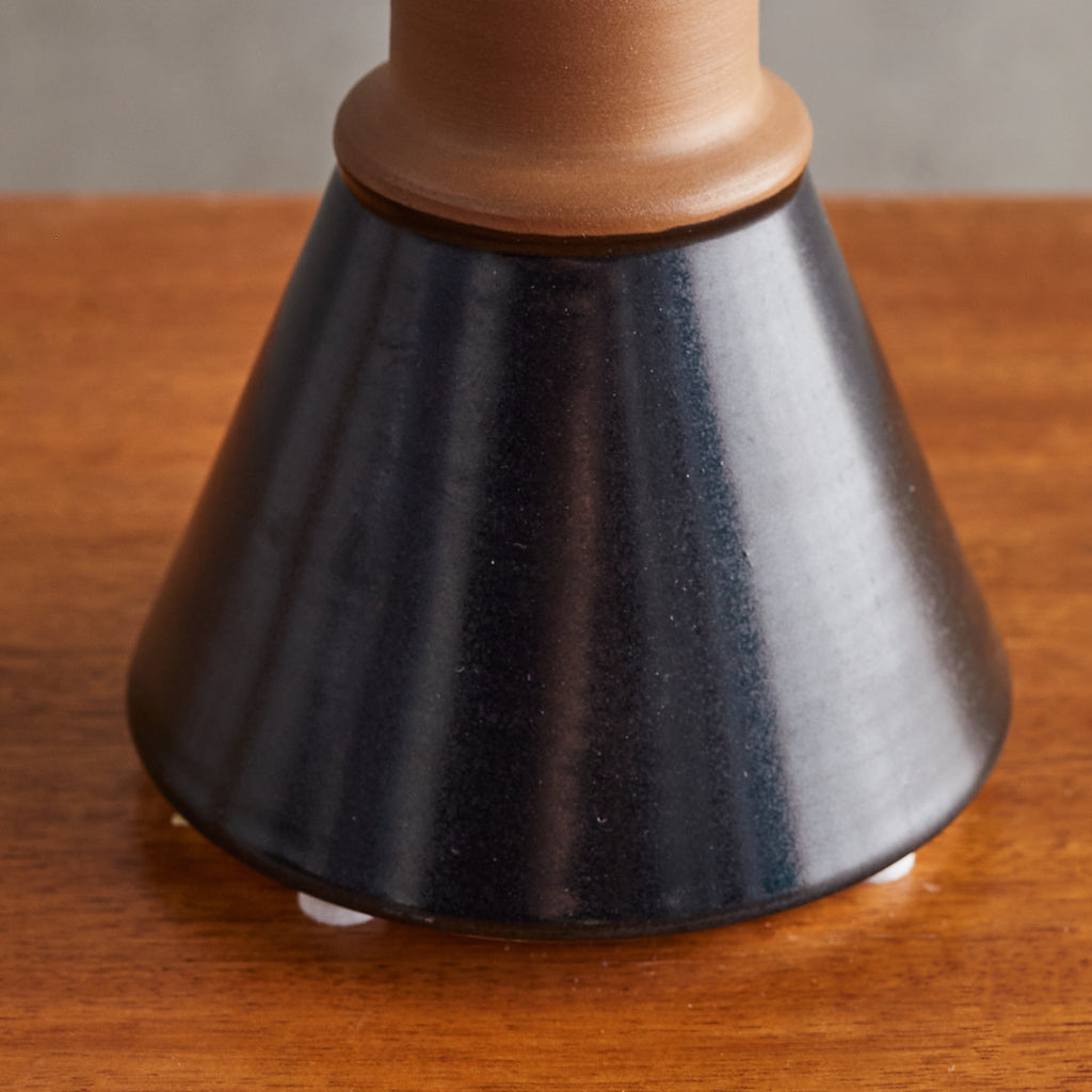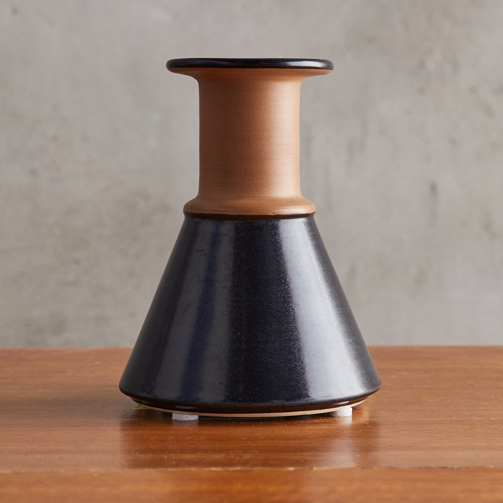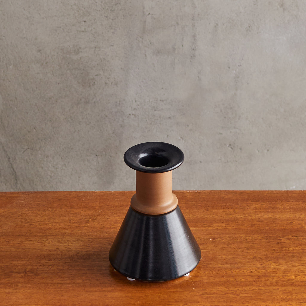 An Italian ceramic vase designed by Franco Bucci for Laboratorio Pesaro in the 1960s. Its sculptural form features a conical base that tapers upward to meet a cylindrical neck with a flared, disc-like opening. The glaze transitions from a matte terracotta finish at the neck to a rich, inky black at the base, creating a striking contrast that emphasizes its geometric silhouette. Signed on the underside.