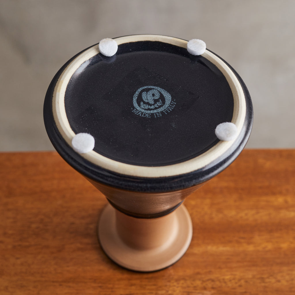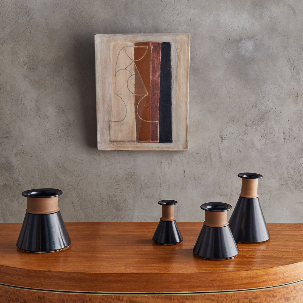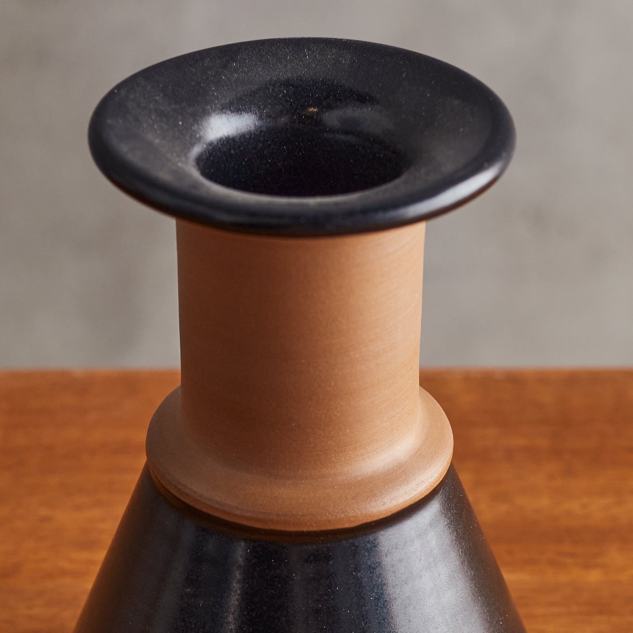 An Italian ceramic vase designed by Franco Bucci for Laboratorio Pesaro in the 1960s. Its sculptural form features a conical base that tapers upward to meet a cylindrical neck with a flared, disc-like opening. The glaze transitions from a matte terracotta finish at the neck to a rich, inky black at the base, creating a striking contrast that emphasizes its geometric silhouette. Signed on the underside.