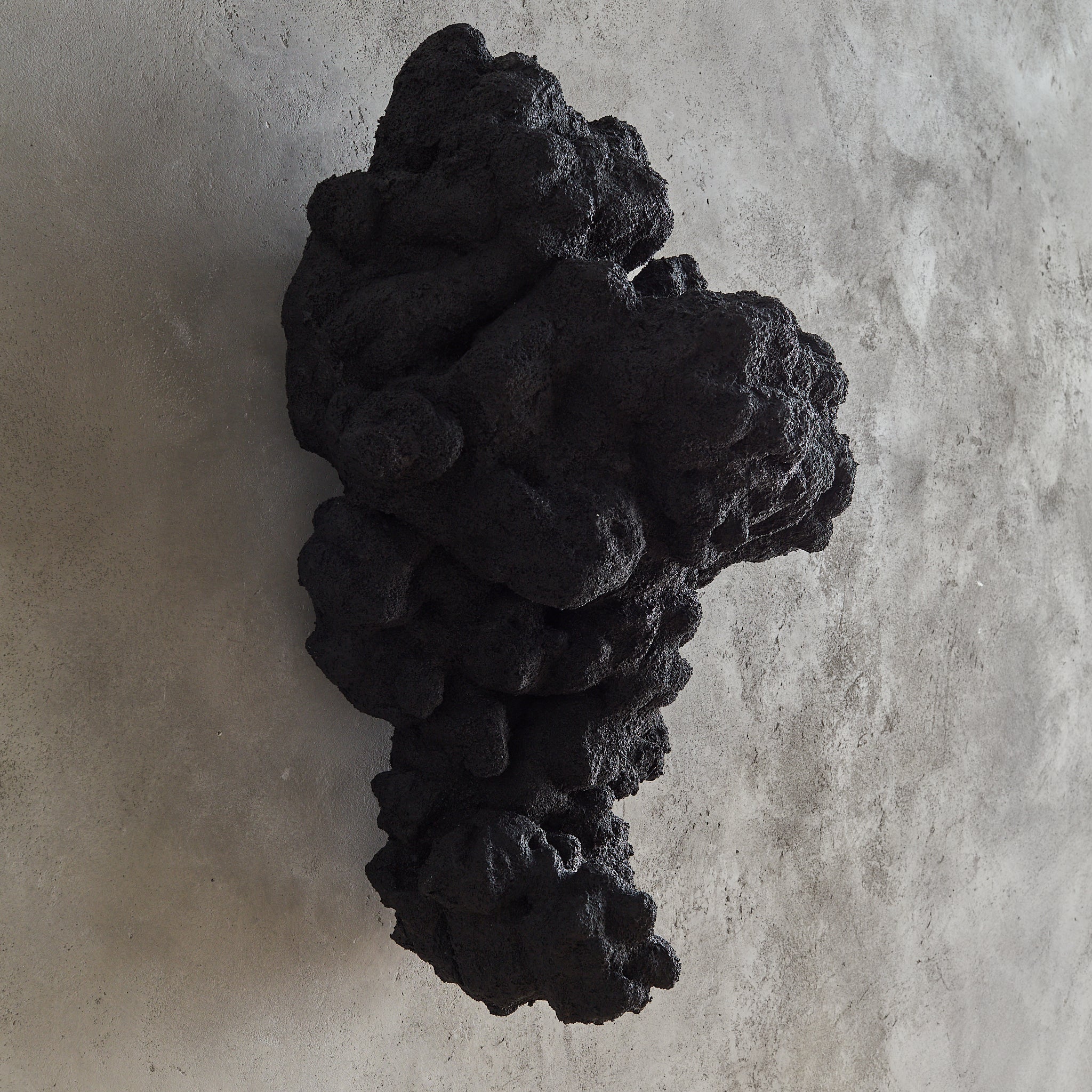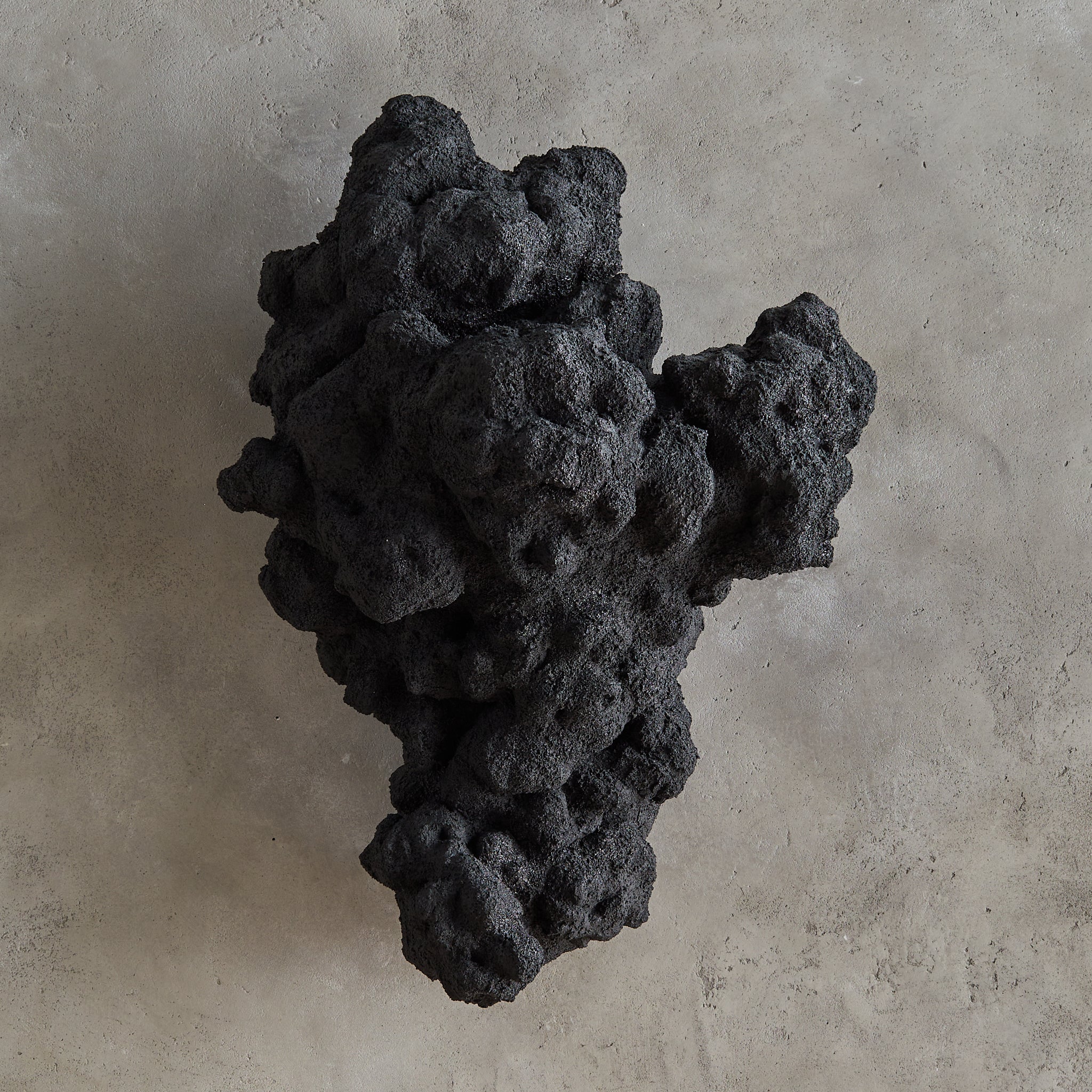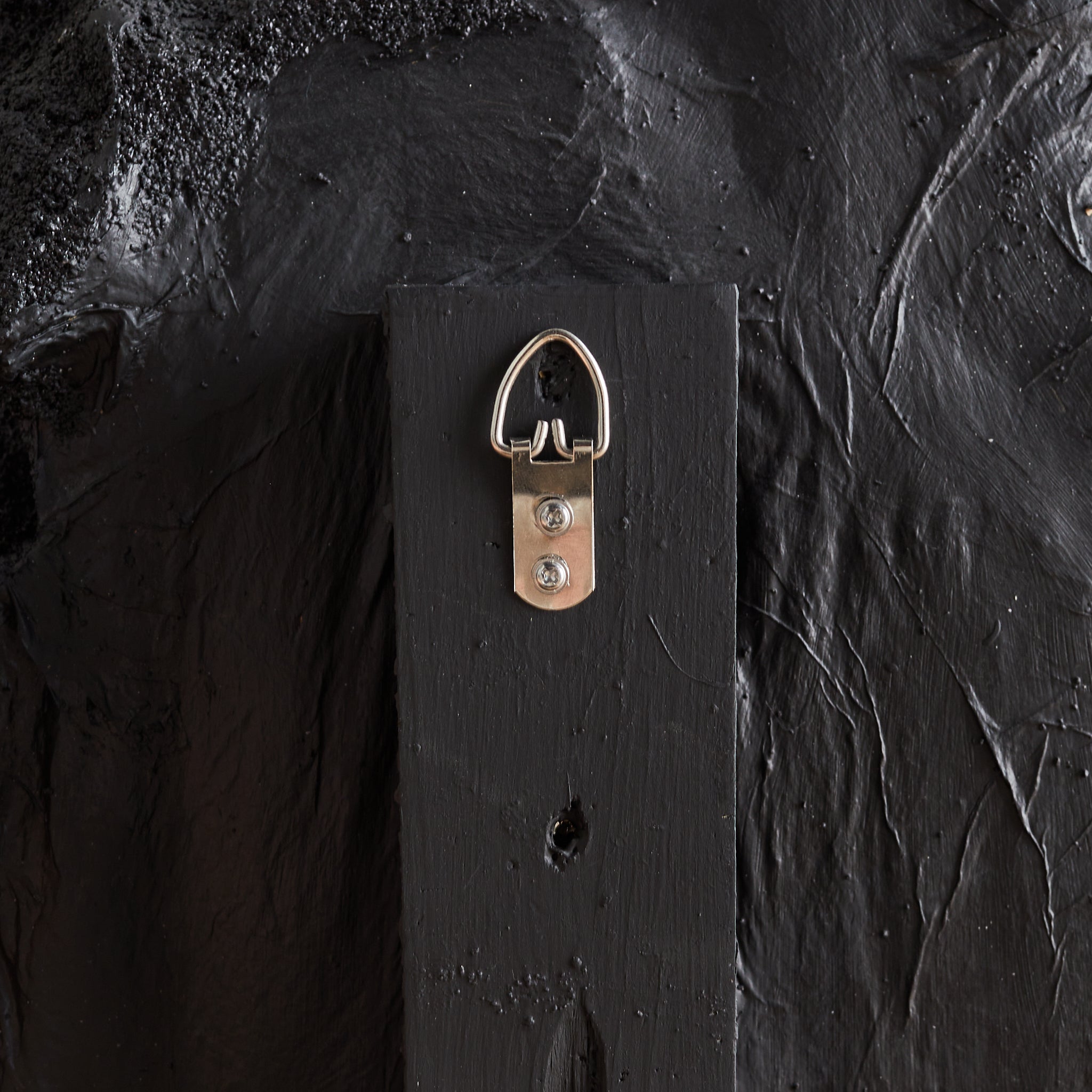 A textural wall sculpture by Canadian artist Erin Vincent, 2020. Composed of acrylic, sand, foam, and wood, the piece reads like a geological formation—cavernous, matte, and deeply dimensional. Over 3 feet tall and two feet wide, it recalls cooled lava or fossilized coral. Hanging hardware included on the backside.
