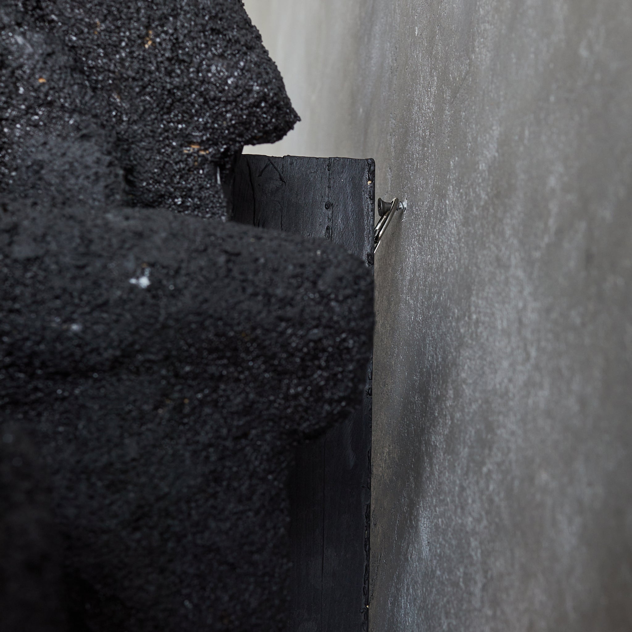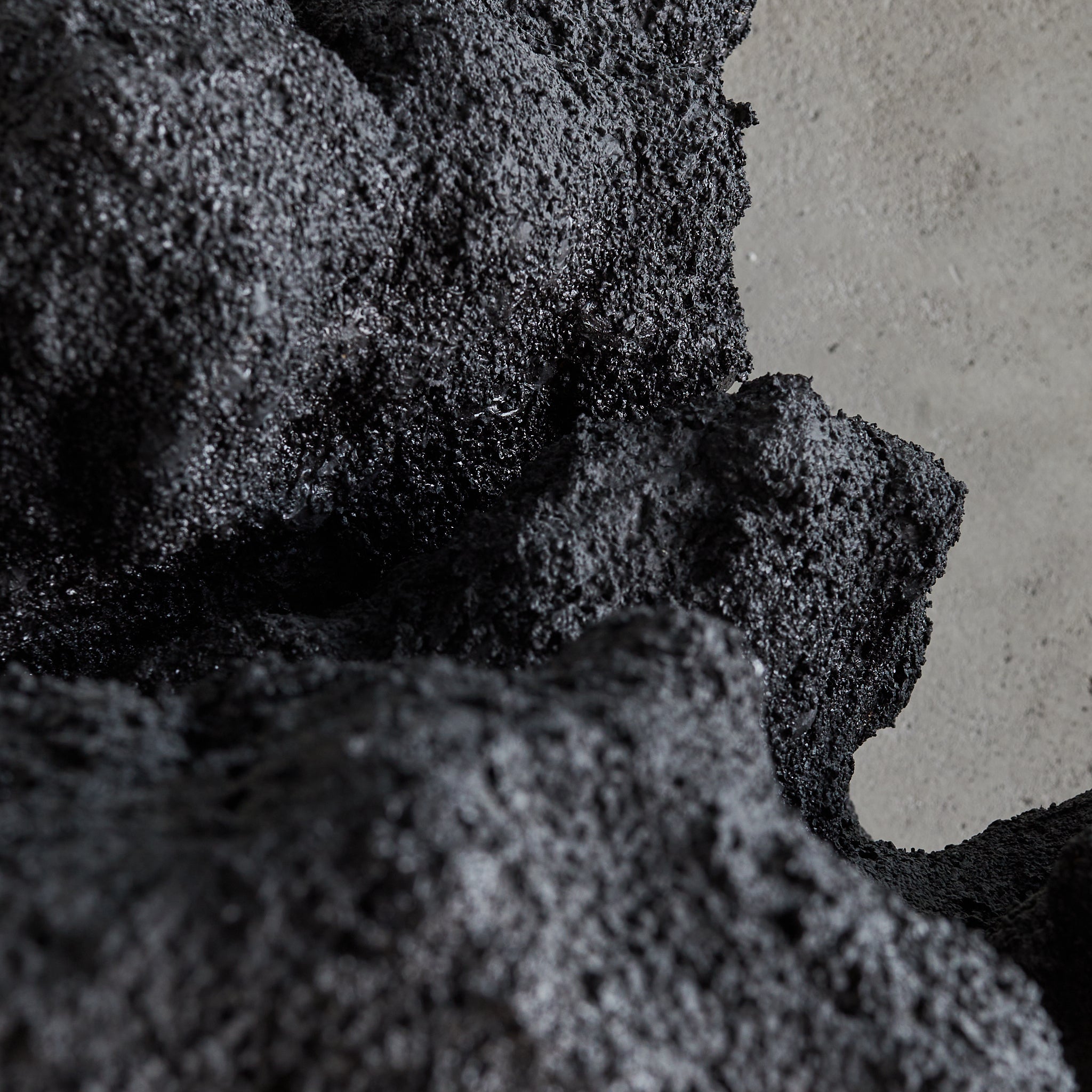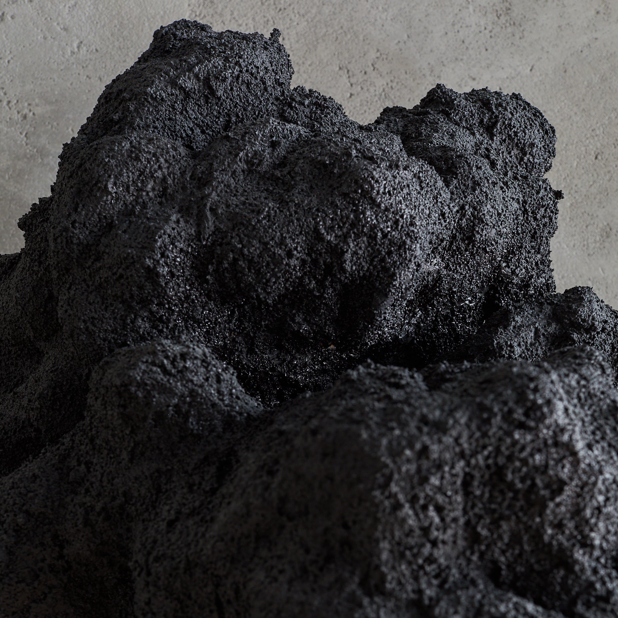 A textural wall sculpture by Canadian artist Erin Vincent, 2020. Composed of acrylic, sand, foam, and wood, the piece reads like a geological formation—cavernous, matte, and deeply dimensional. Over 3 feet tall and two feet wide, it recalls cooled lava or fossilized coral. Hanging hardware included on the backside.