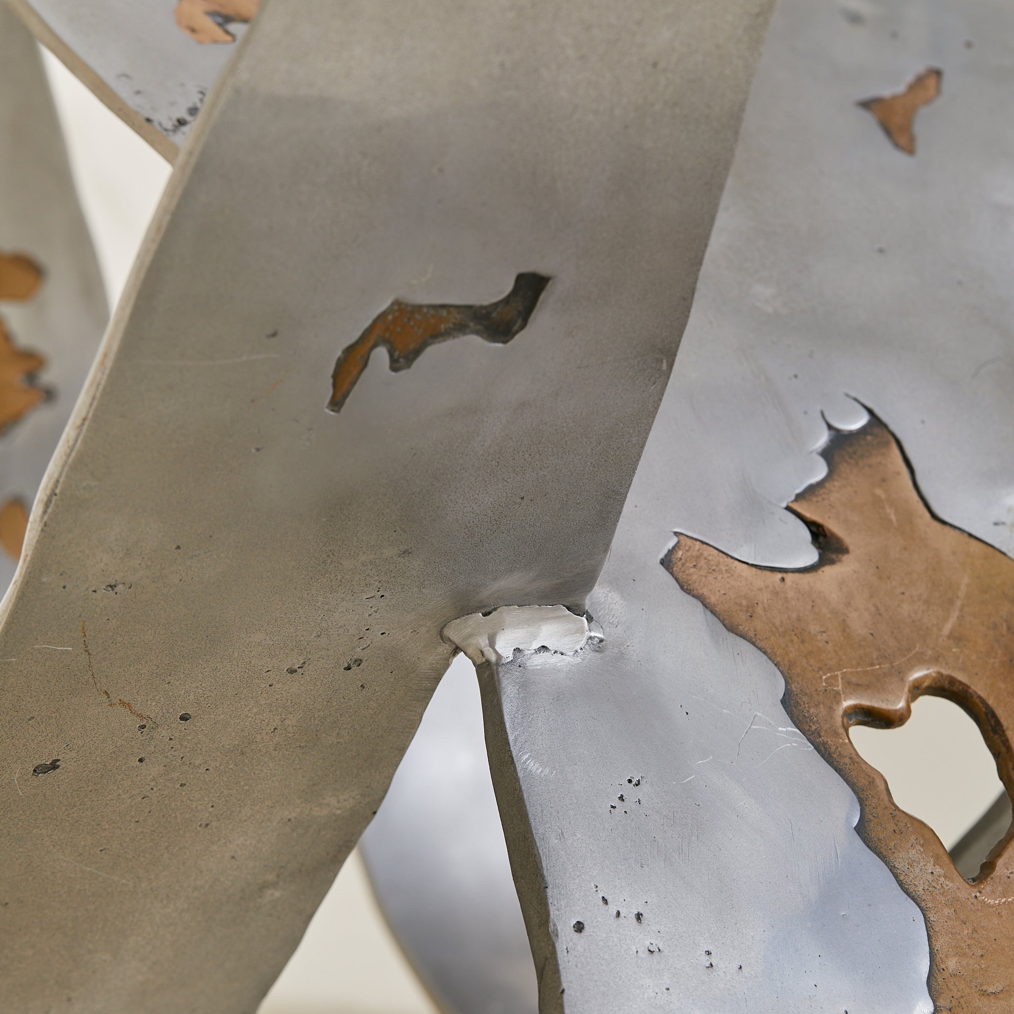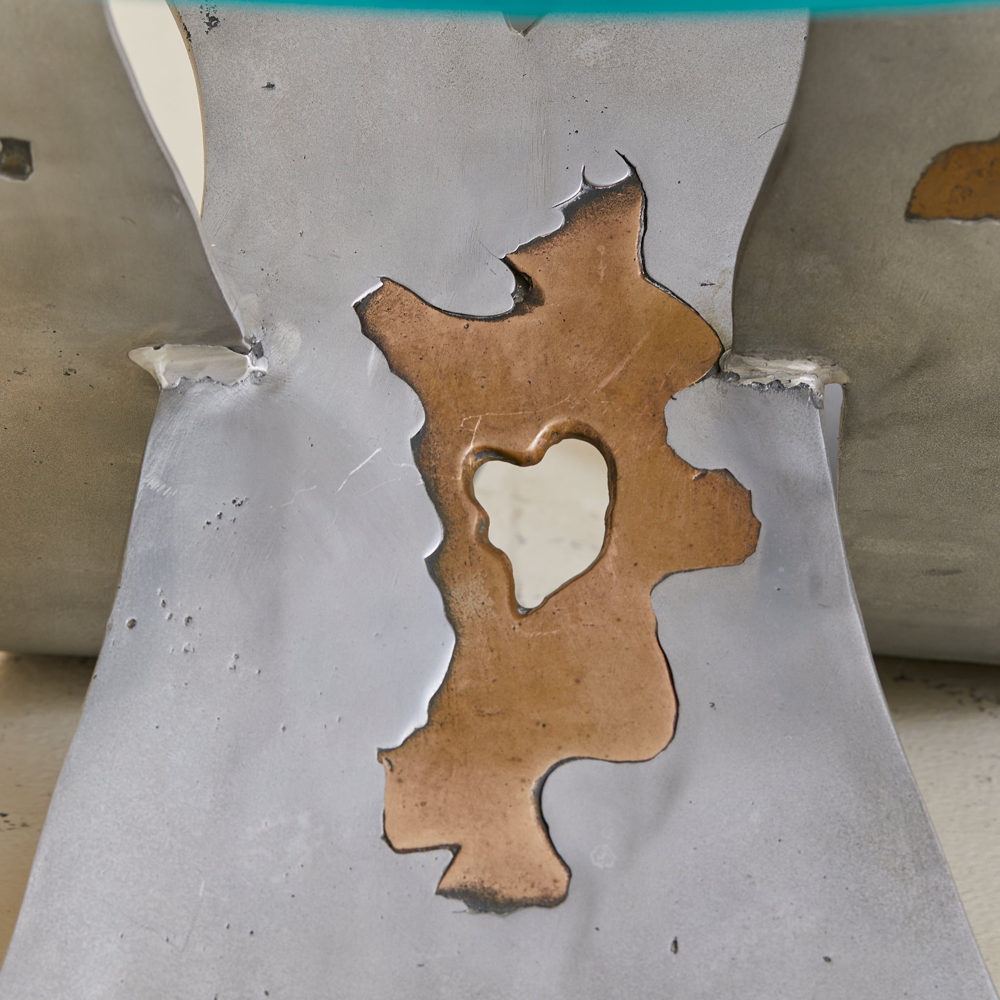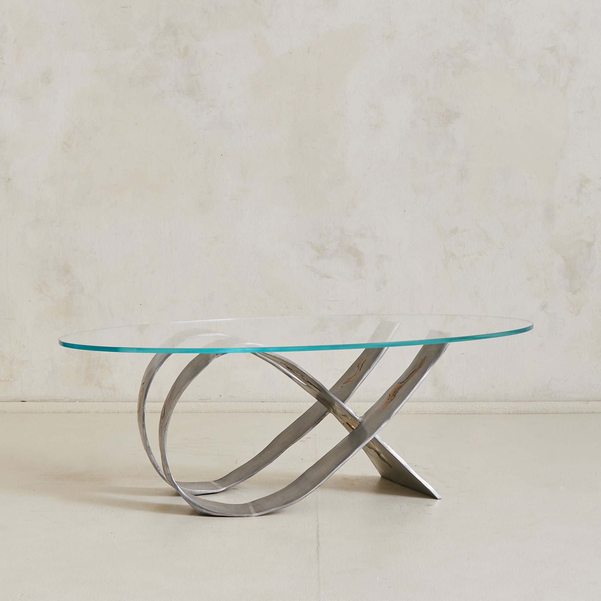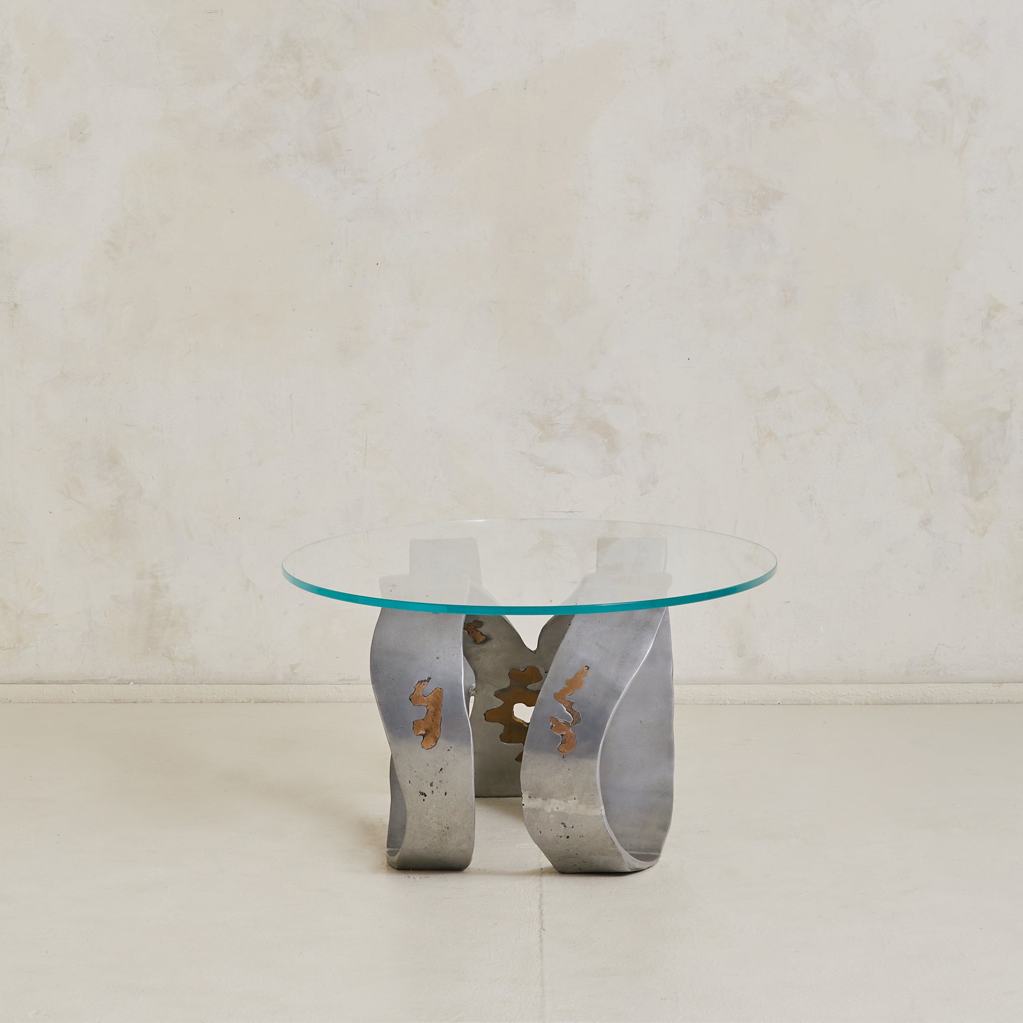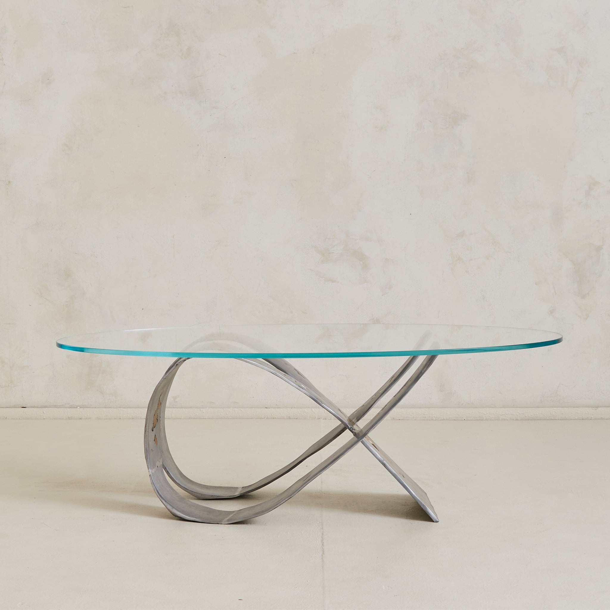 A sculptural Spanish coffee table from the 1980s, attributed to David Marshall. Cast in mixed metals, the sinuous base interweaves aluminum and brass in a fluid, architectural gesture—part structure, part abstraction.