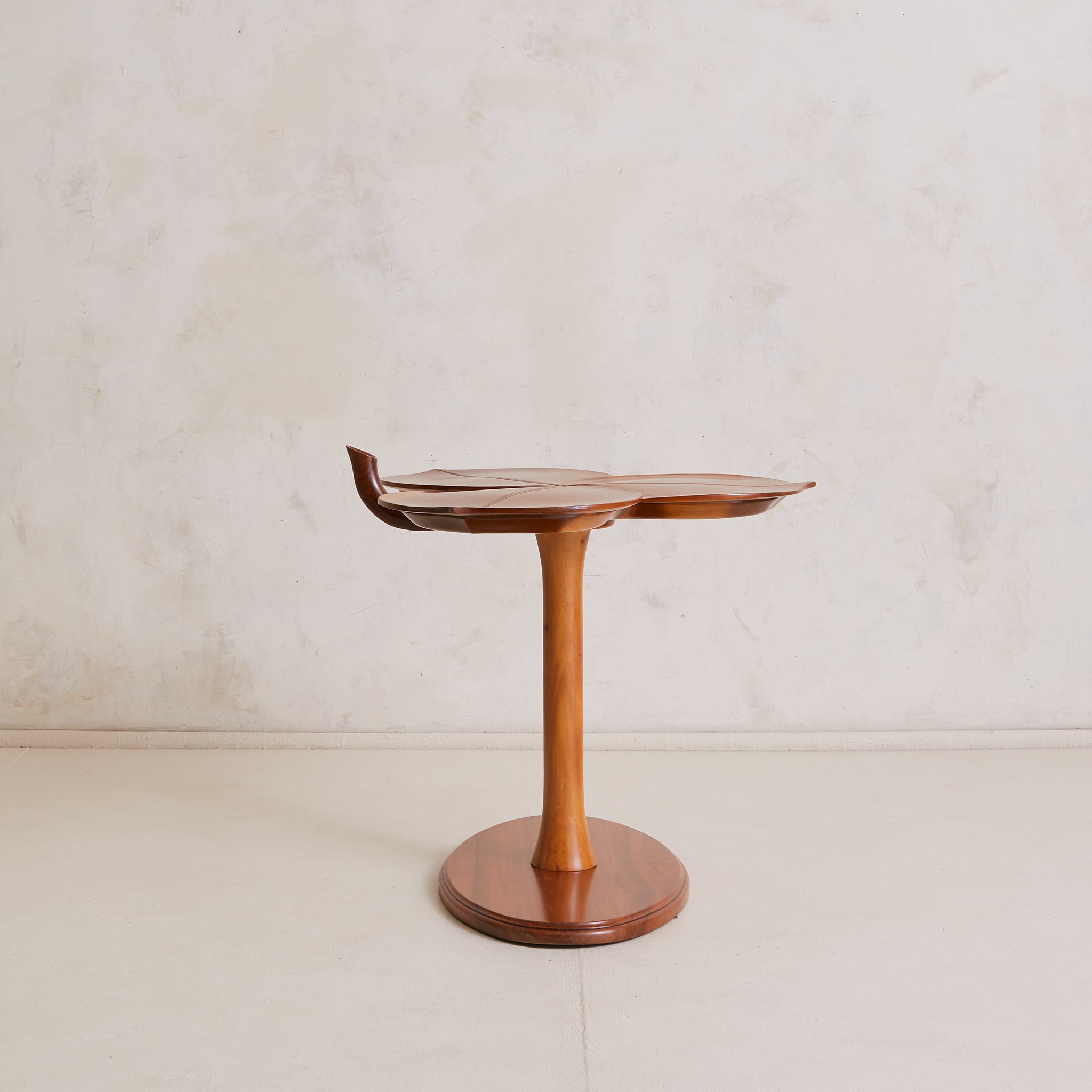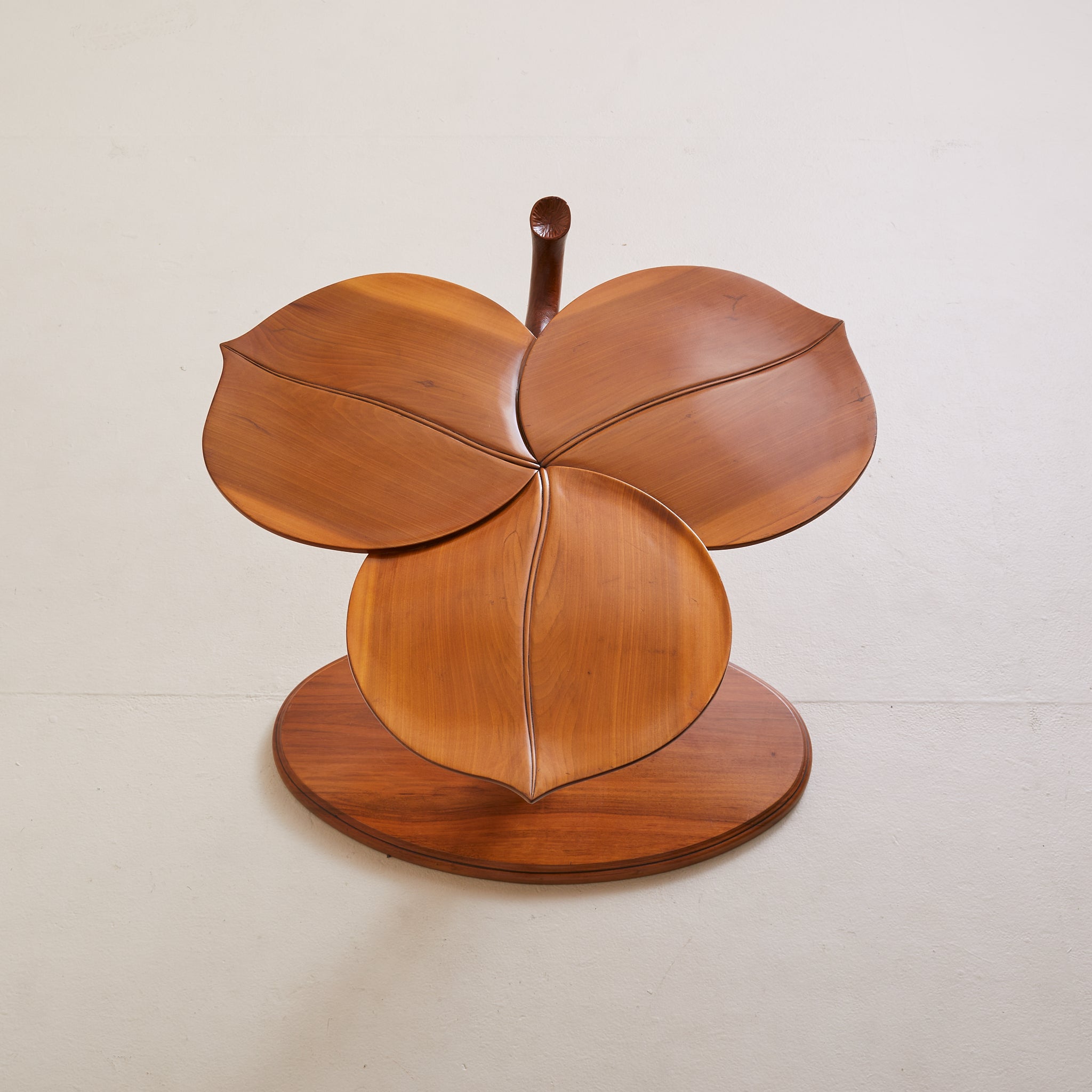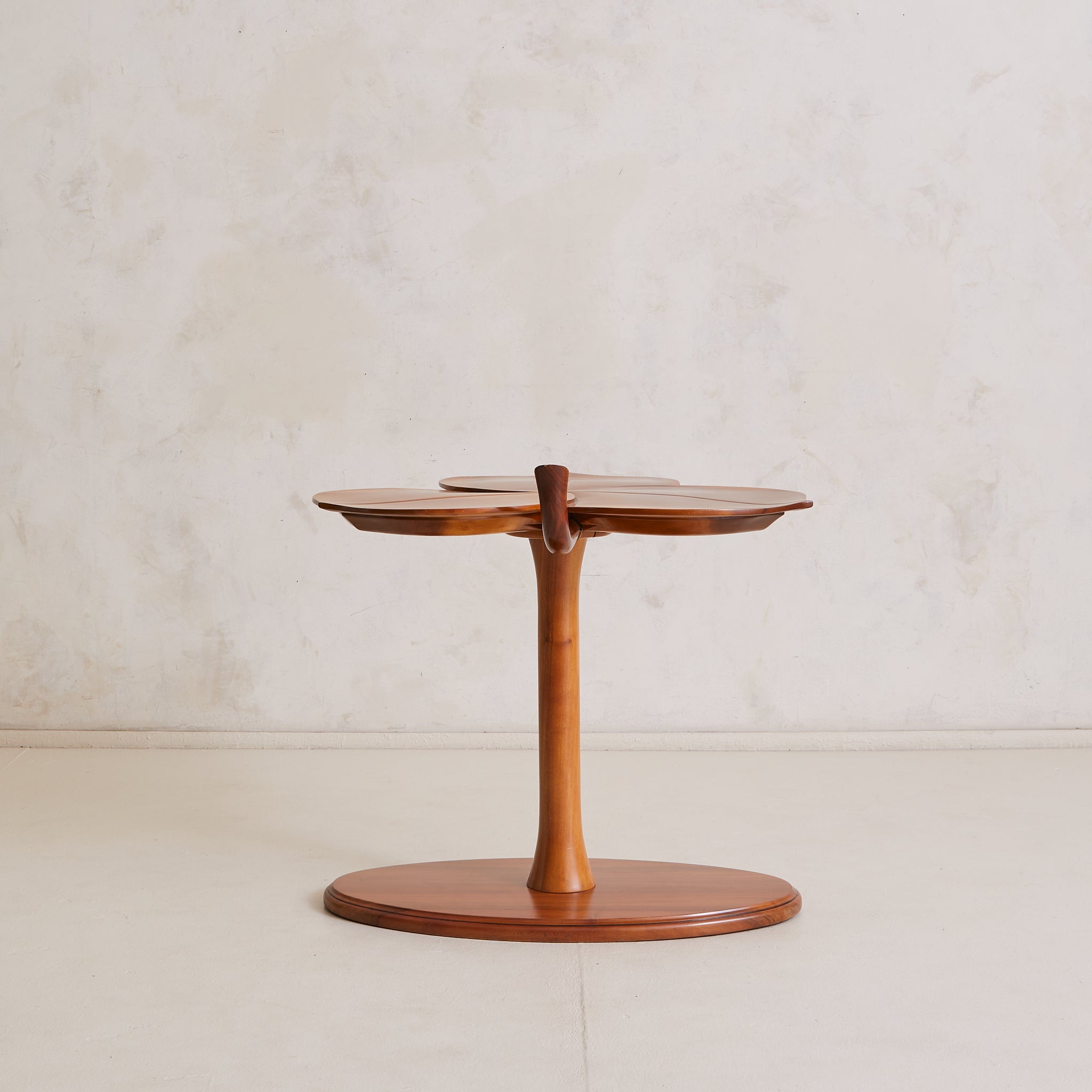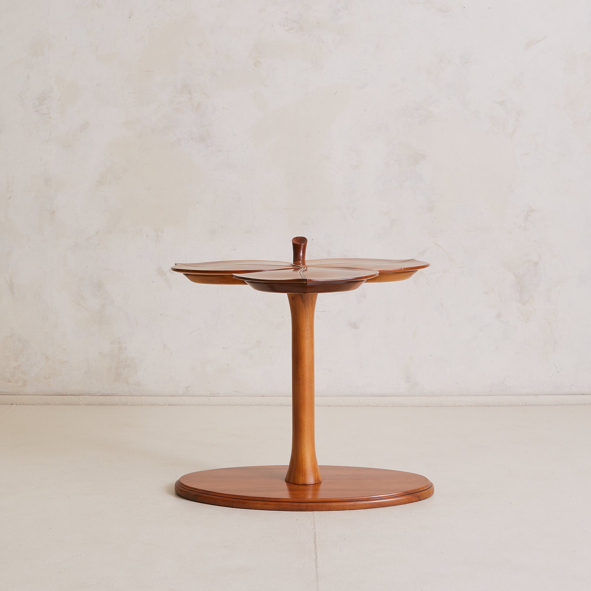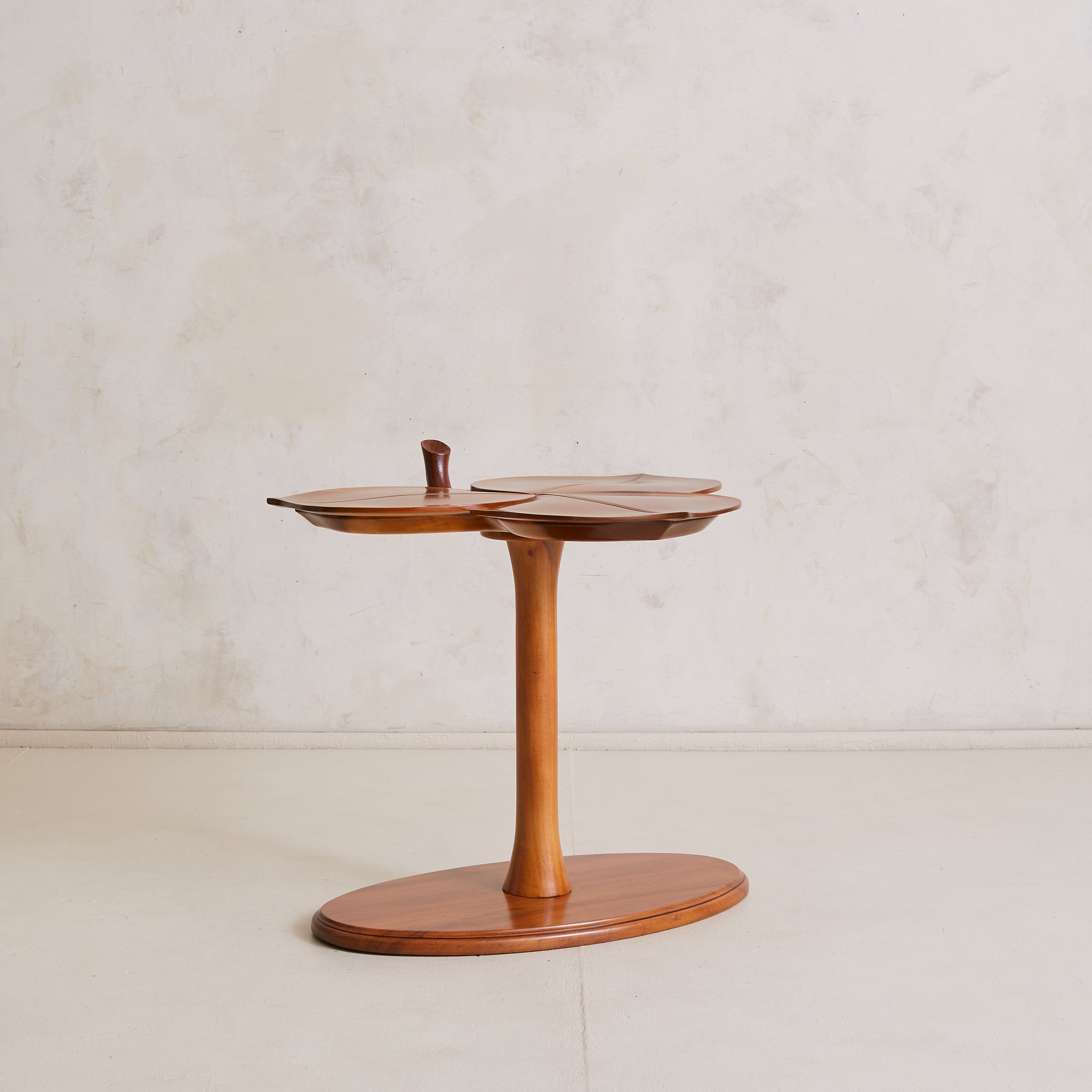 A sculptural ode to nature, this 1950s Swedish swivel table takes the form of a clover in full bloom. Crafted in blonde walnut with a rich, luminous finish, the tabletop unfolds in three gently cupped leaves—each hand-carved with fluid grain that converges in a seamless central join. The pedestal rises from an oval base, anchoring the composition with balance and ease.
