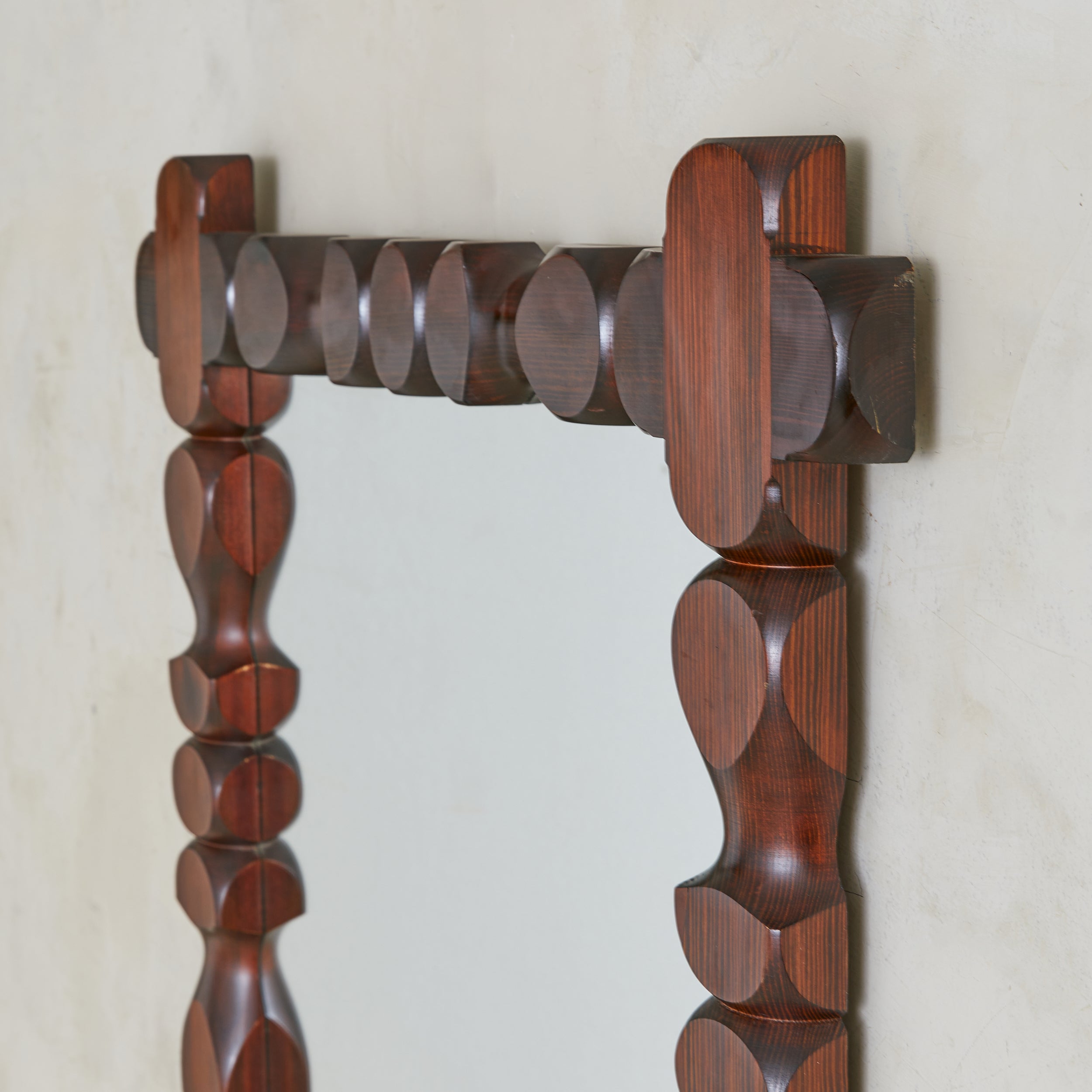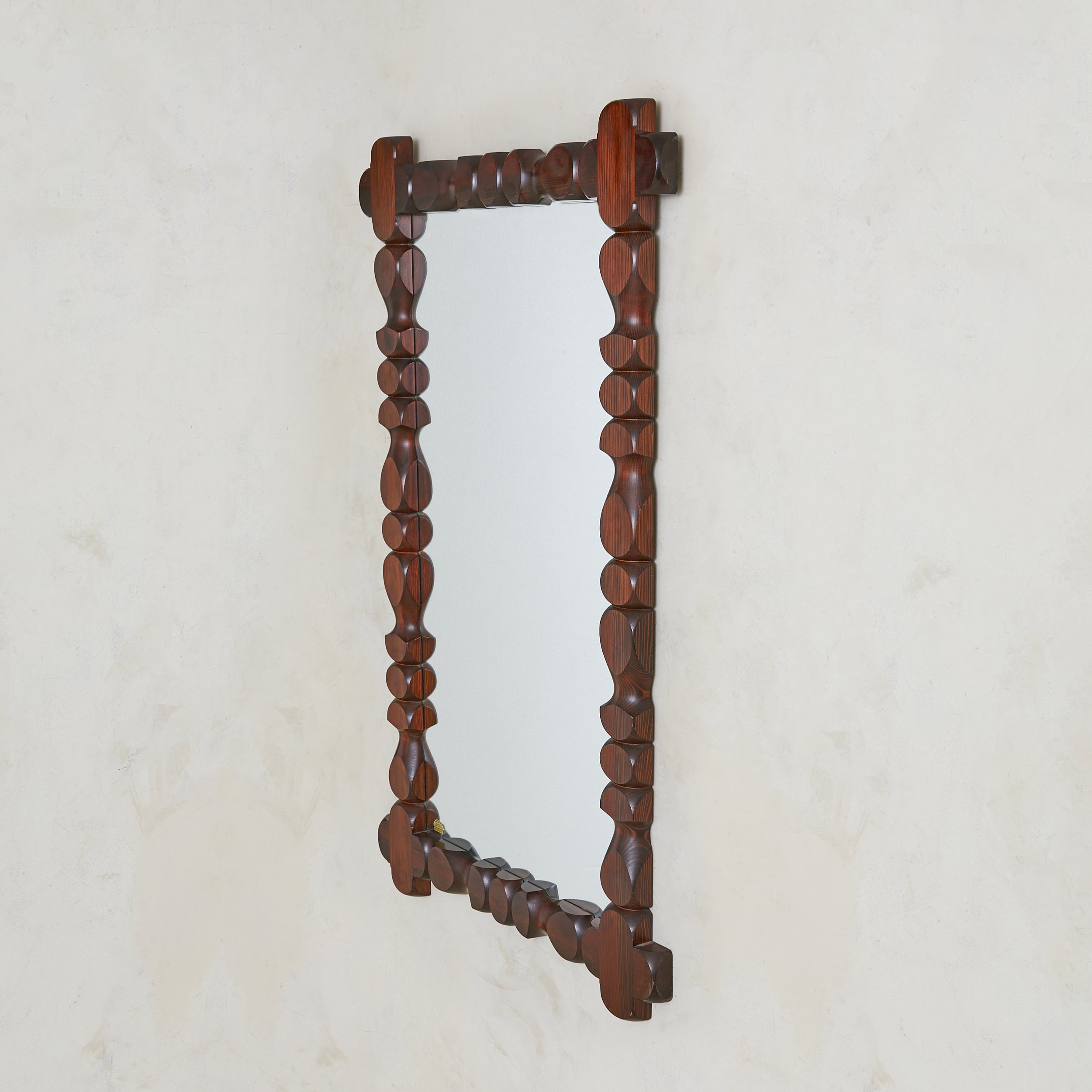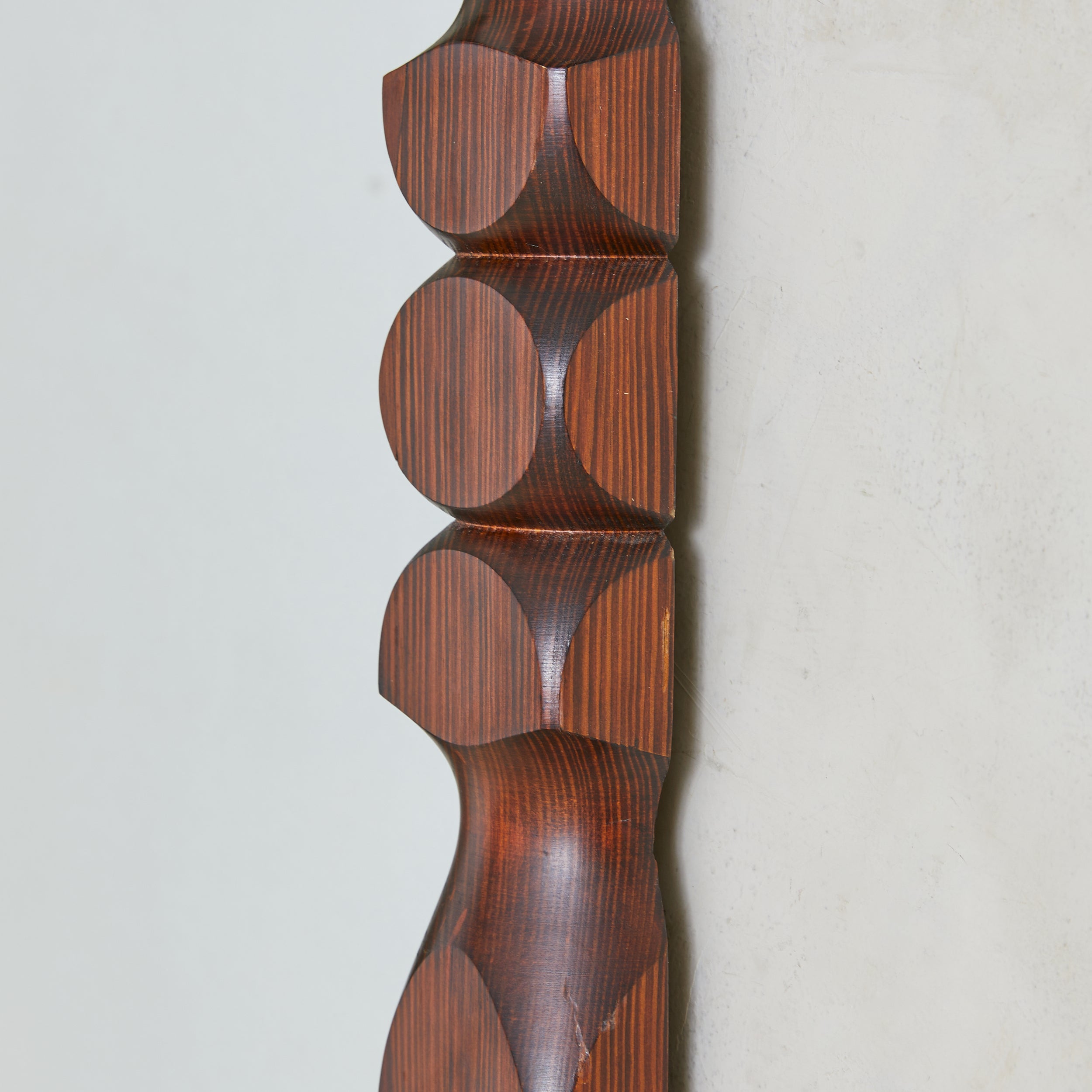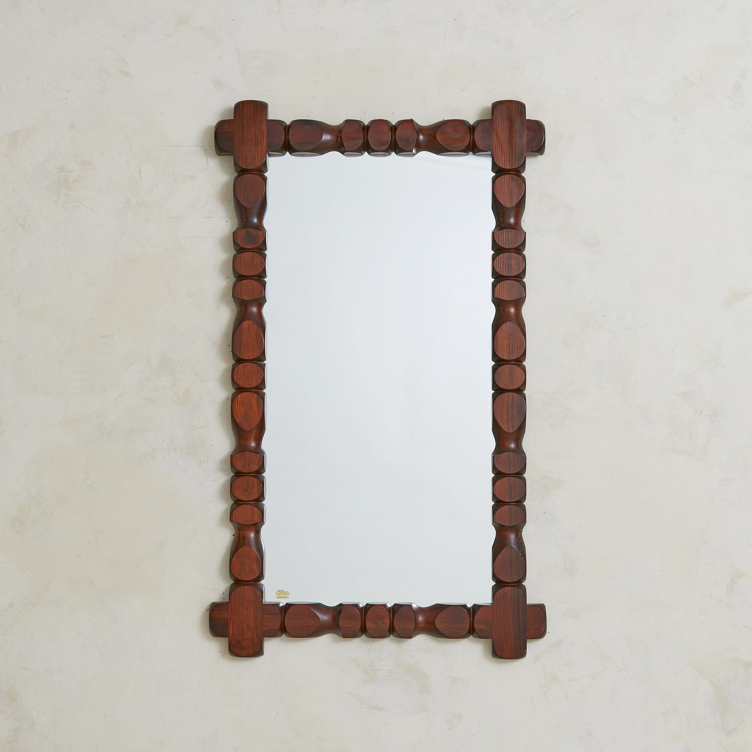 A 1970s Swedish wall mirror by Glas Mäster Markaryd. Crafted from hand-carved pine, the frame features rounded and faceted forms—ovals, discs, and softened blocks—creating a rhythmic, sculptural profile. Finished in a deep walnut-toned stain that highlights the pine’s grain patterns, it borders the original floatglass.