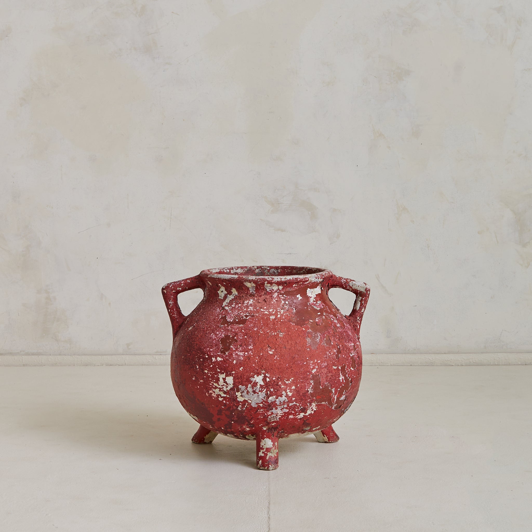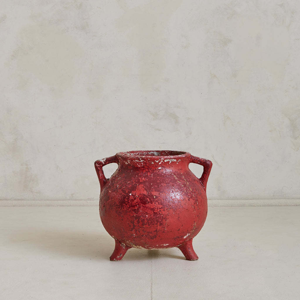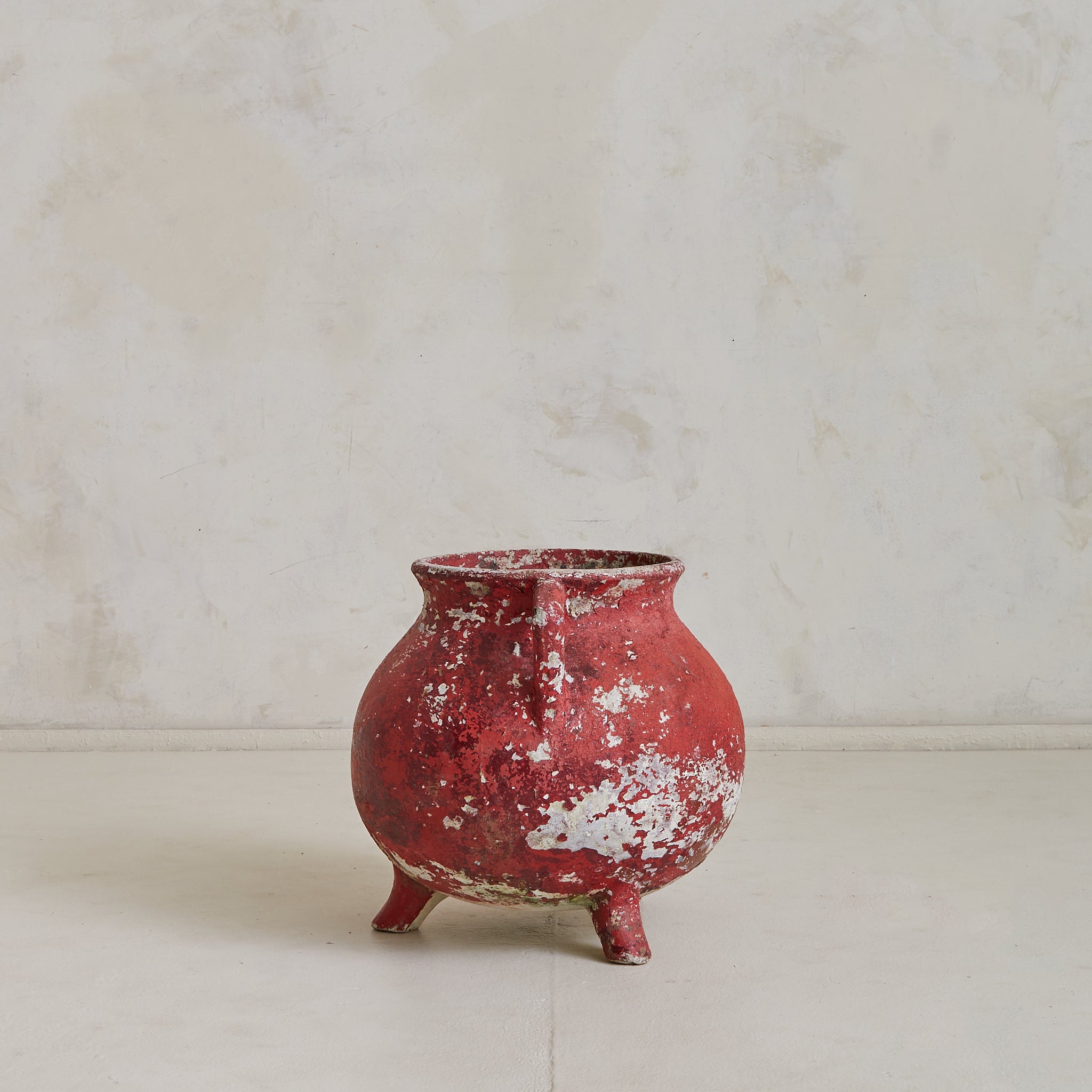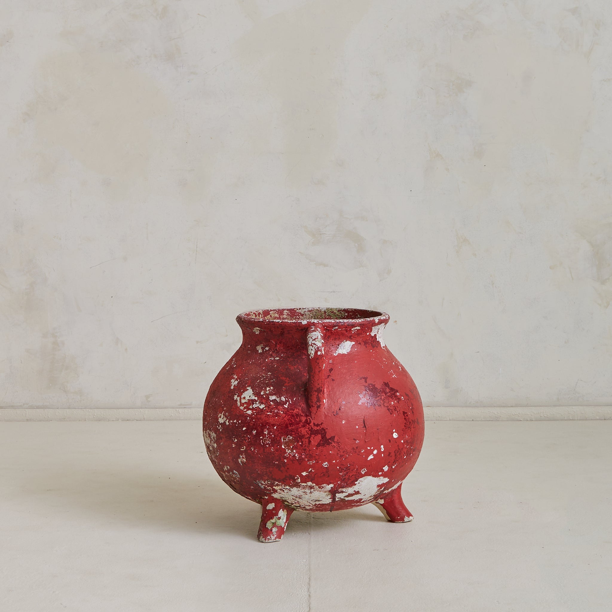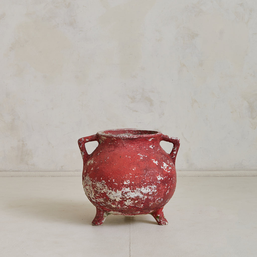 The ‘Marmite’ concrete planter was designed by the renowned Swiss designer Willy Guhl for Eternit AG in the 1950s. This rare design features a distinctive cauldron shape with two handles, supported by three angled feet. It has aged beautifully over time, displaying an original patina that adds character to the red composition. Whether placed indoors or outdoors, this piece serves as both a functional planter and a stunning sculptural element.