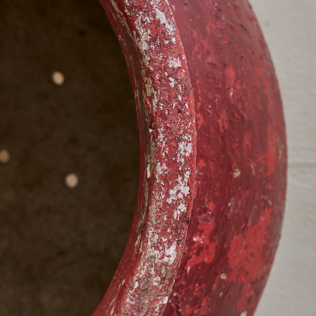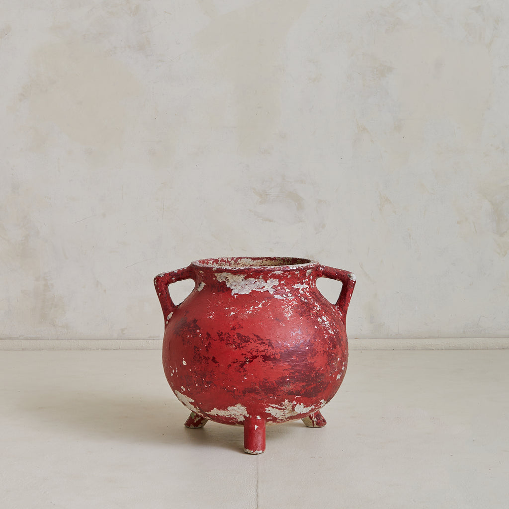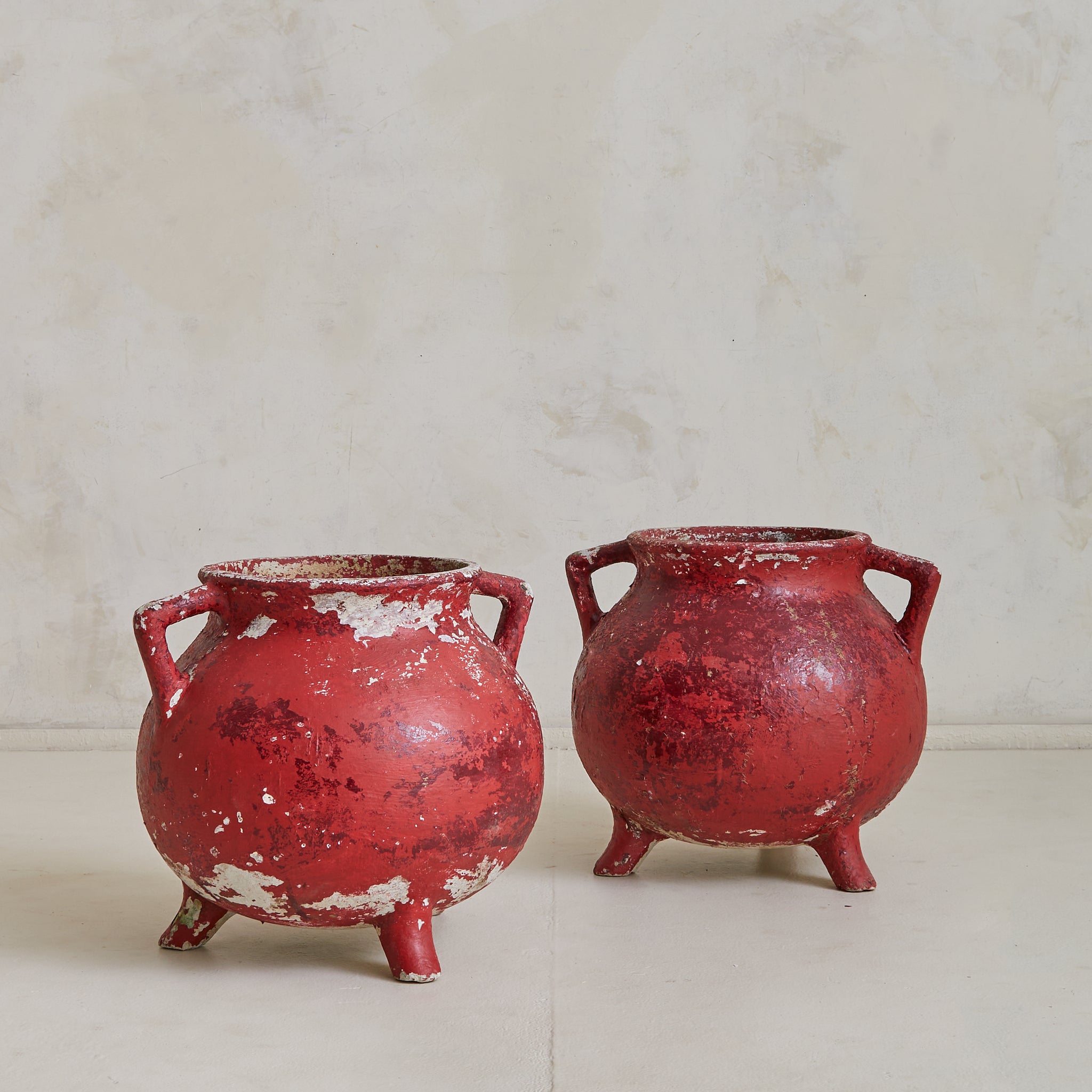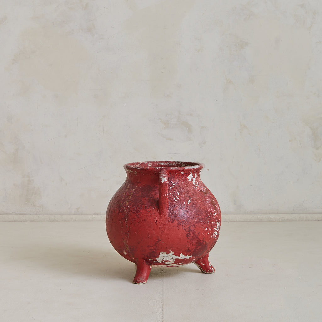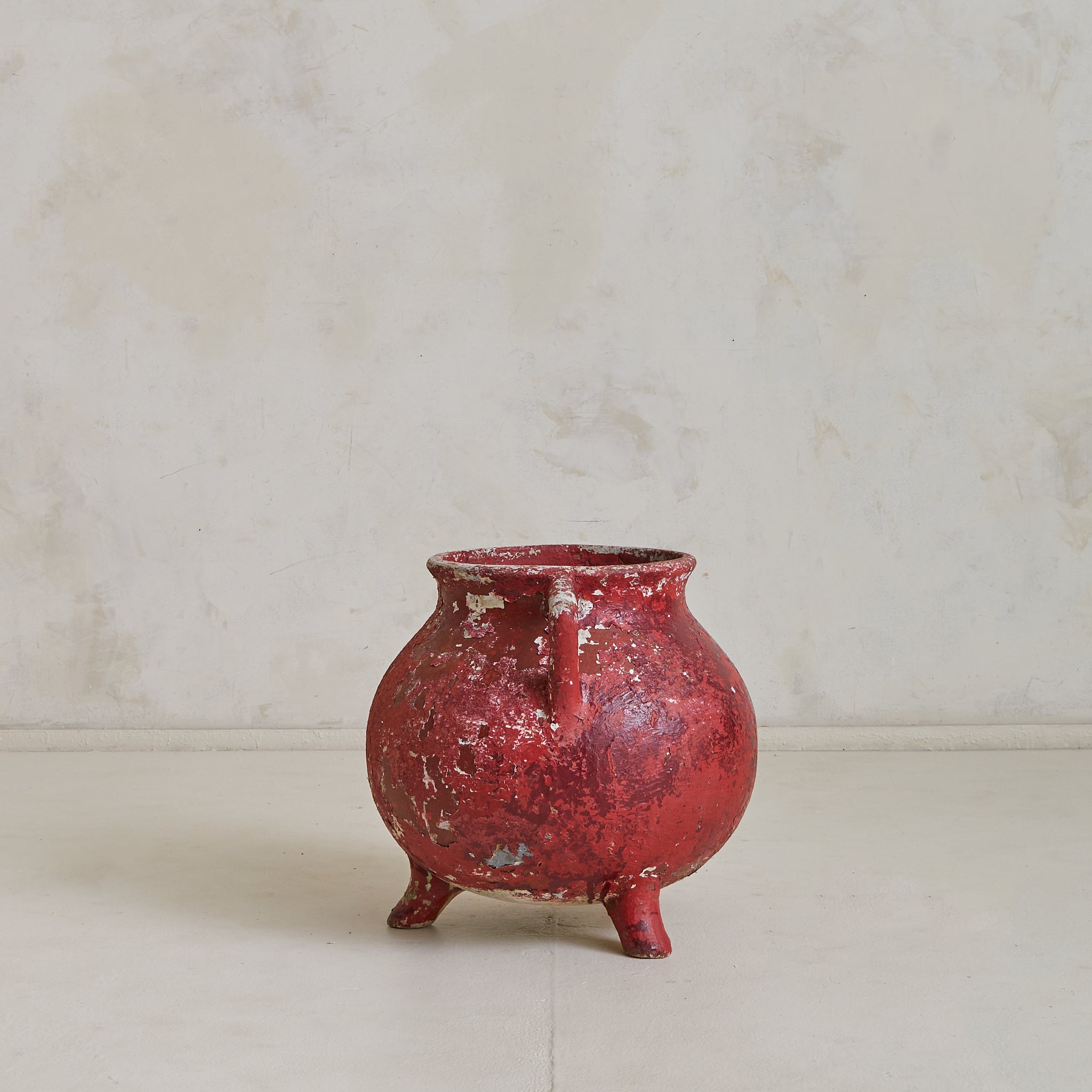 The ‘Marmite’ concrete planter was designed by the renowned Swiss designer Willy Guhl for Eternit AG in the 1950s. This rare design features a distinctive cauldron shape with two handles, supported by three angled feet. It has aged beautifully over time, displaying an original patina that adds character to the red composition. Whether placed indoors or outdoors, this piece serves as both a functional planter and a stunning sculptural element.
