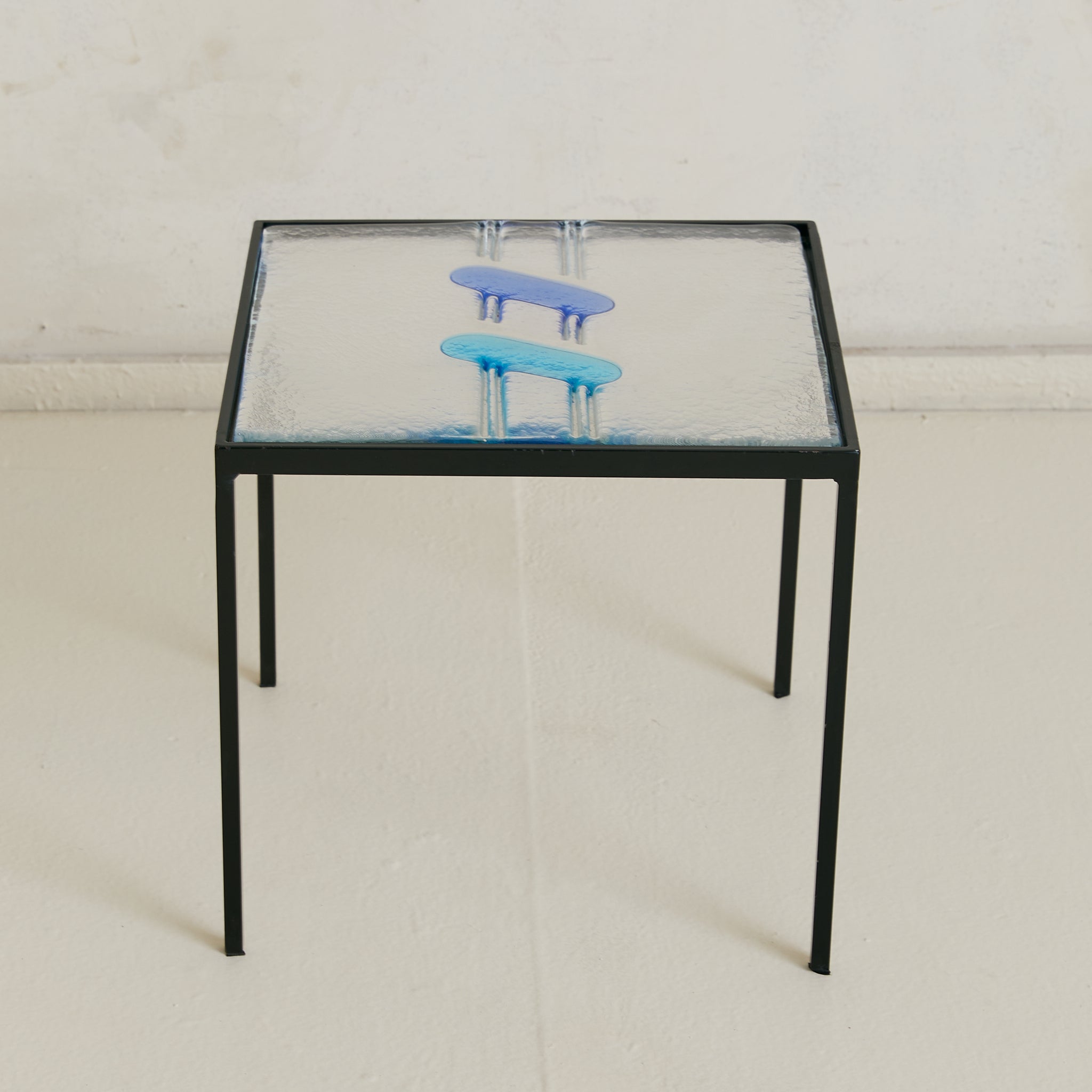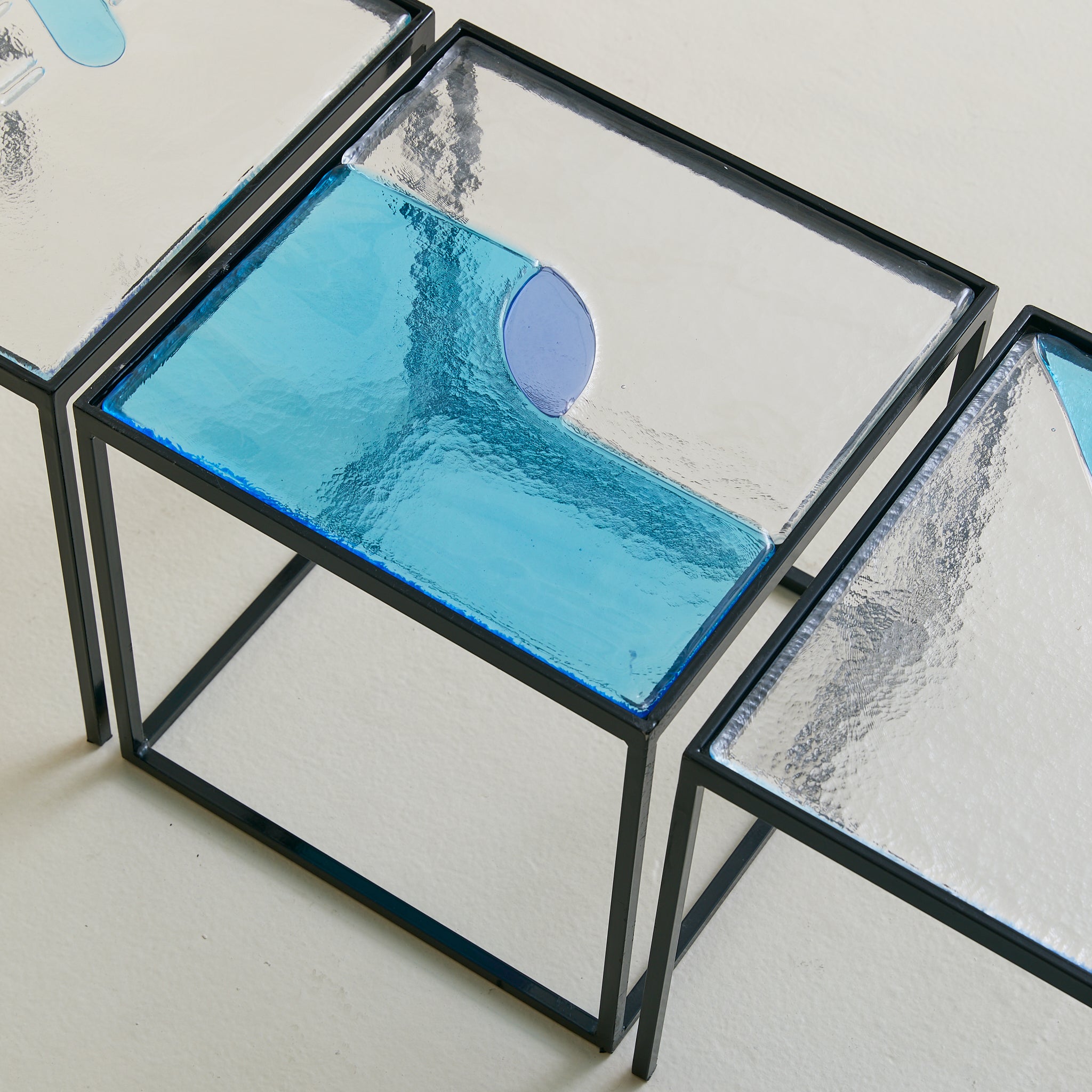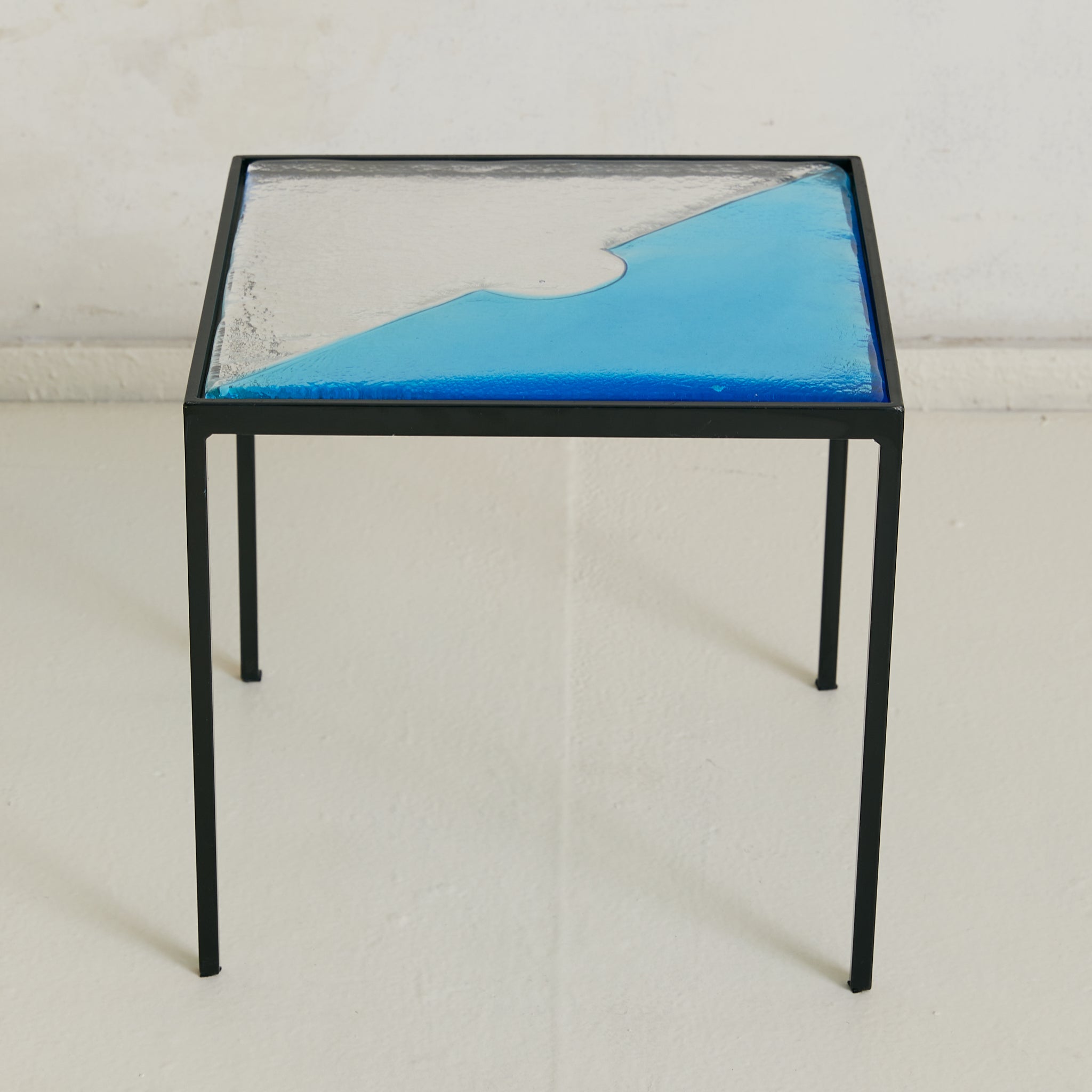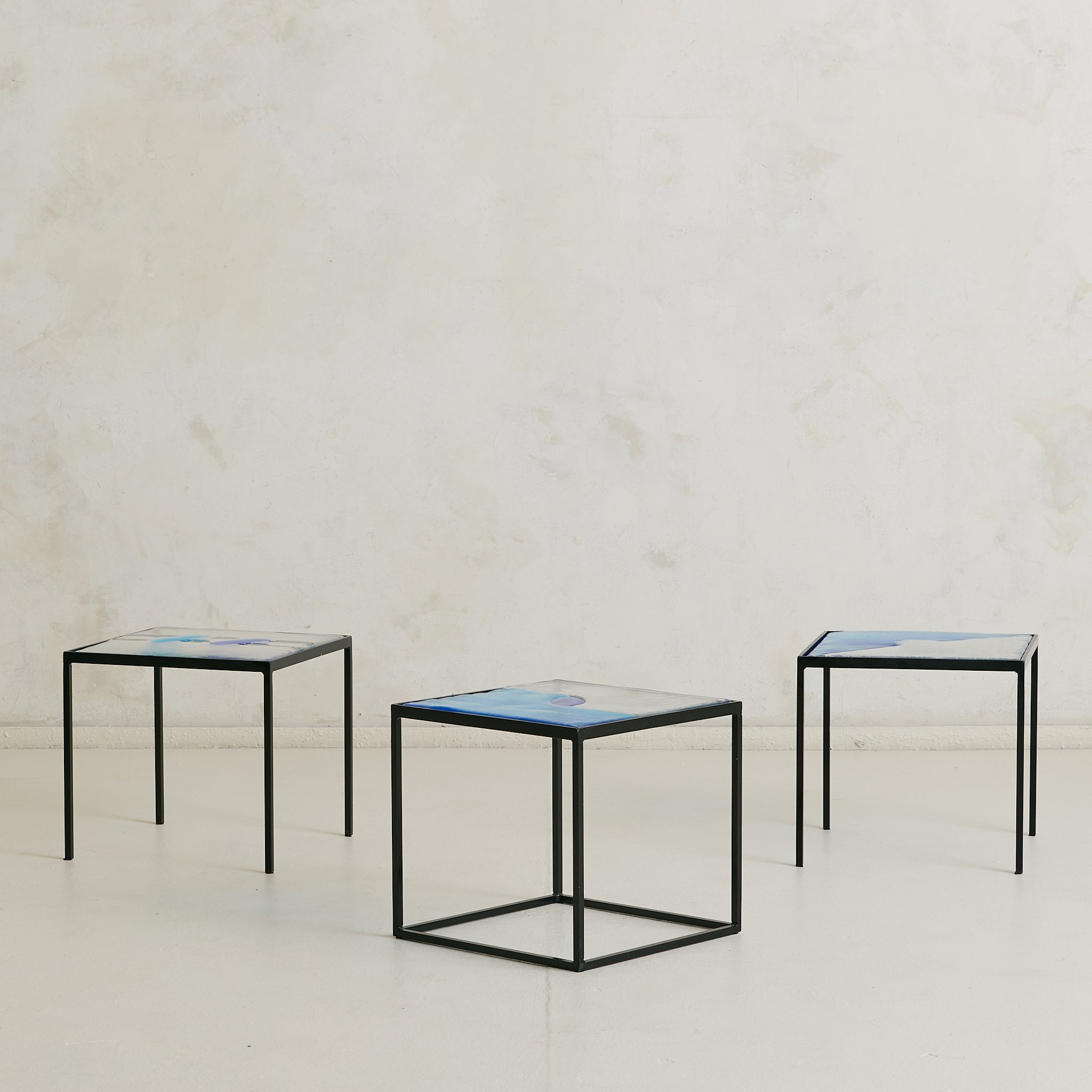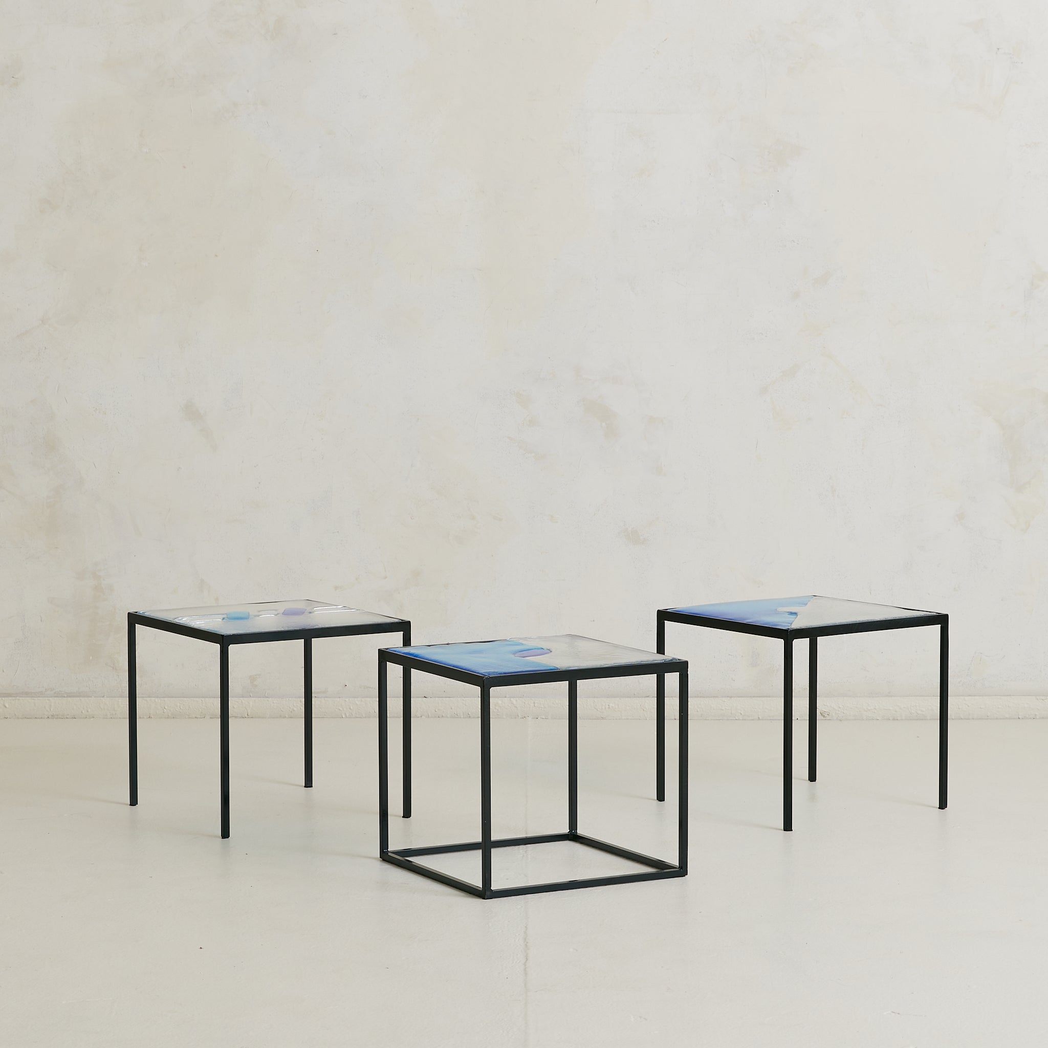 A trio of Italian side tables from the 1960s, each framed in black-coated metal and inset with kiln-formed art glass. The square panels feature abstract compositions of azure and lilac fused into translucent glass. Their surfaces ripple with irregular texture, the embedded color fields softening into the clear ground as though suspended within.
