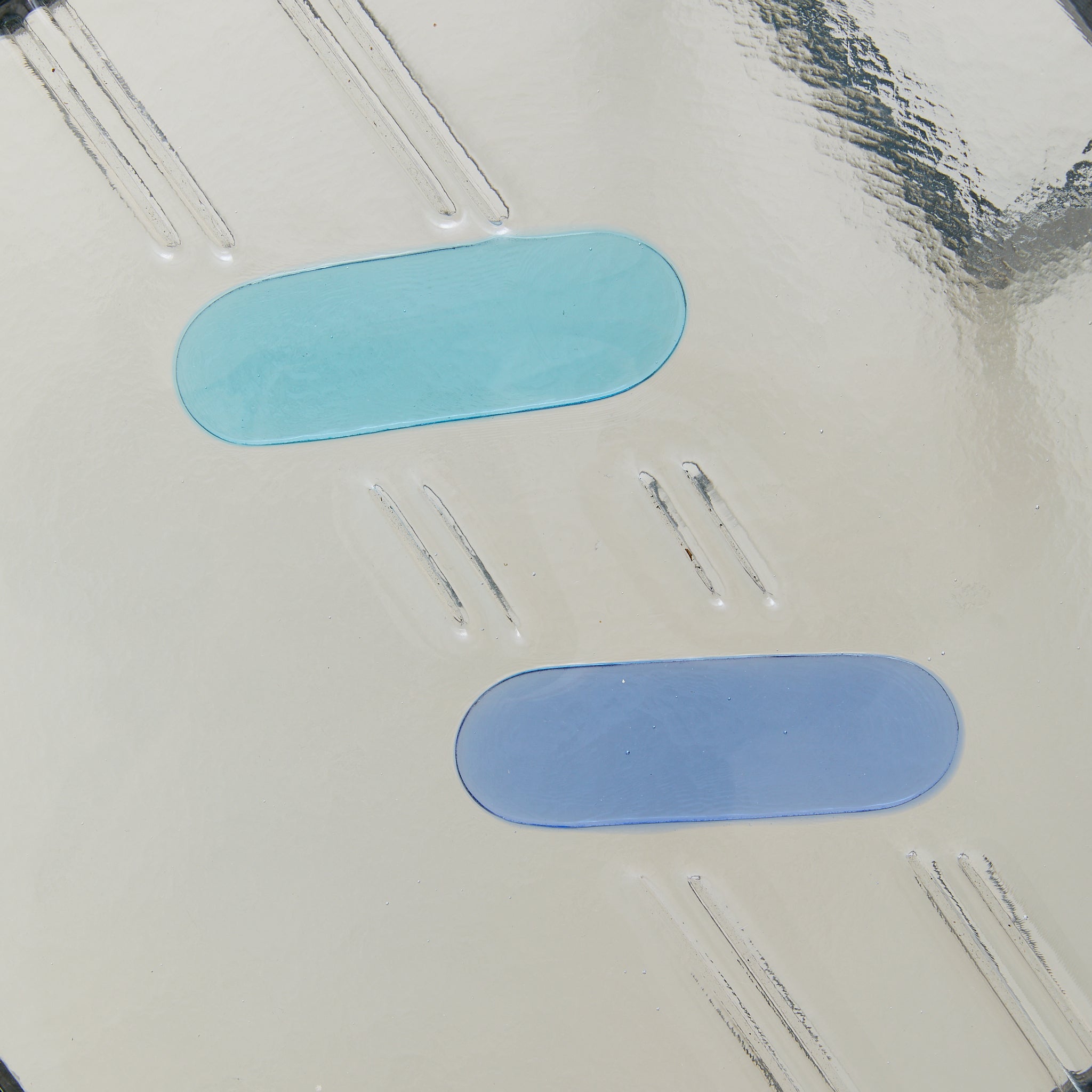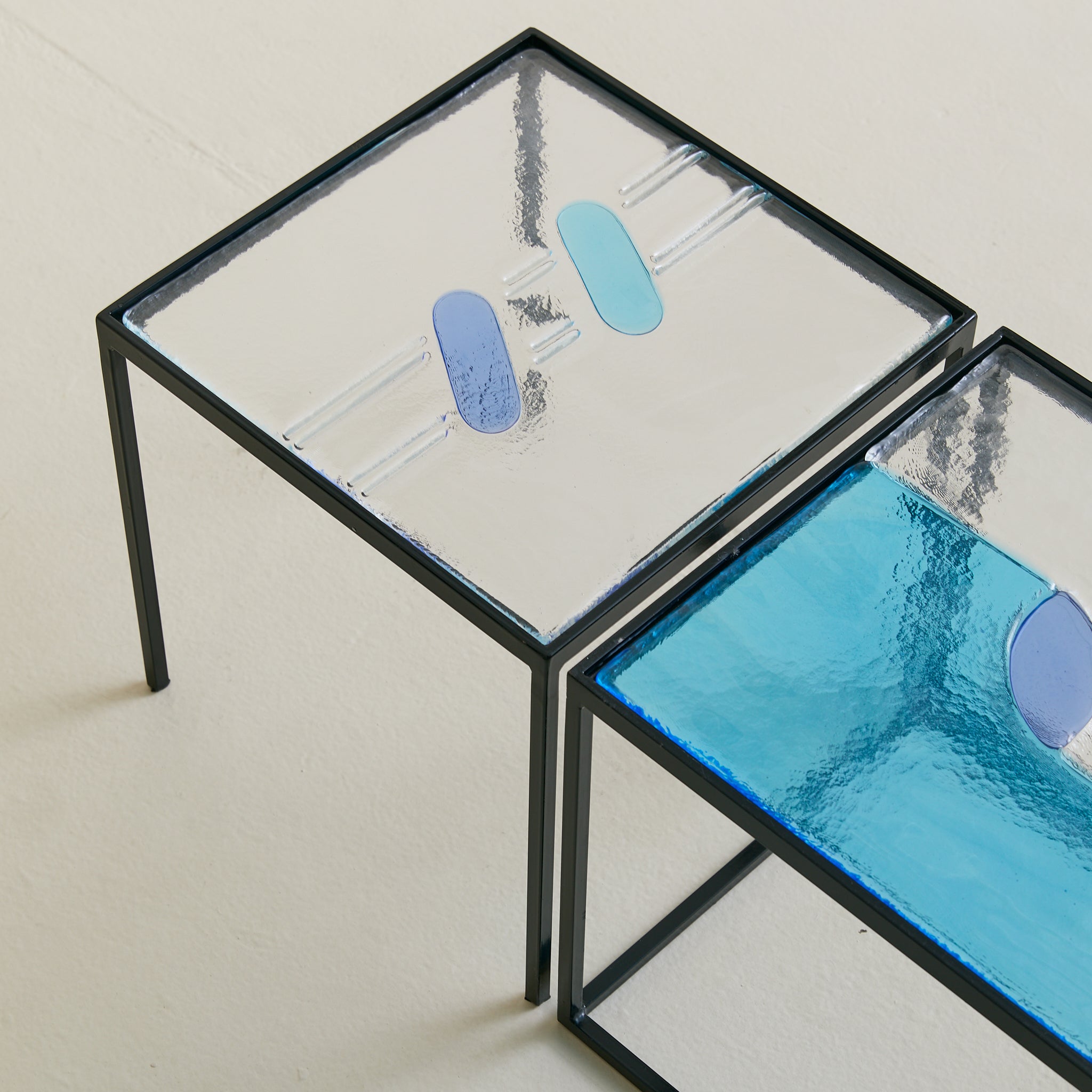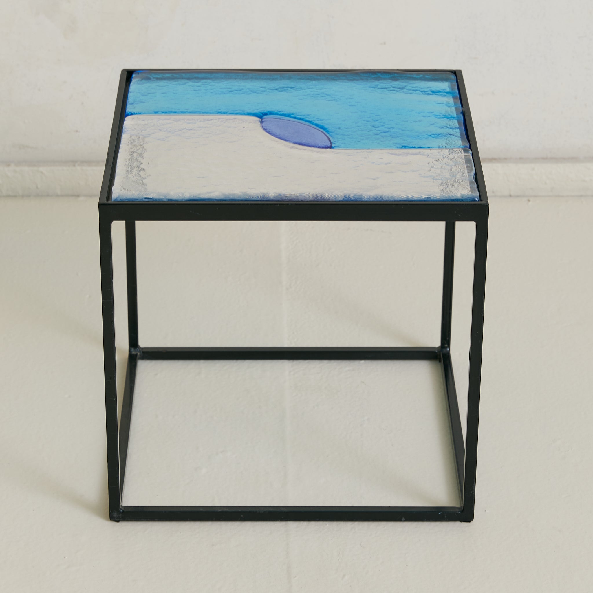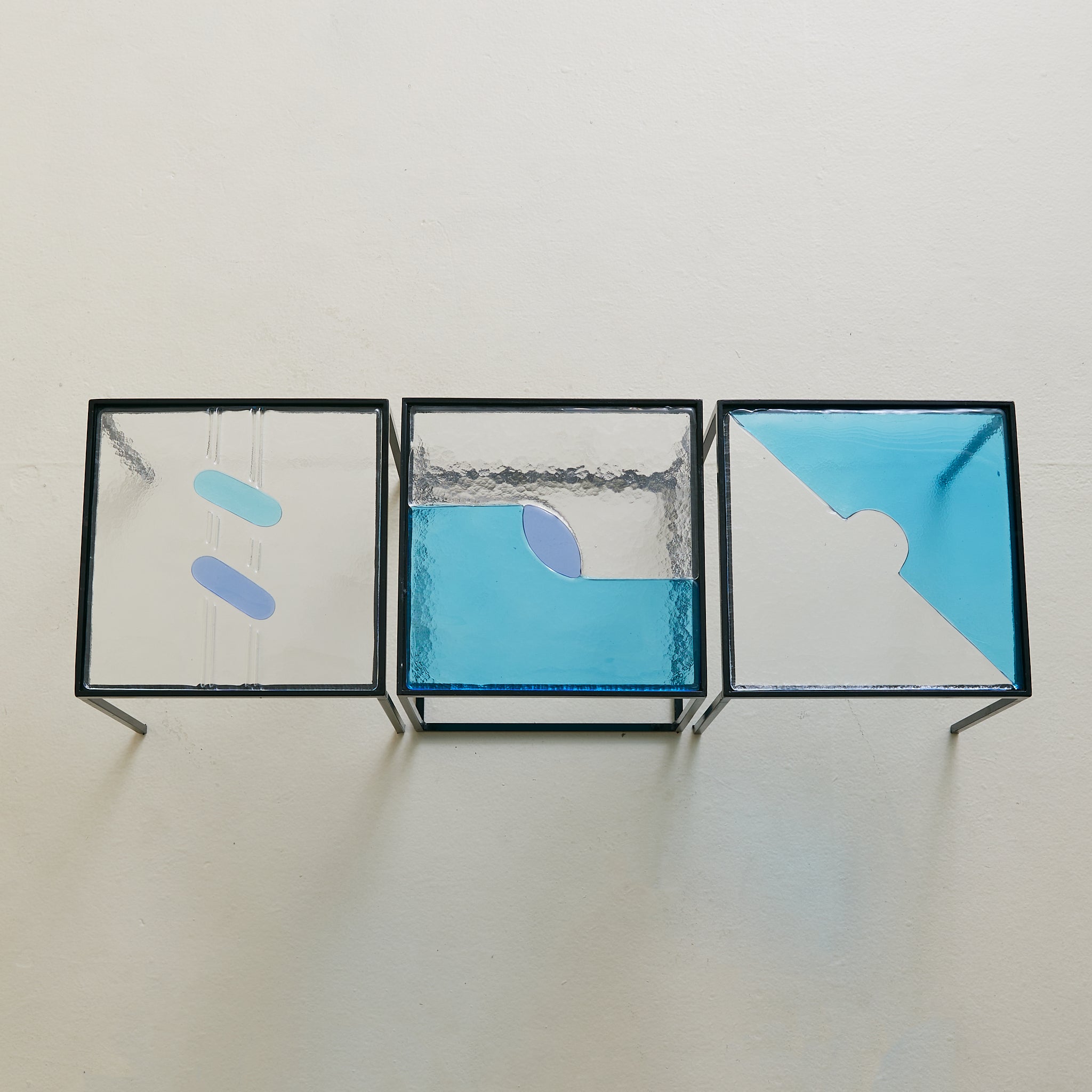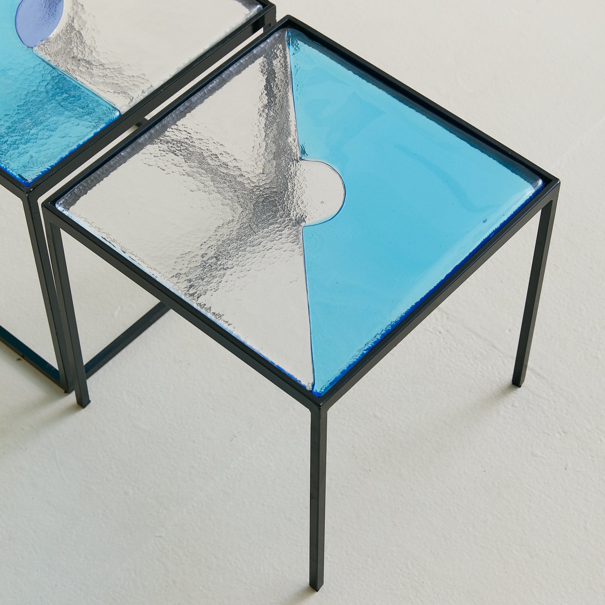 A trio of Italian side tables from the 1960s, each framed in black-coated metal and inset with kiln-formed art glass. The square panels feature abstract compositions of azure and lilac fused into translucent glass. Their surfaces ripple with irregular texture, the embedded color fields softening into the clear ground as though suspended within.