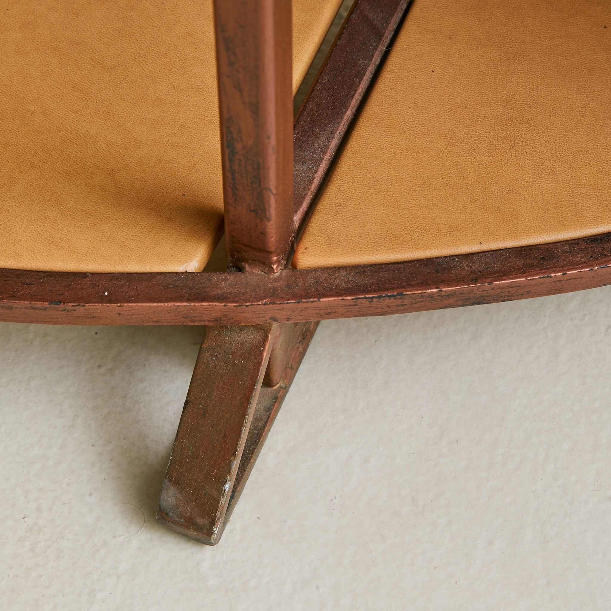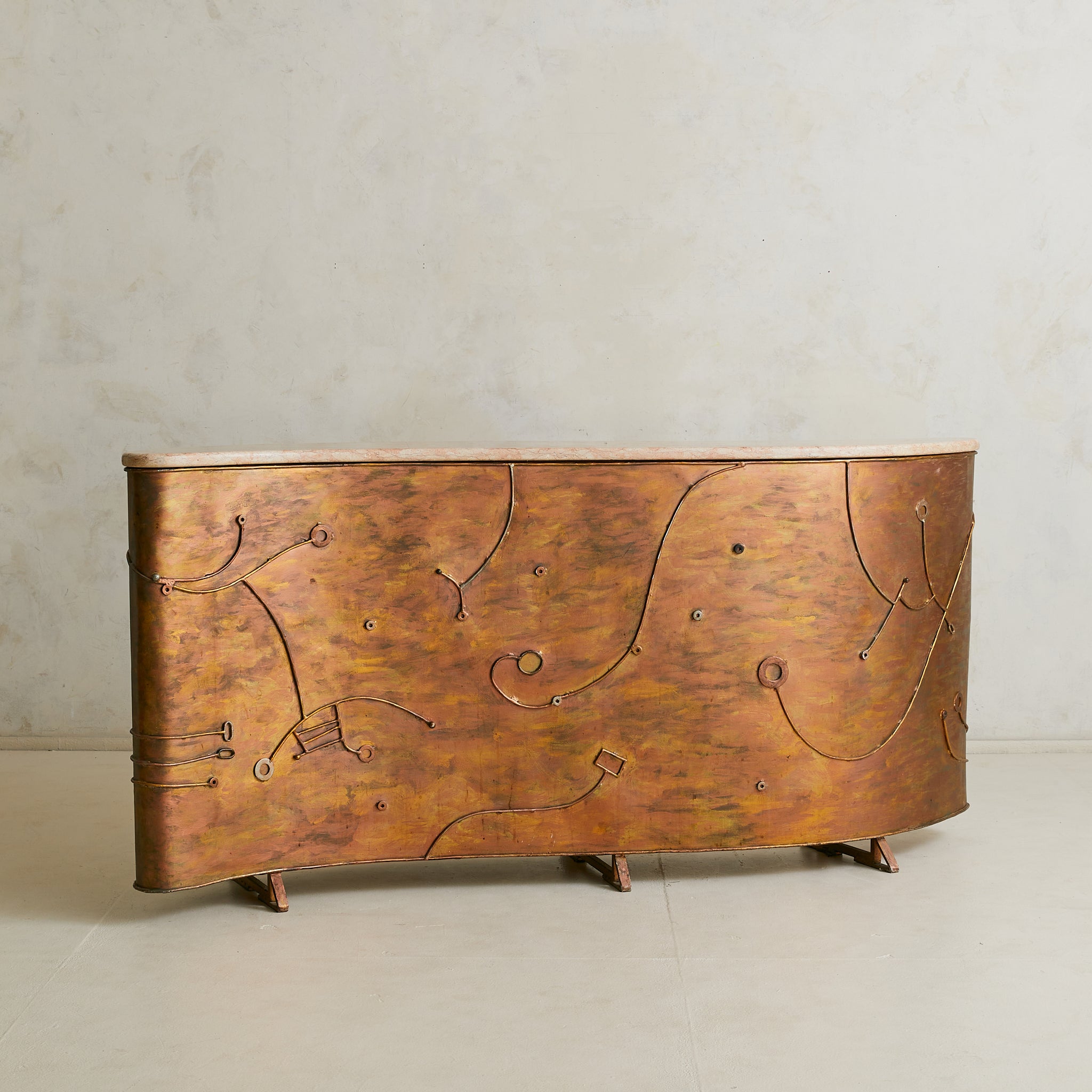 Spanning over seven feet in width, this extraordinary bar cabinet embodies the spirit of postwar Italian design, when furniture was conceived as both functional object and artistic statement. Its sweeping, sinuous frame is clad in hand-worked metal, the surface alive with welded linear motifs that meander like abstract vines across a richly patinated copper-brass finish. Each mark tells of the maker’s hand — a quiet rhythm of gesture translated into metal.