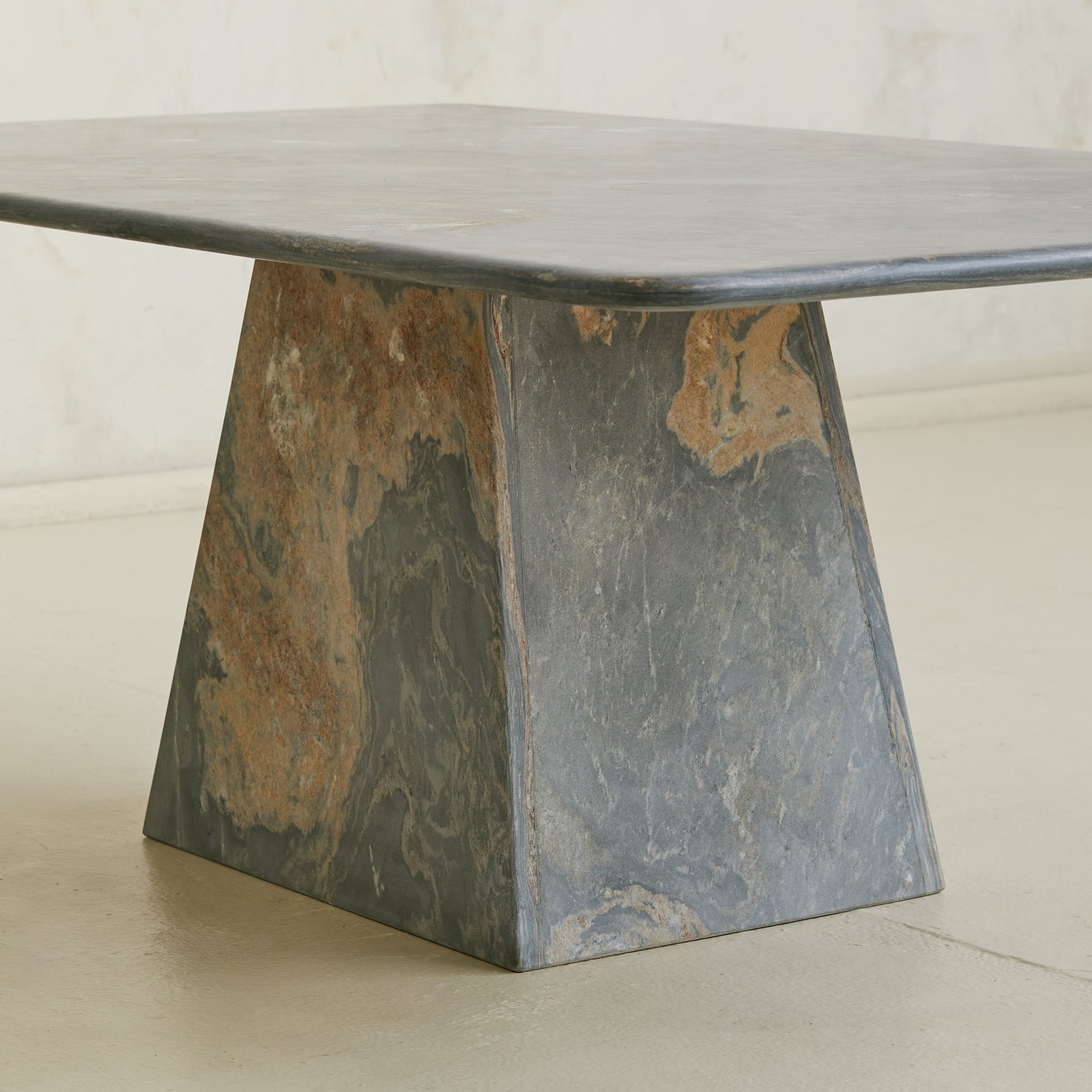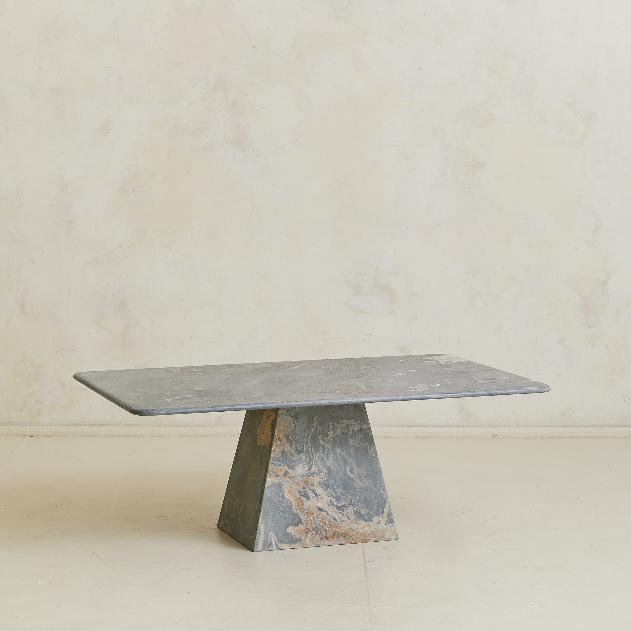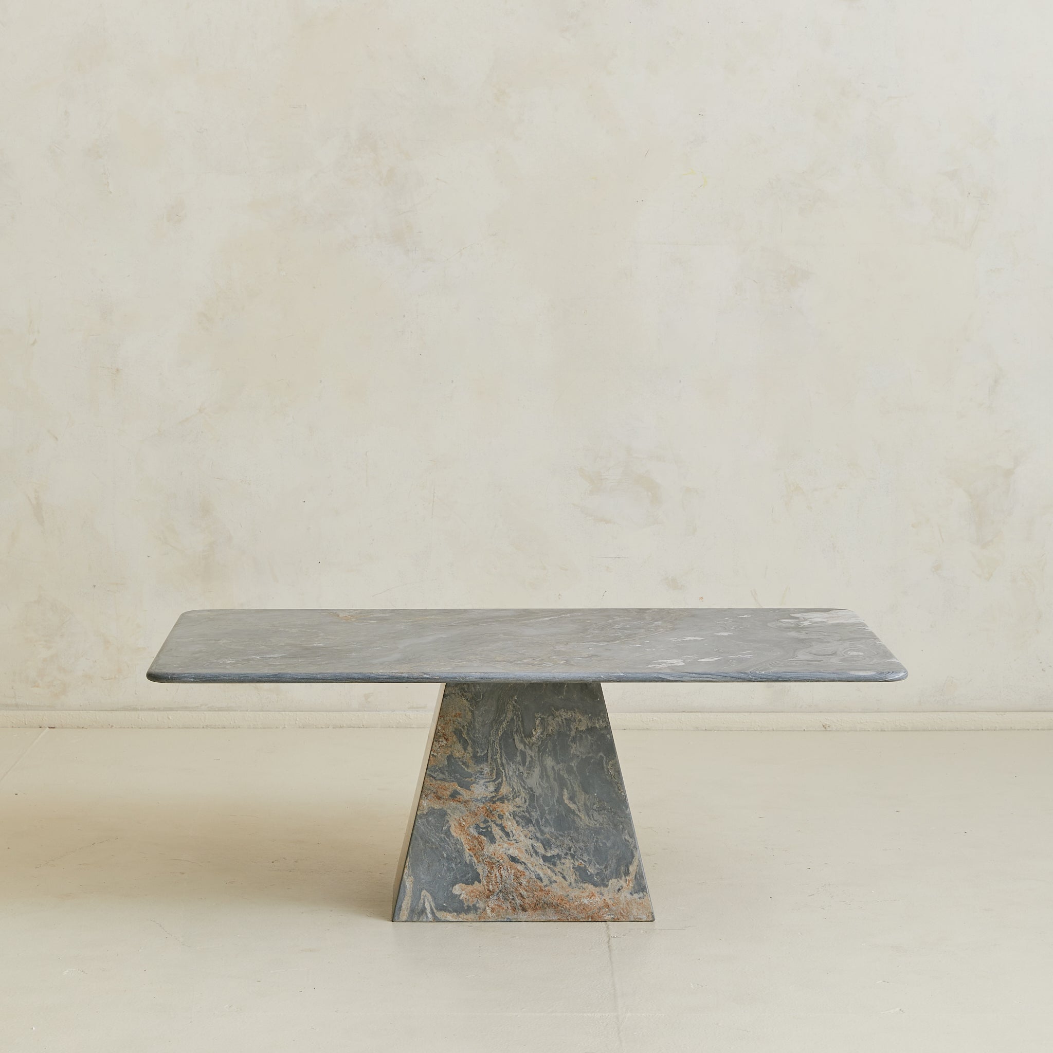 Crafted from richly veined marble, this French coffee table dates to the 1980s. The rectangular top rests on a trapezoidal pedestal base, its geometry softened by a honed finish and rounded corners. Across the surface, swirling veining in slate grey and soft ivory drifts into earthy tones, evoking a painterly landscape in stone.