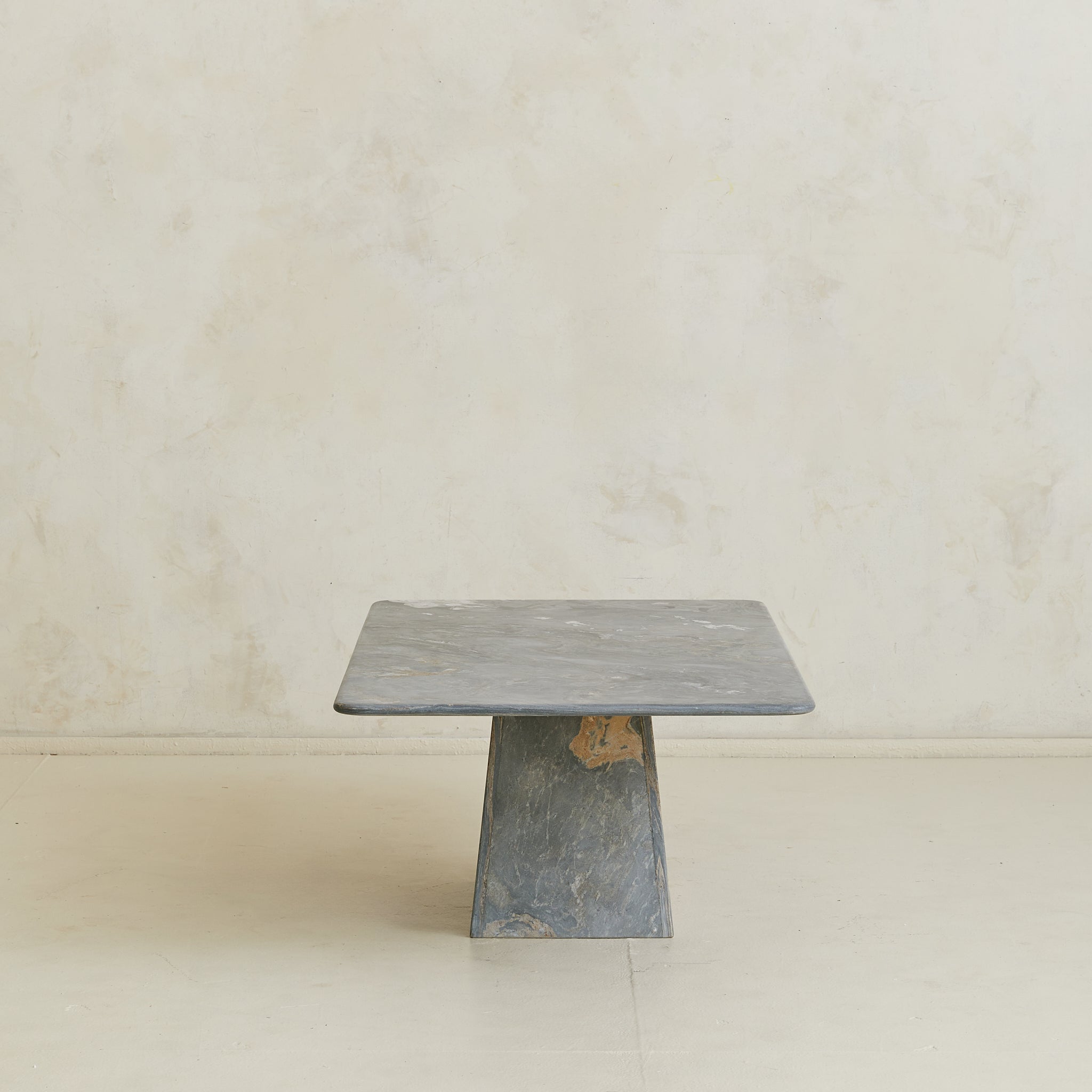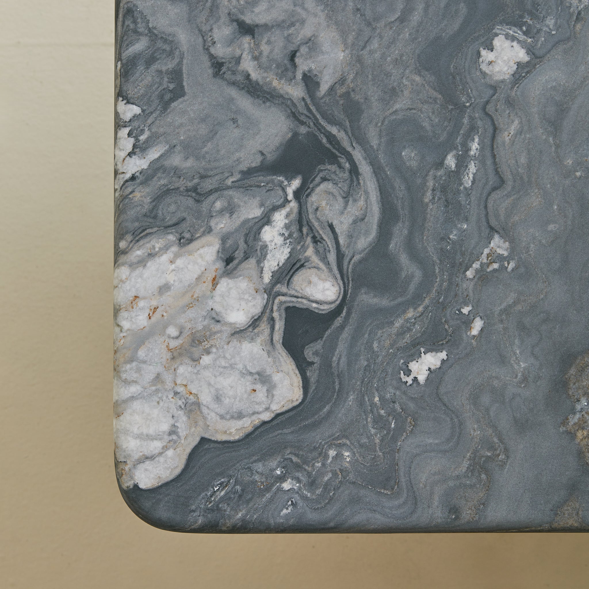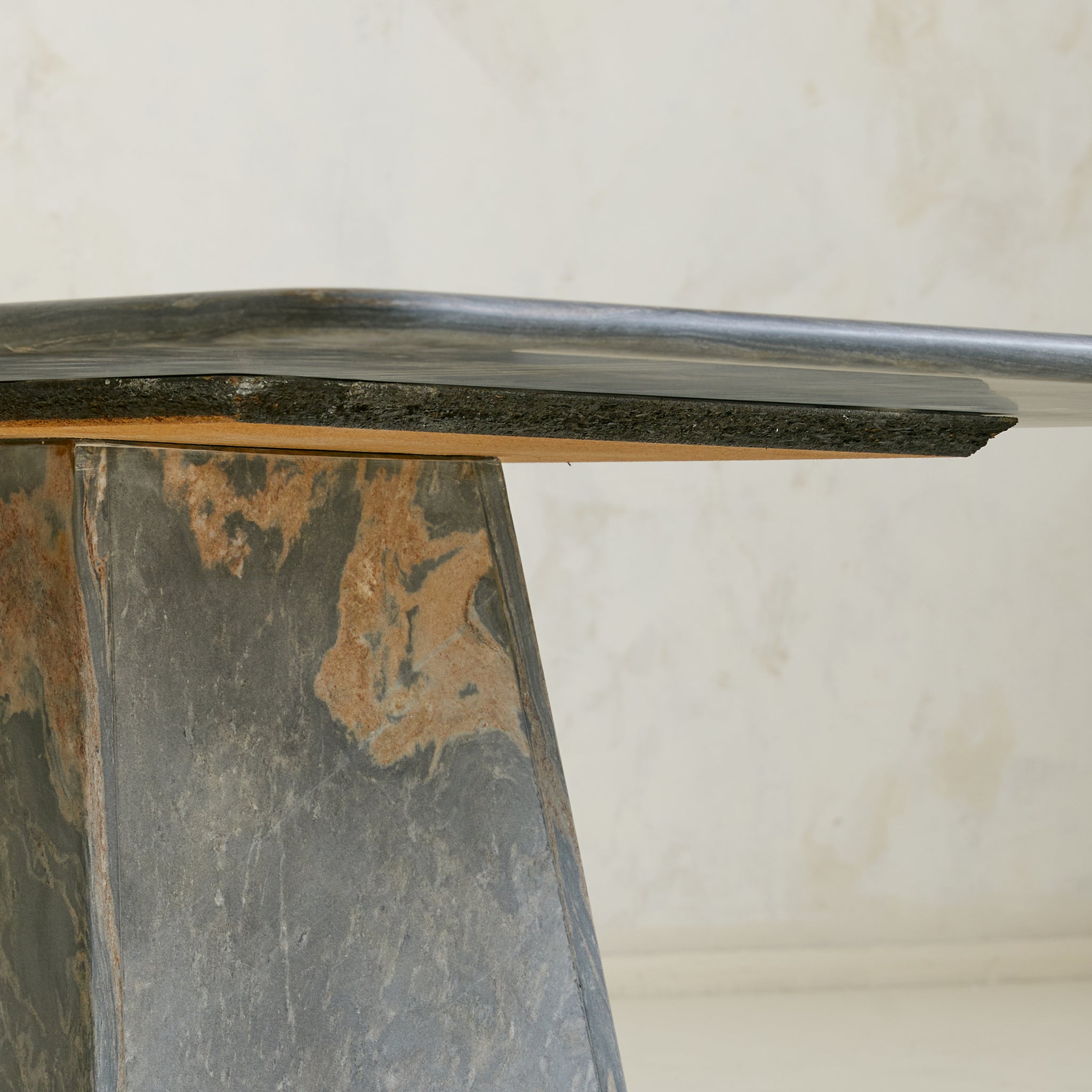 Crafted from richly veined marble, this French coffee table dates to the 1980s. The rectangular top rests on a trapezoidal pedestal base, its geometry softened by a honed finish and rounded corners. Across the surface, swirling veining in slate grey and soft ivory drifts into earthy tones, evoking a painterly landscape in stone.