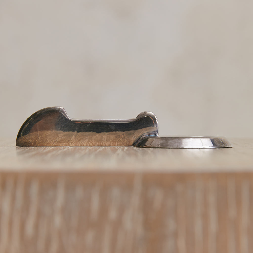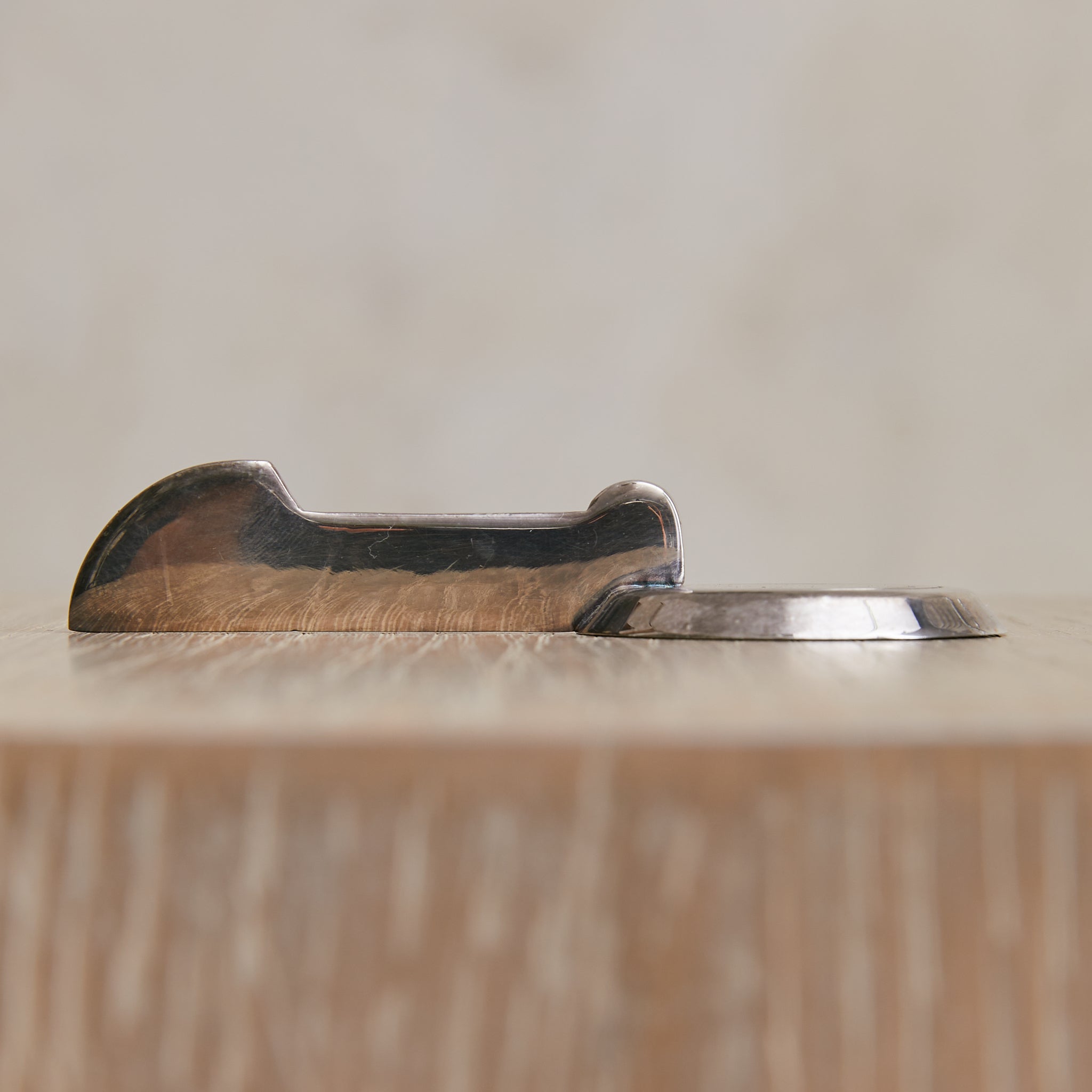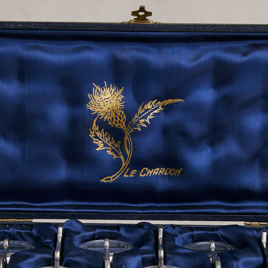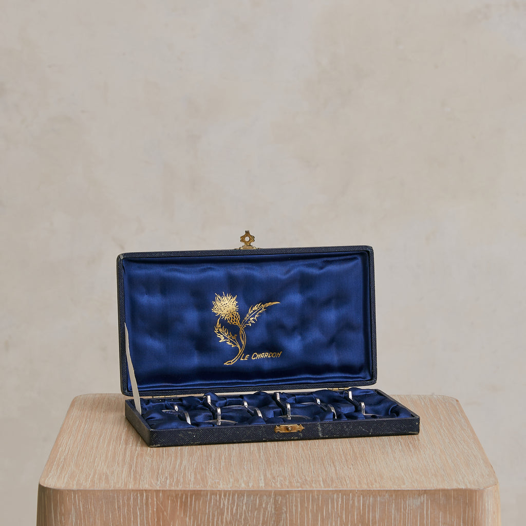 A boxed set of six silver-plated knife rests, sourced in the South of France. Each rest features a rounded, stepped base with an arched support bar—minimal and classically French. Presented in the original Le Chardon case lined in deep sapphire satin.