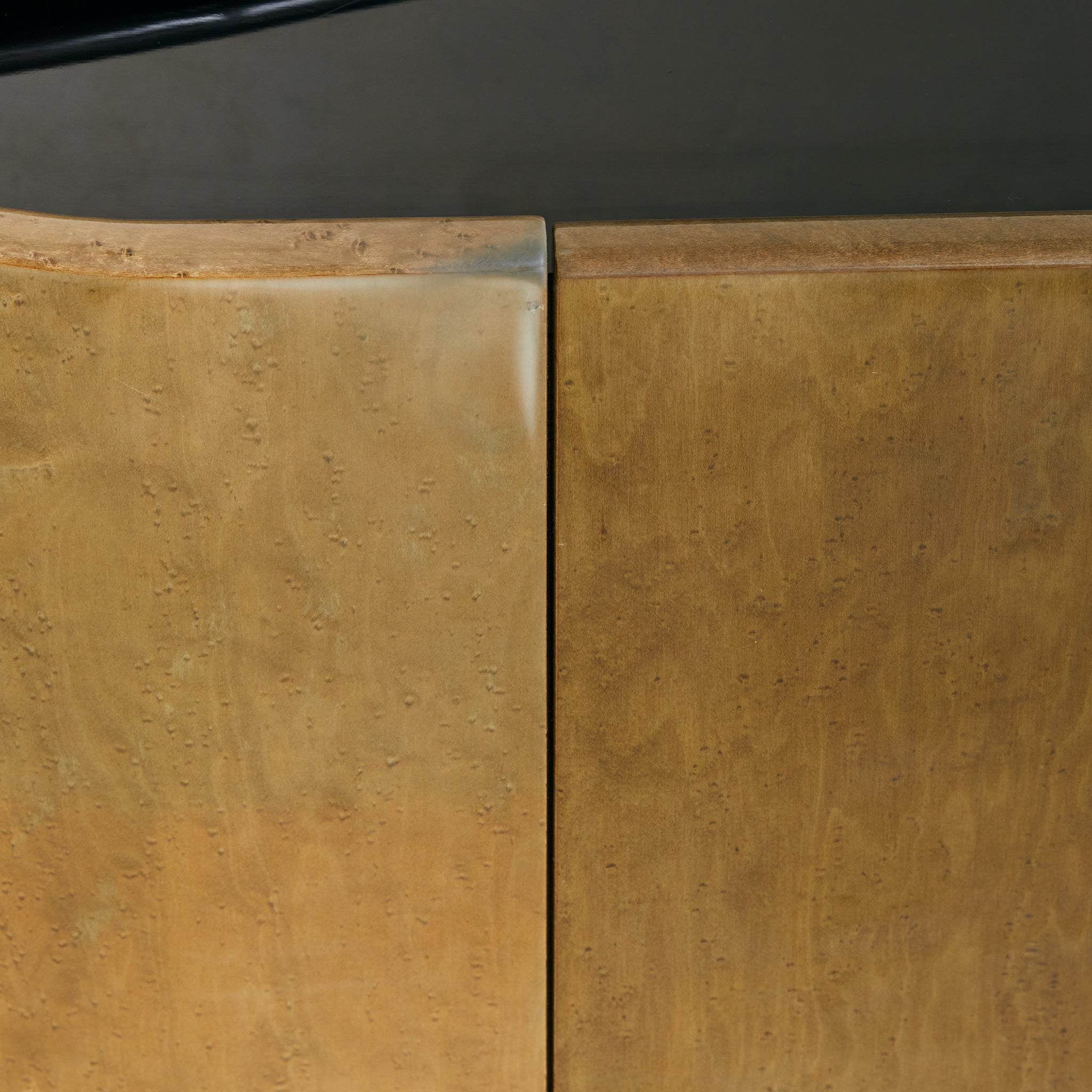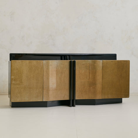 A monumental Italian enfilade credenza, sourced in Parma and dating to the 1980s. Over seven feet wide, the piece is constructed of wood and finished in a high-gloss black lacquer that reflects light across its sharply linear form. The four paneled doors are faced in sepia-hued birdseye maple, their softly undulating profiles and swirling grain adding a sense of movement.