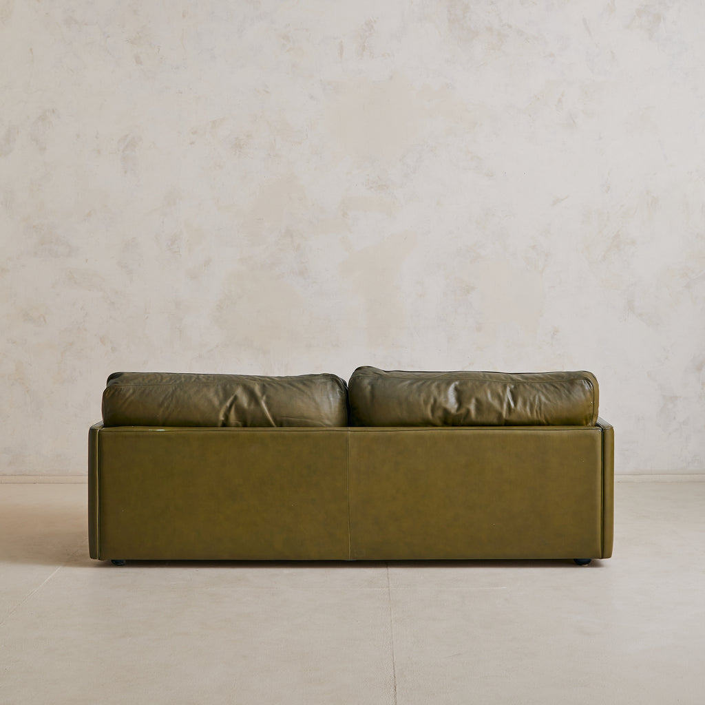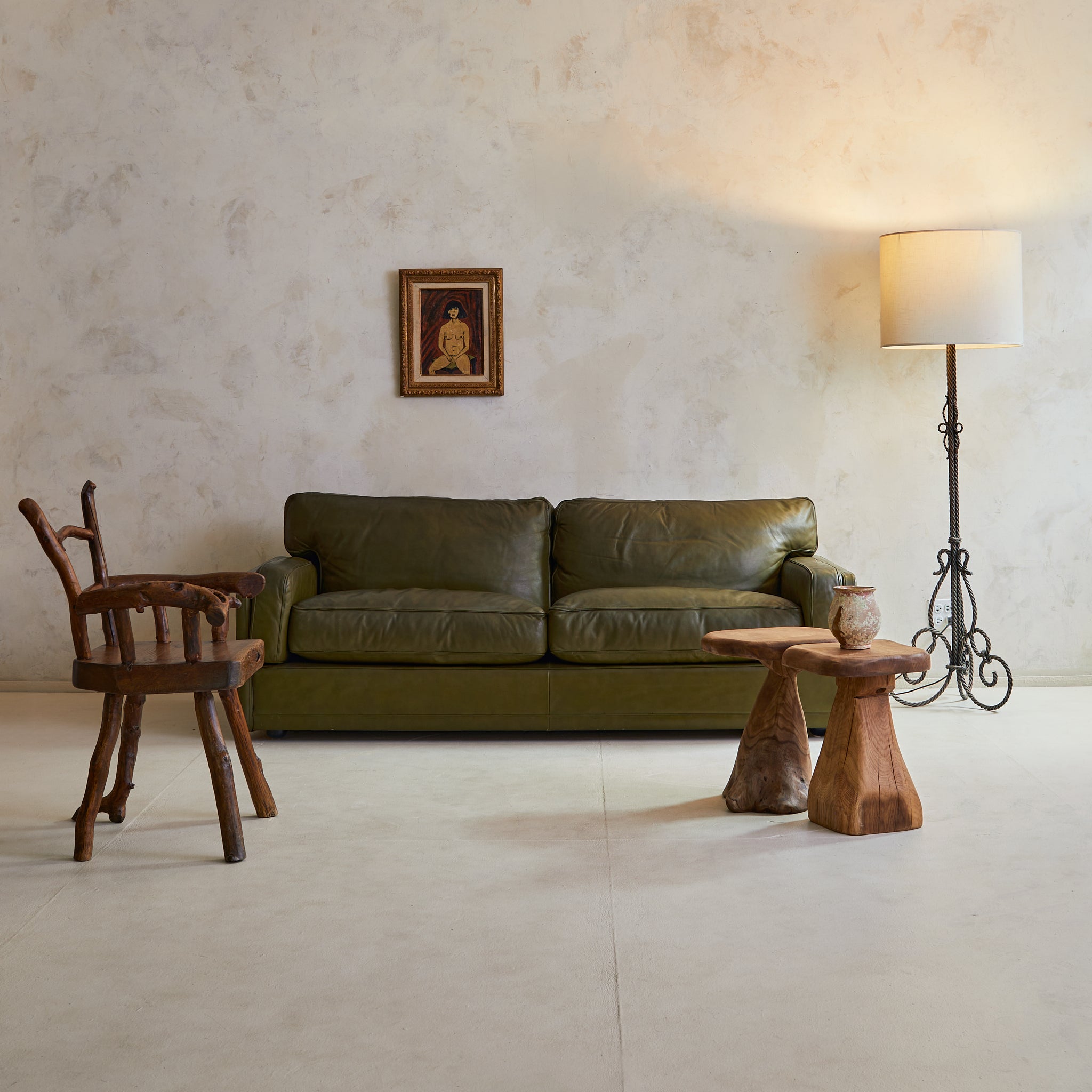 The ‘Socrates’ sofa, designed by Poltrona Frau in the 1980s, is defined by its low-slung, leather-clad silhouette. Upholstered in supple, olive-toned leather, its form is balanced by generously overstuffed, down-filled cushions that invite repose and ease.