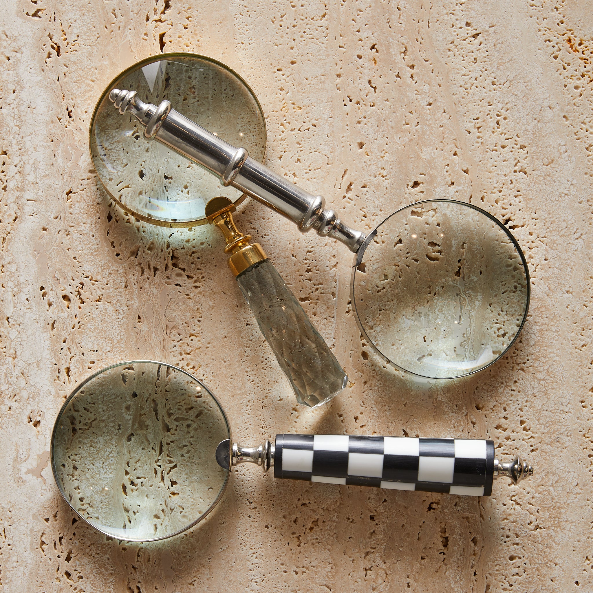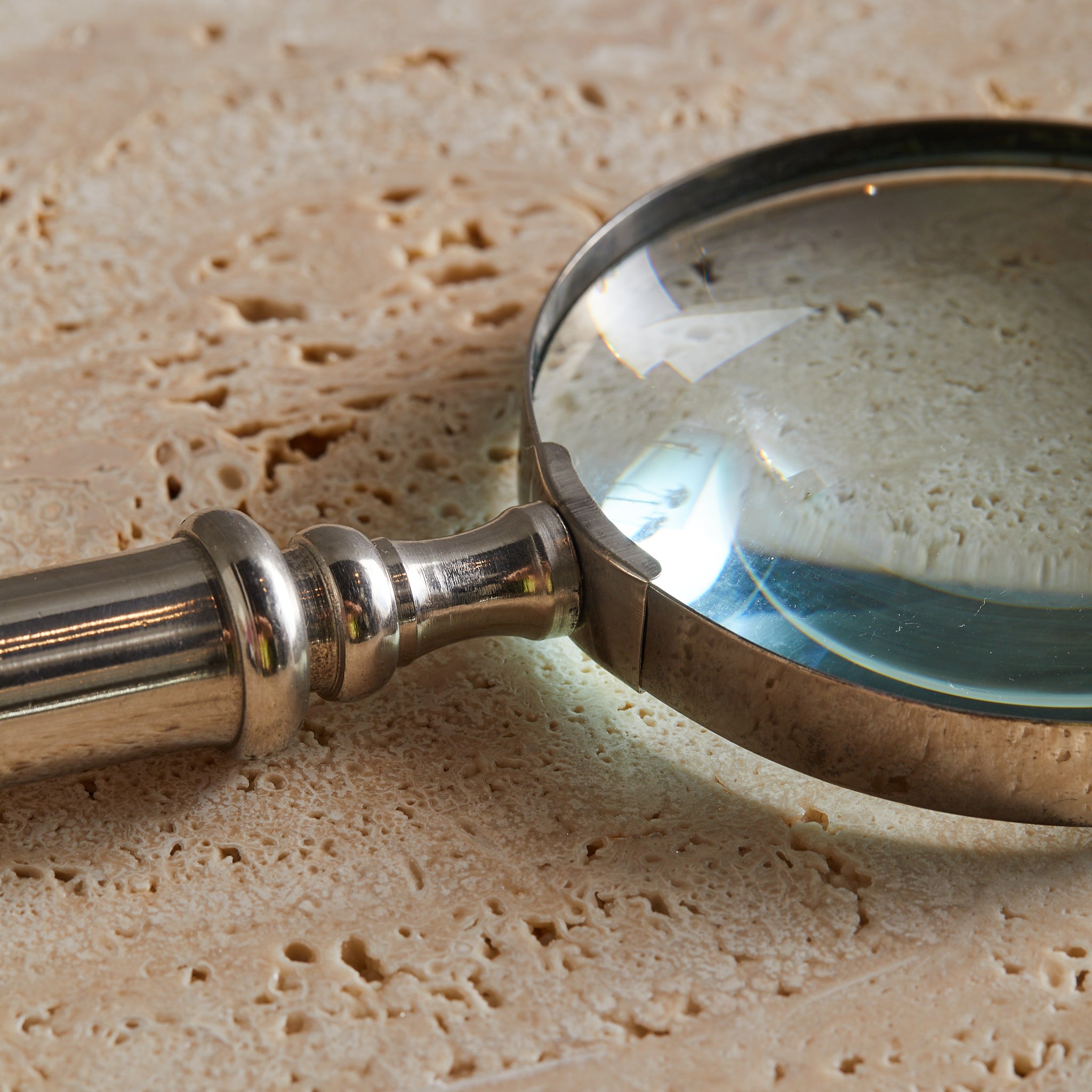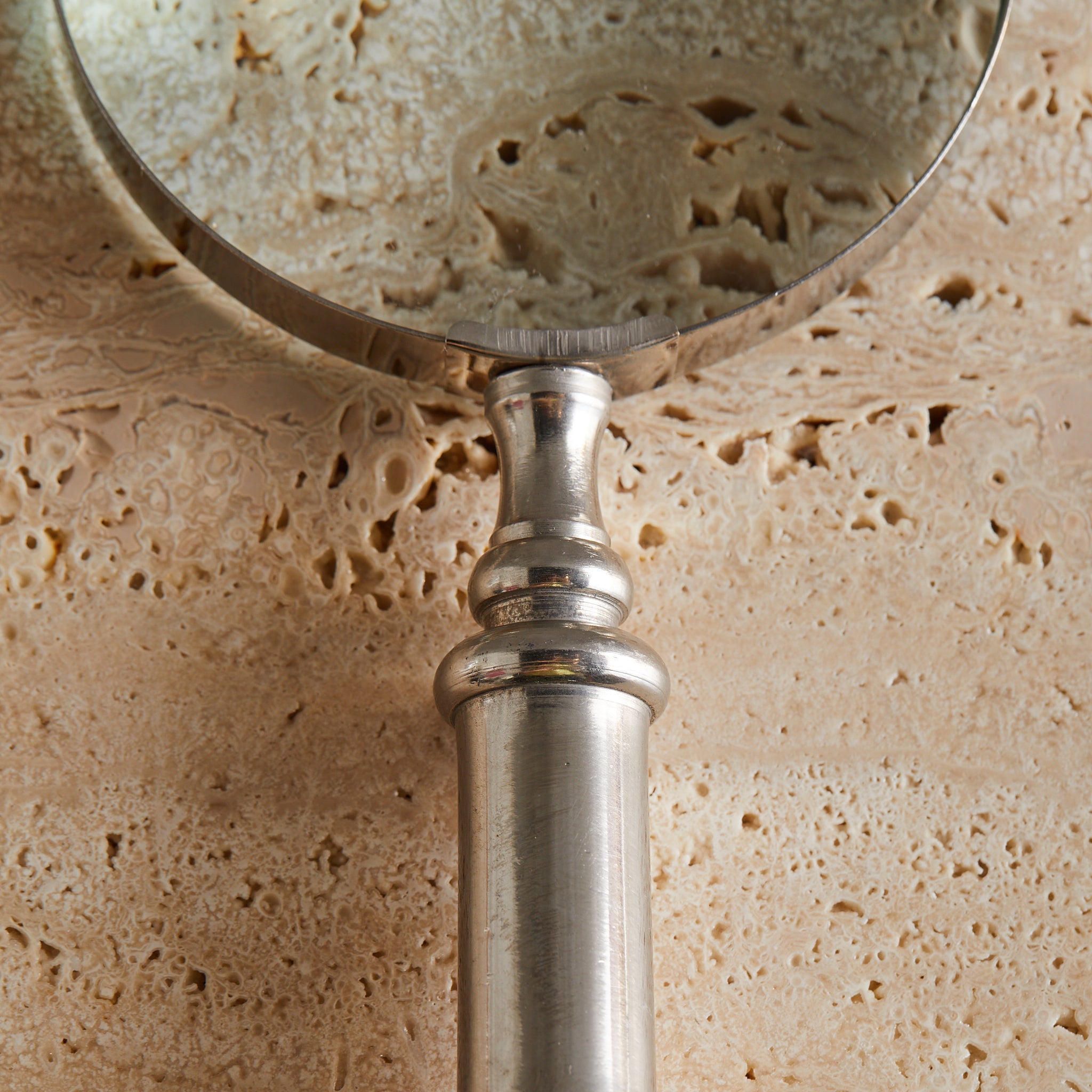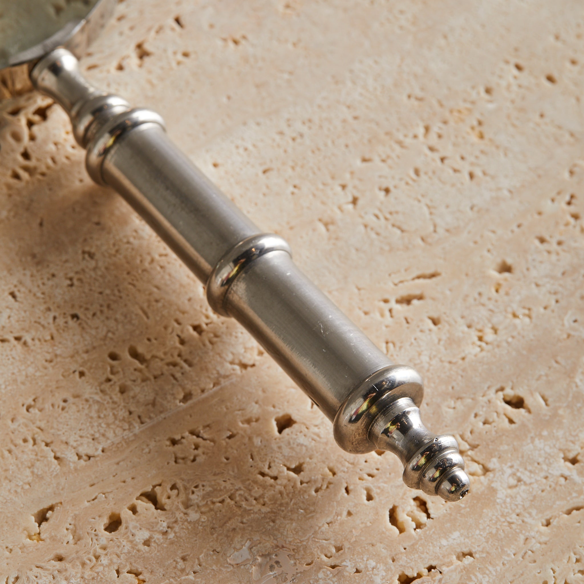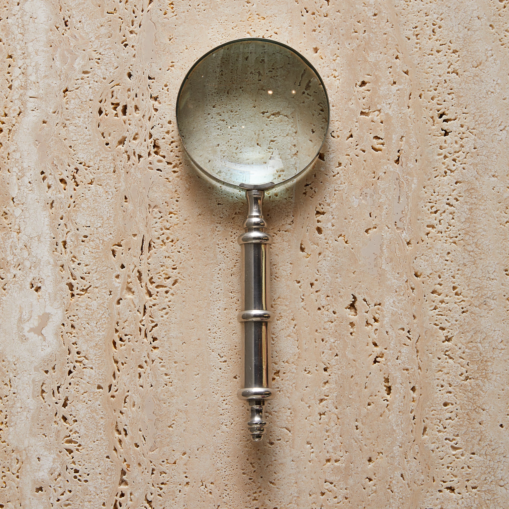 A vintage magnifying glass with a softly patinated metal handle and thick glass lens. The handle features subtle turned detailing and a rounded finial base. Stately and sculptural on a desk or bookshelf.